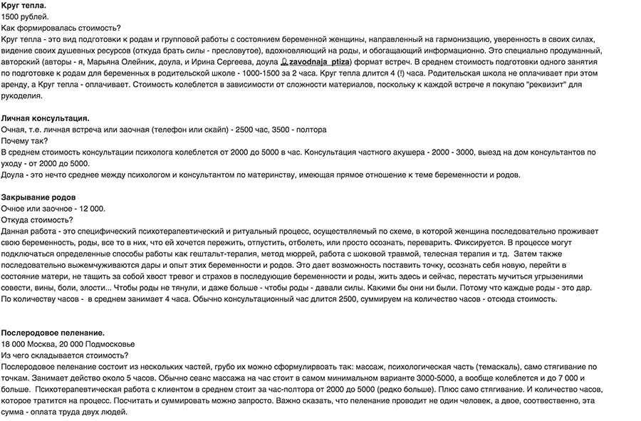 Сами доулы утверждают, что их профессия — это современная трансформация повитух. В основном доулы предлагают три вида услуг — сопровождение беременности, участие в родах и так называемое закрытие родов. А также большое количество вебинаров, семинаров и встреч на темы, связанные с беременностью, родами, кормлениями.