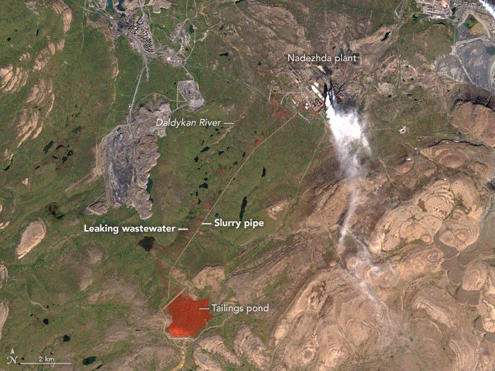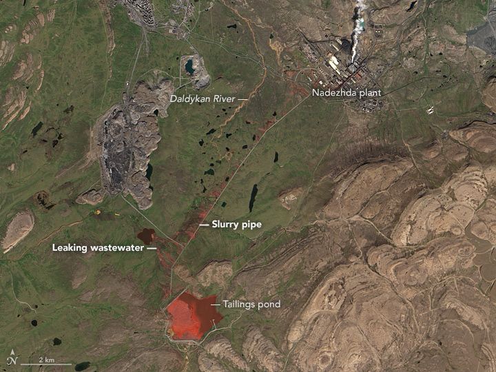 Снимки сделаны в августе 2001 года и в августе 2016 года (скачать файлы в полном размере можно на сайте NASA). На обоих изображениях видны потоки красной жидкости, которые идут от ведущего к хвостохранилищу (на снимках подписано как Tailings pond) трубопровода. Река Далдыкан, как поясняют в NASA, проходит под трубой.