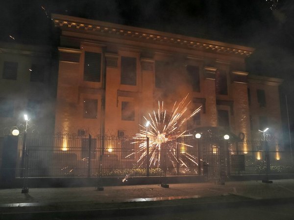 Минувшей ночью около 20 молодых людей устроили пикет у диппредставительства и обстреляли здание из салютной установки.