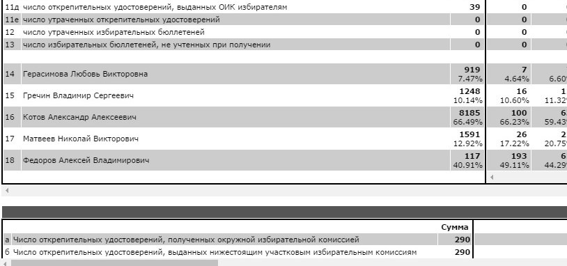 В Псковской области в округе № 19 кандидаты в Псковское областное Собрание депутатов в сумме набрали более 137% голосов, свидетельствуют данные ЦИК. «Яблочница» Любовь Герасимова набрала 7,47% голосов, «жириновец» Владимир Гречин — 10,14%, единоросс Александр Котов — 66,49%, коммунист Николай Матвеев — 12,92%.