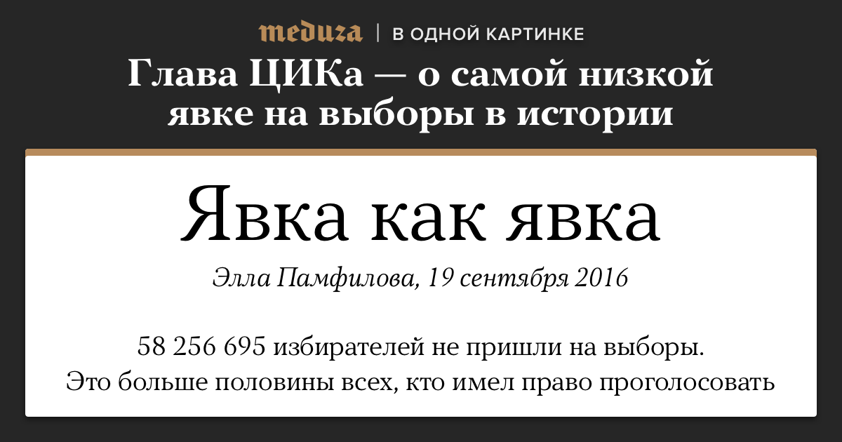 Фото в анонсе: Сергей Фадеичев / ТАСС / Scanpix / LETA Про итоги выборов можно почитать здесь. Явка для картинки взята по данным на 10:00 — 47,81 процента. Число избирателей — на июль 2016 года с сайта ЦИК.