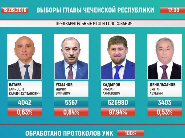 Избирательная комиссия Чечни обнародовала окончательные данные по результатам выборов главы республики. Победу одержал нынешний руководитель региона Рамзан Кадыров. За него проголосовали 97,94% из тех, кто пришел на участки или 626 980 человек.