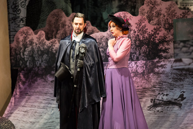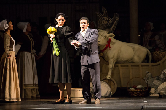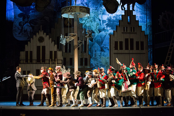 © Новая Опера Сценография спектакля, автор которой — еще одна молодая дама Этель Иошпа, — его отдельная ценность. При открытии занавеса после первого антракта зал, как в старые добрые времена, даже встречает картинку аплодисментами. На сцене — сад у дома Маргариты, гнутые мостики через ручей, замок вдалеке. При этом вся эта красота не настаивает ни на своей иллюзорной всамделишности, как в прежнем театре, ни на продвинутой технологичности, как в нынешнем. Напротив — подчеркивается ее рукотворность, самодельность. Деревья будто вырезаны ножницами из бумаги, яркие бравые солдатики, с которыми неосмотрительно уходит на войну брат Маргариты, будто вынуты из коробки с детскими эко-игрушками (тут потрудилась и художница по костюмам Светлана Грищенкова); крутящиеся карусели, прялки, колеса винтажного кинопроектора и велосипеда (дополнительная сквозная визуальная тема спектакля) — этакий hand-made с воскресного рынка в саду «Эрмитаж», окружающем «Новую оперу»; шикарные черные крылья, поднимающиеся за спиной Мефистофеля на веревочках в момент соблазнения Фаустом Маргариты, хочется погладить, как пузо кота.