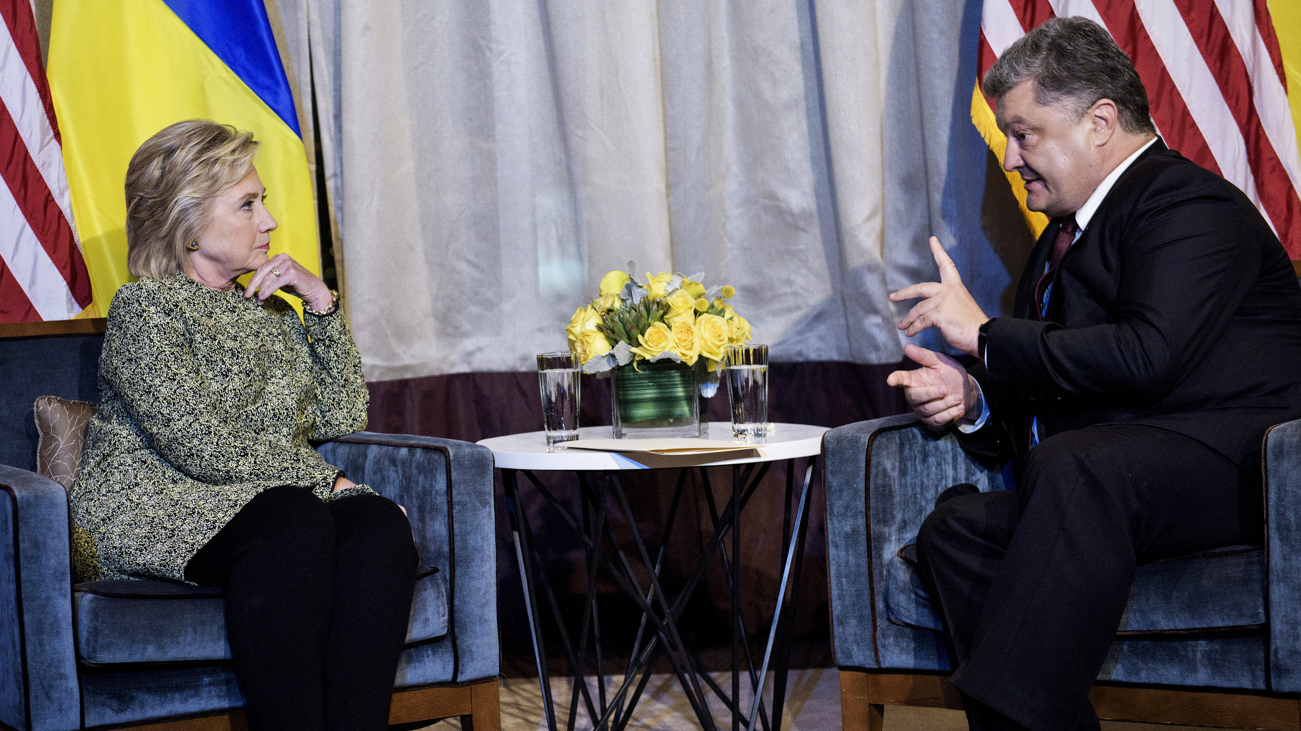 Клинтон кратко встретилась с премьер-министром Японии Синдзо Абэ, президентом Египта Абдель Фаттахом ас-Сиси и президентом Украины Петром Порошенко. Клинтон и Порошенко обсудили российское вторжение на территорию Украины. Клинтон начала встречу, отметив, что перед Украиной стоят "очень реальные проблемы и угрозы в виде российской агрессии" и что ей хотелось бы знать, каким образом США могут оказать поддержку Украине.