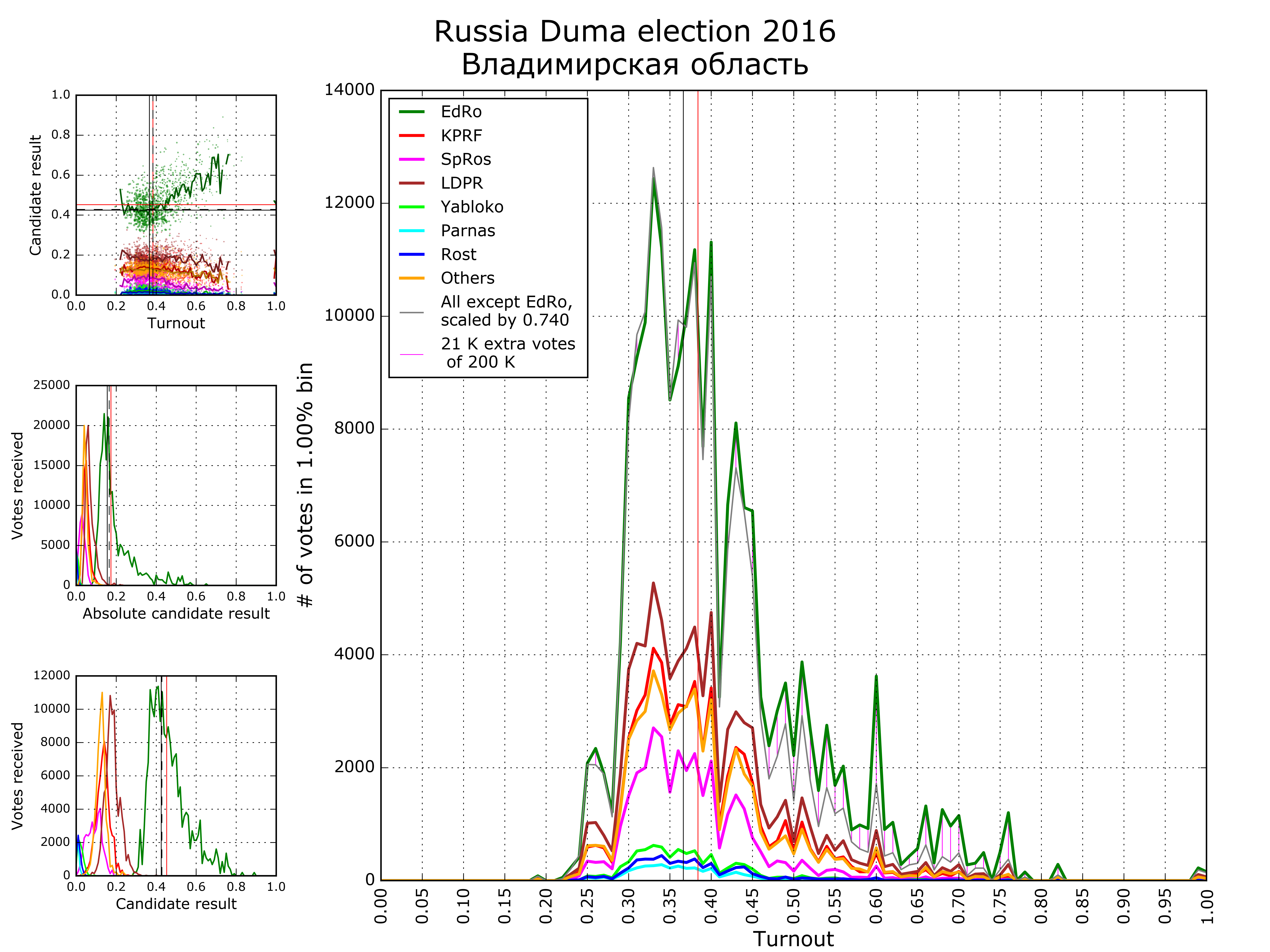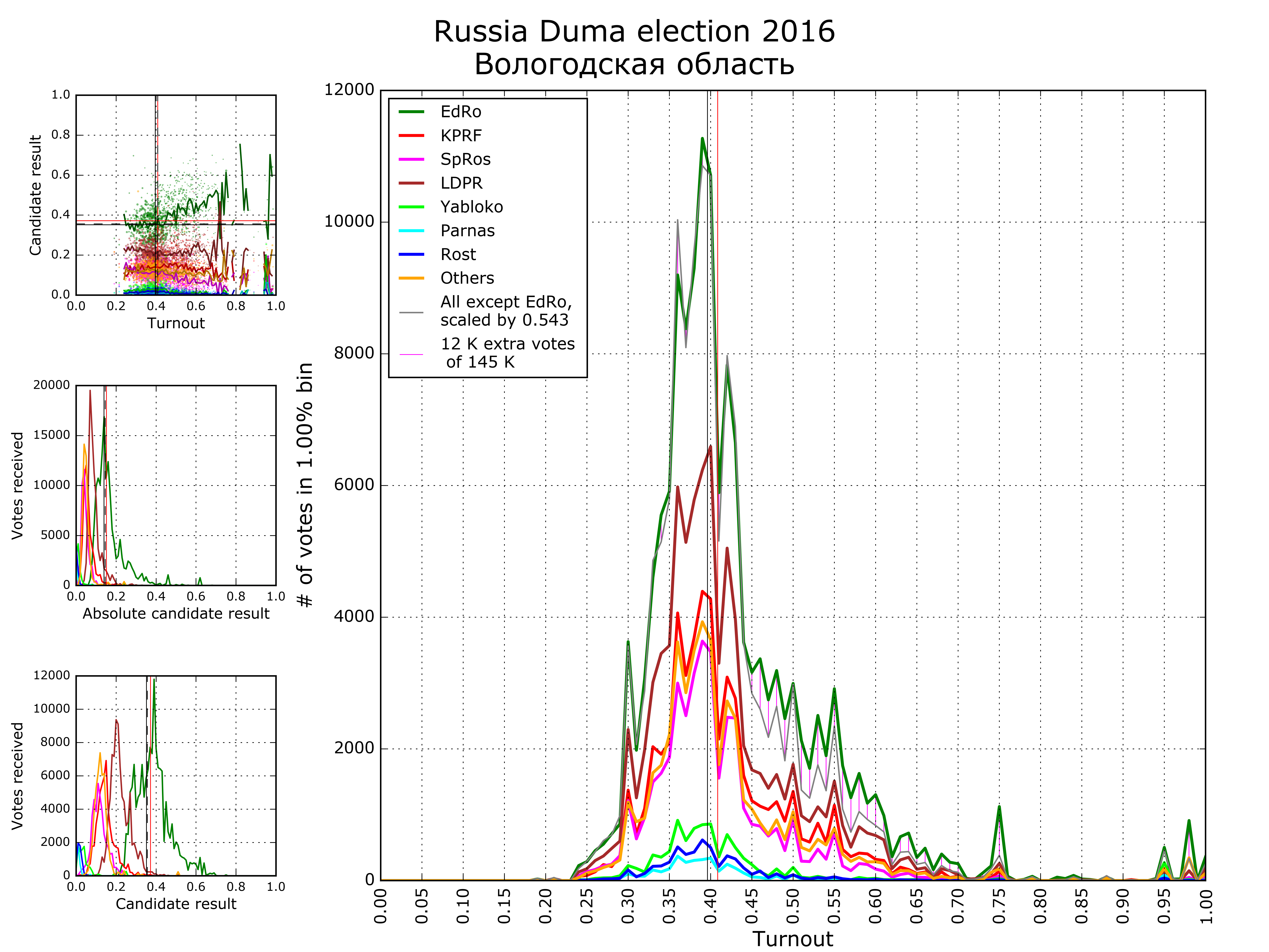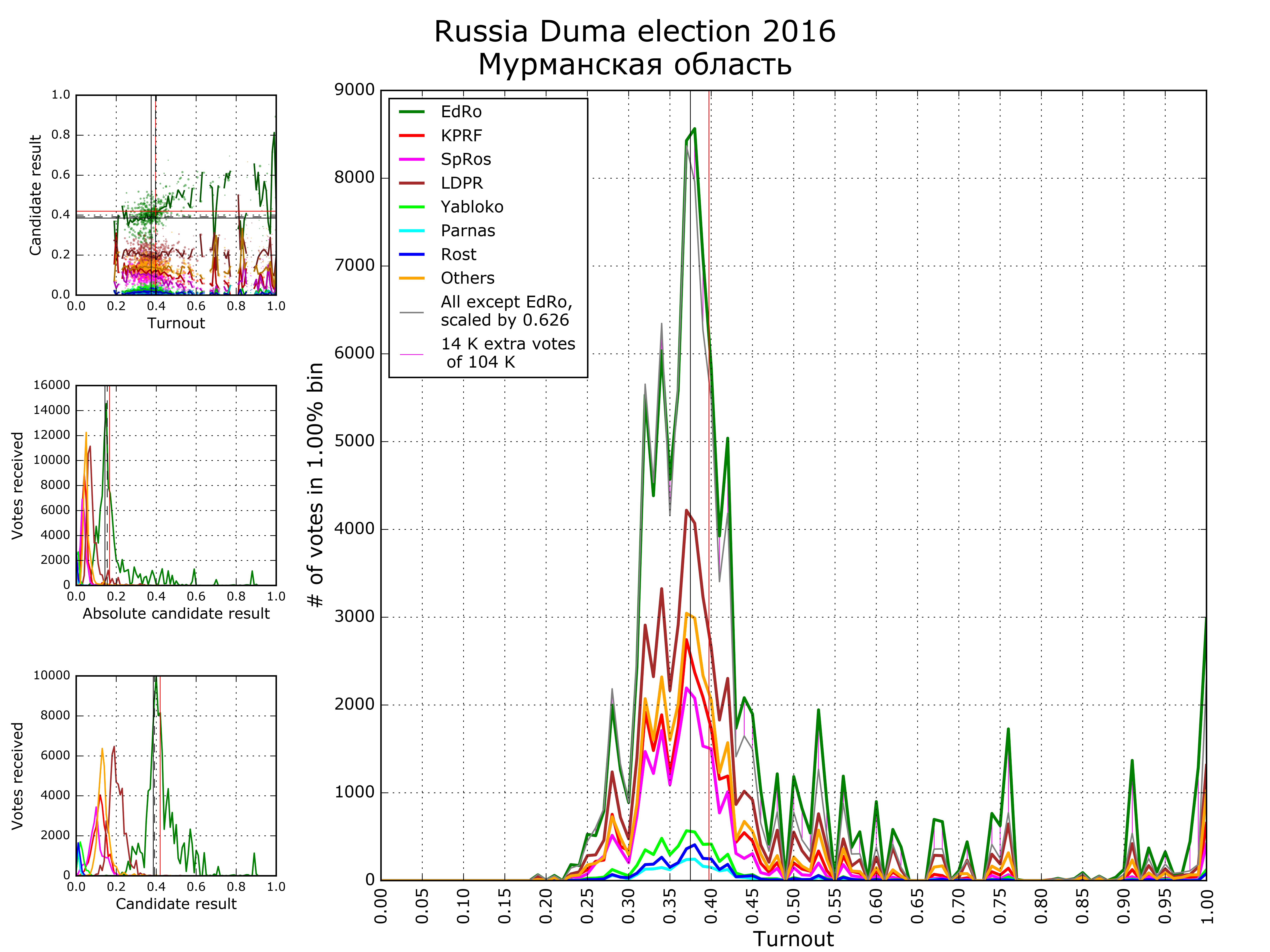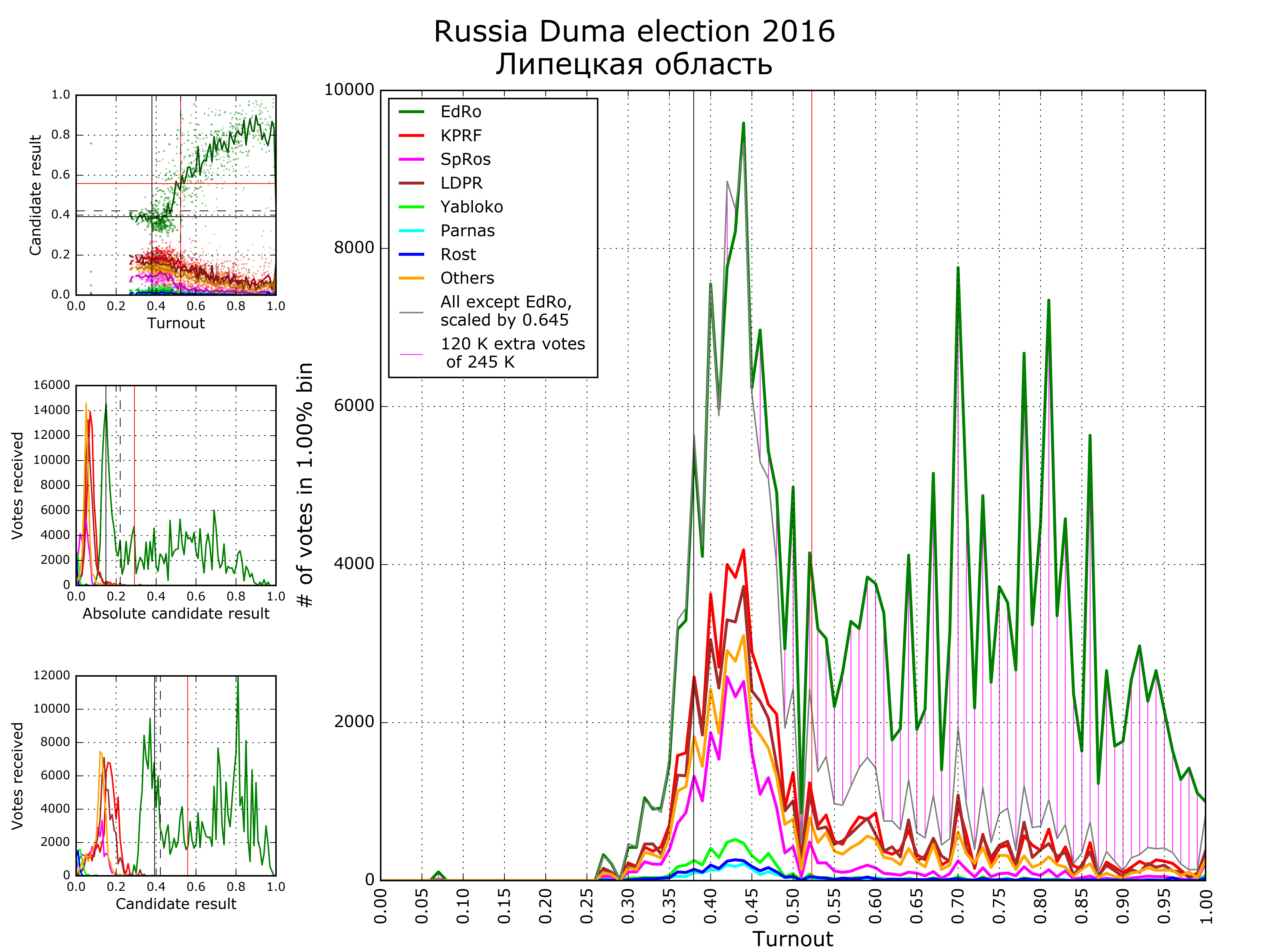 1. Обозначена явка с авторской коррекцией (реальная явка) в районе 39,25% (тёмная вертикаль). Указанная избиркомом явка в 40,78% правее красной вертикалью очень близка.