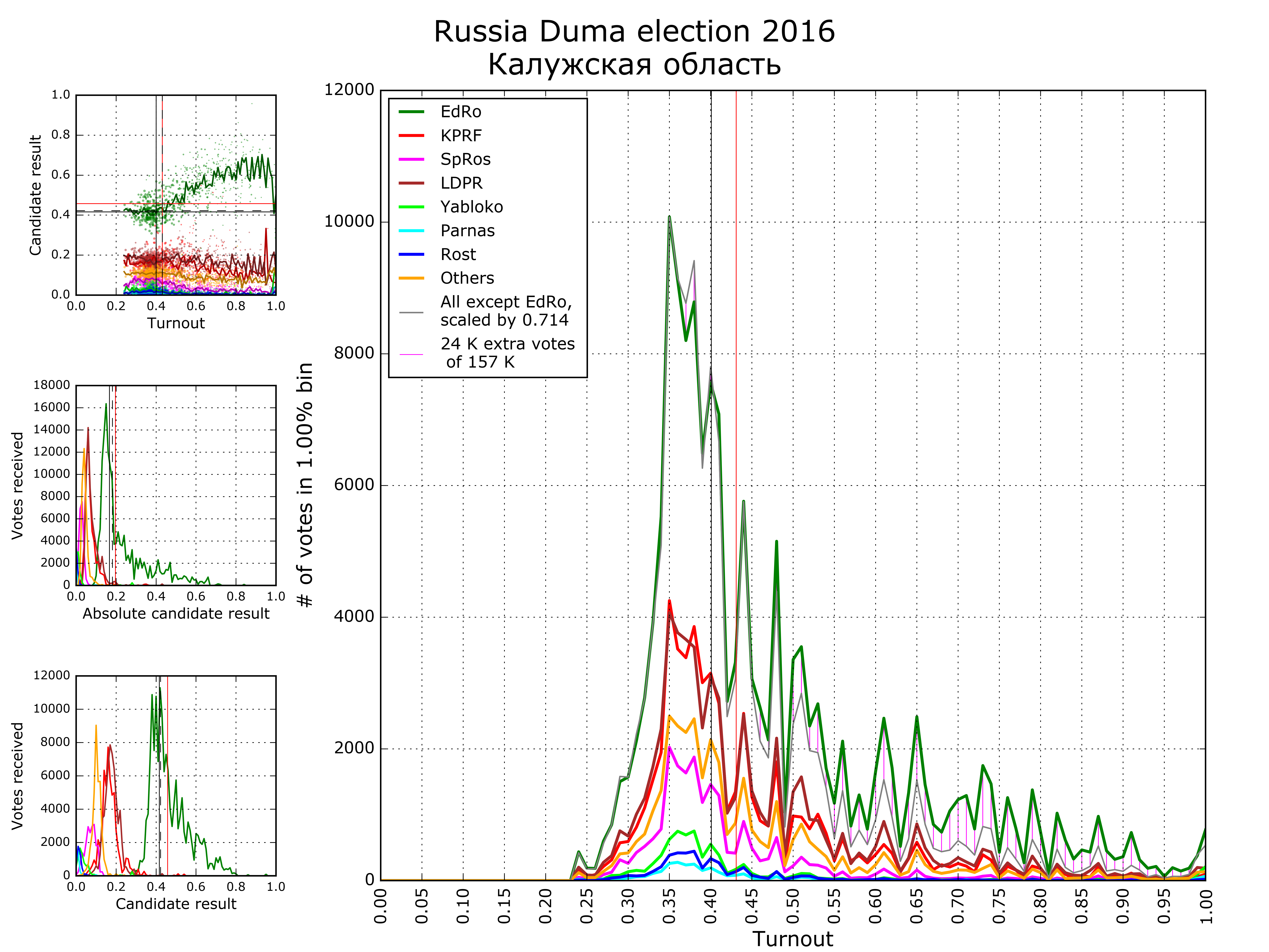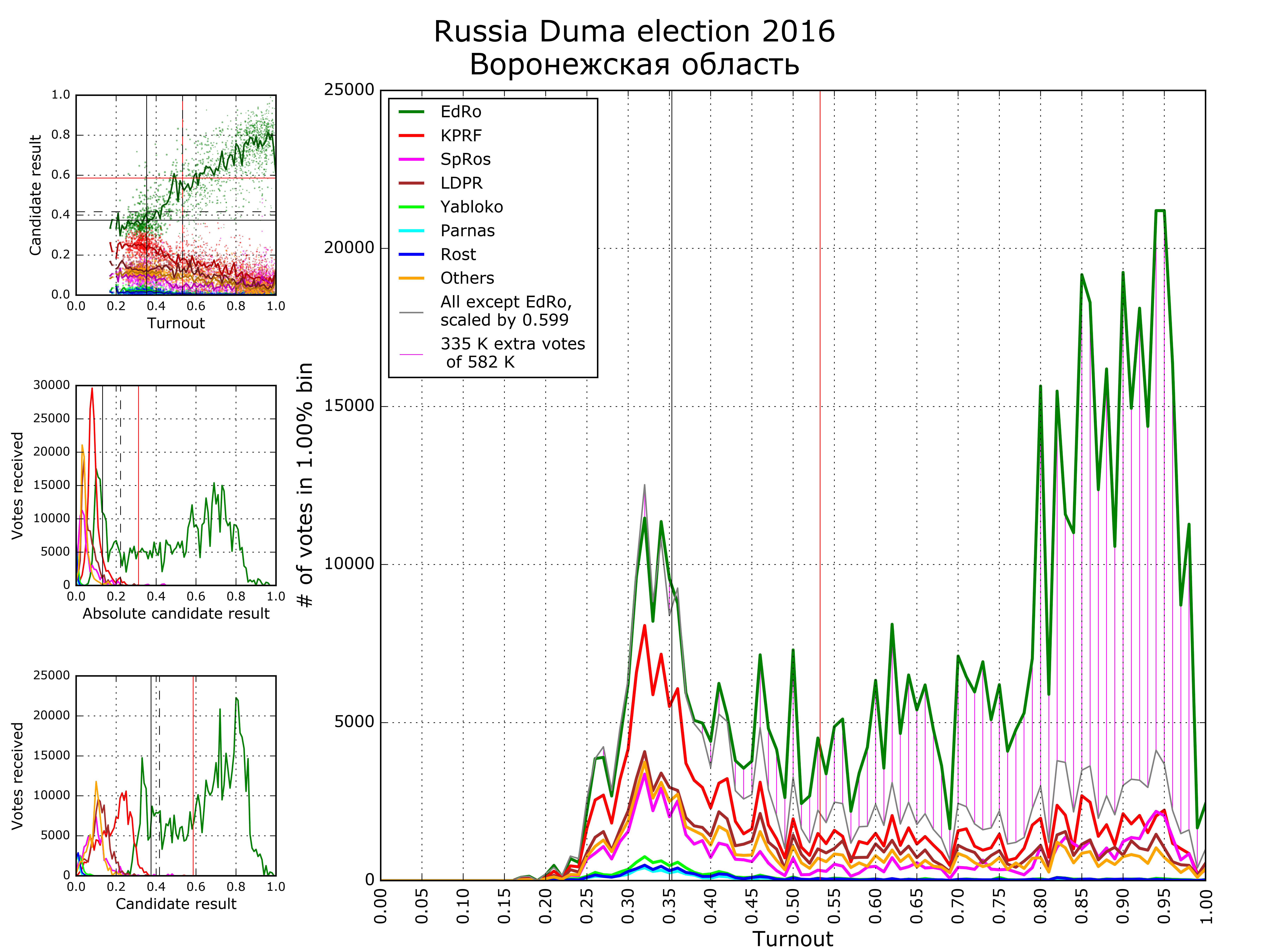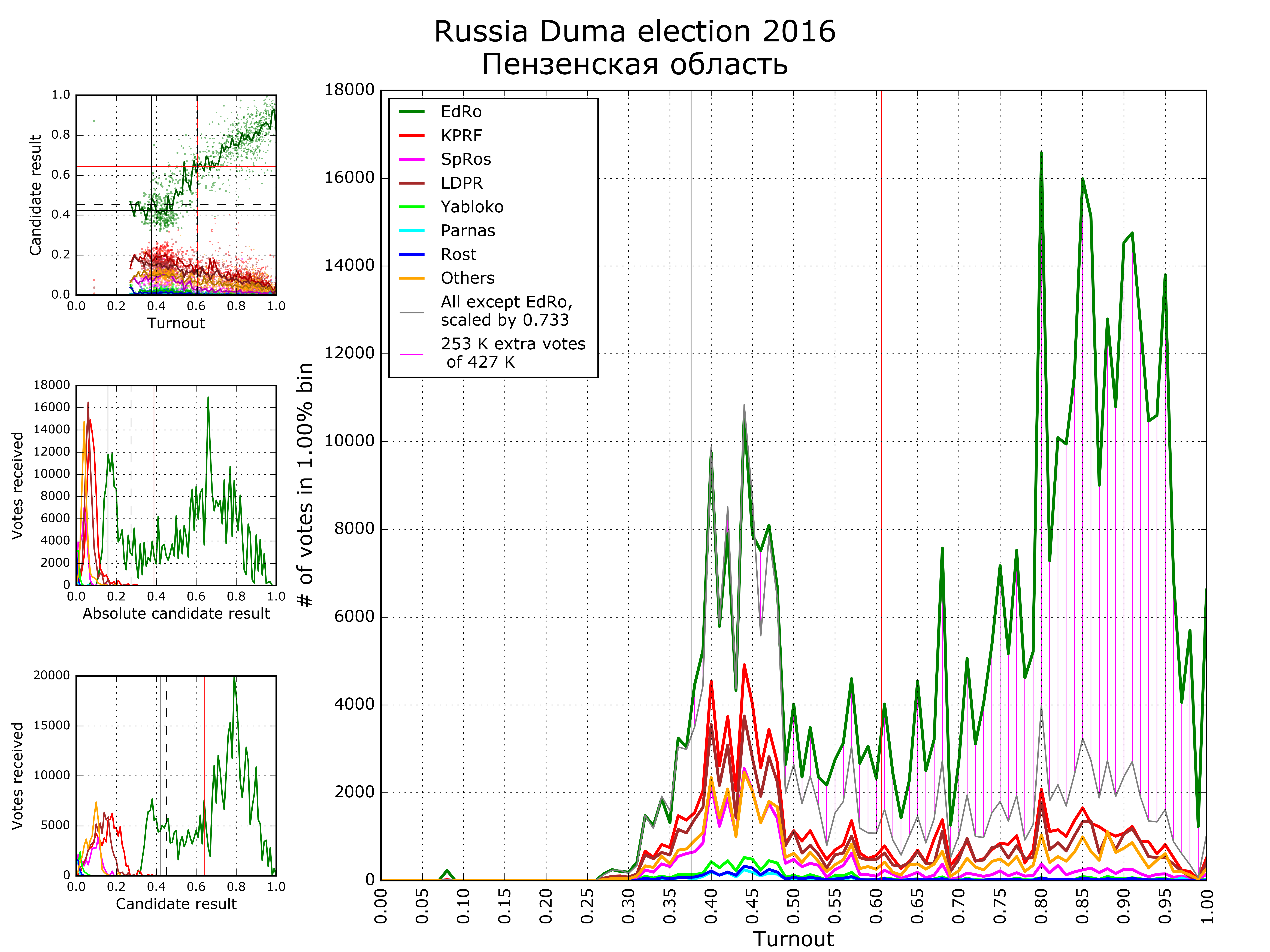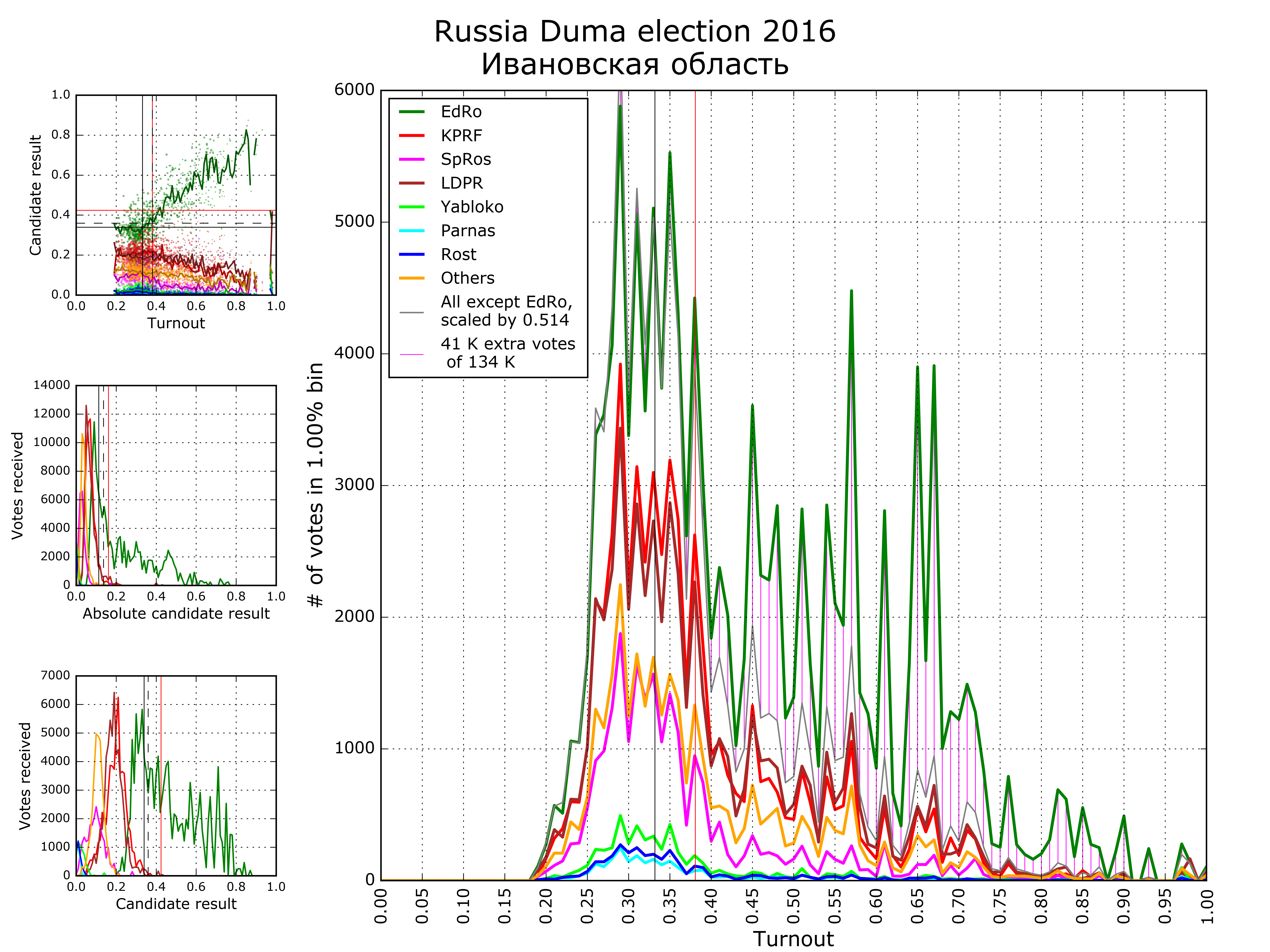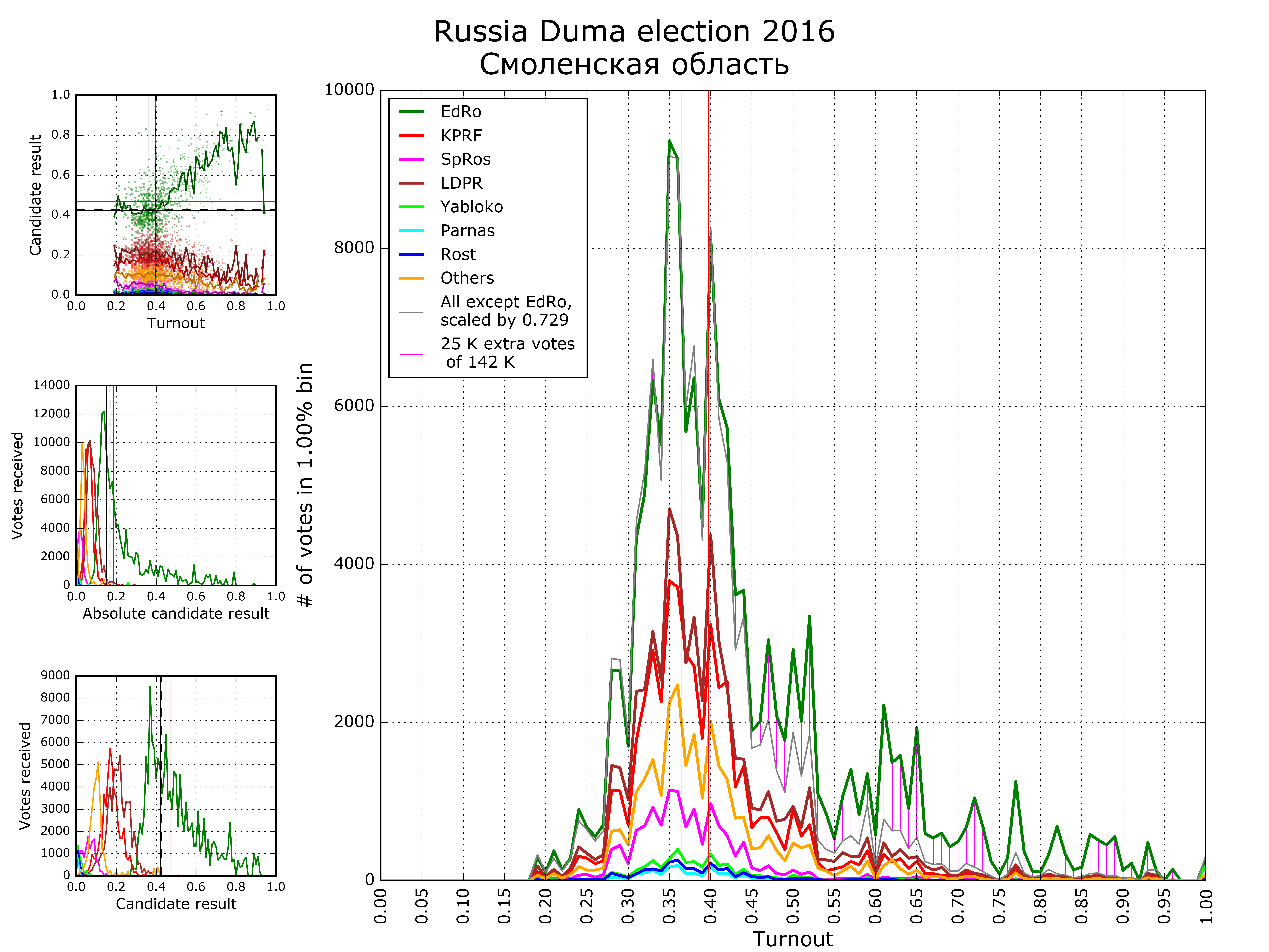 1. Обозначена явка с авторской коррекцией (реальная явка) в районе 39,25% (тёмная вертикаль). Указанная избиркомом явка в 40,78% правее красной вертикалью очень близка.