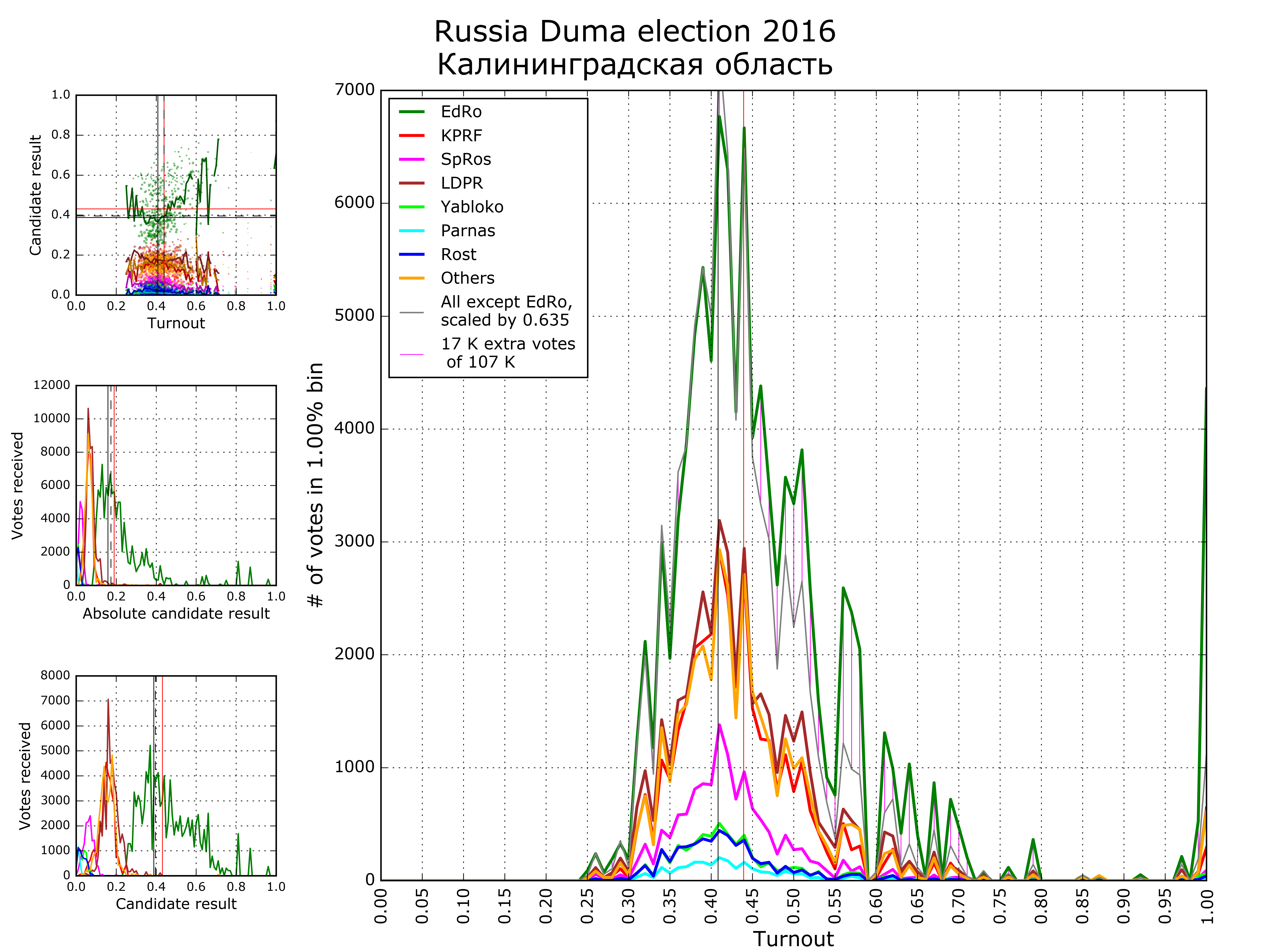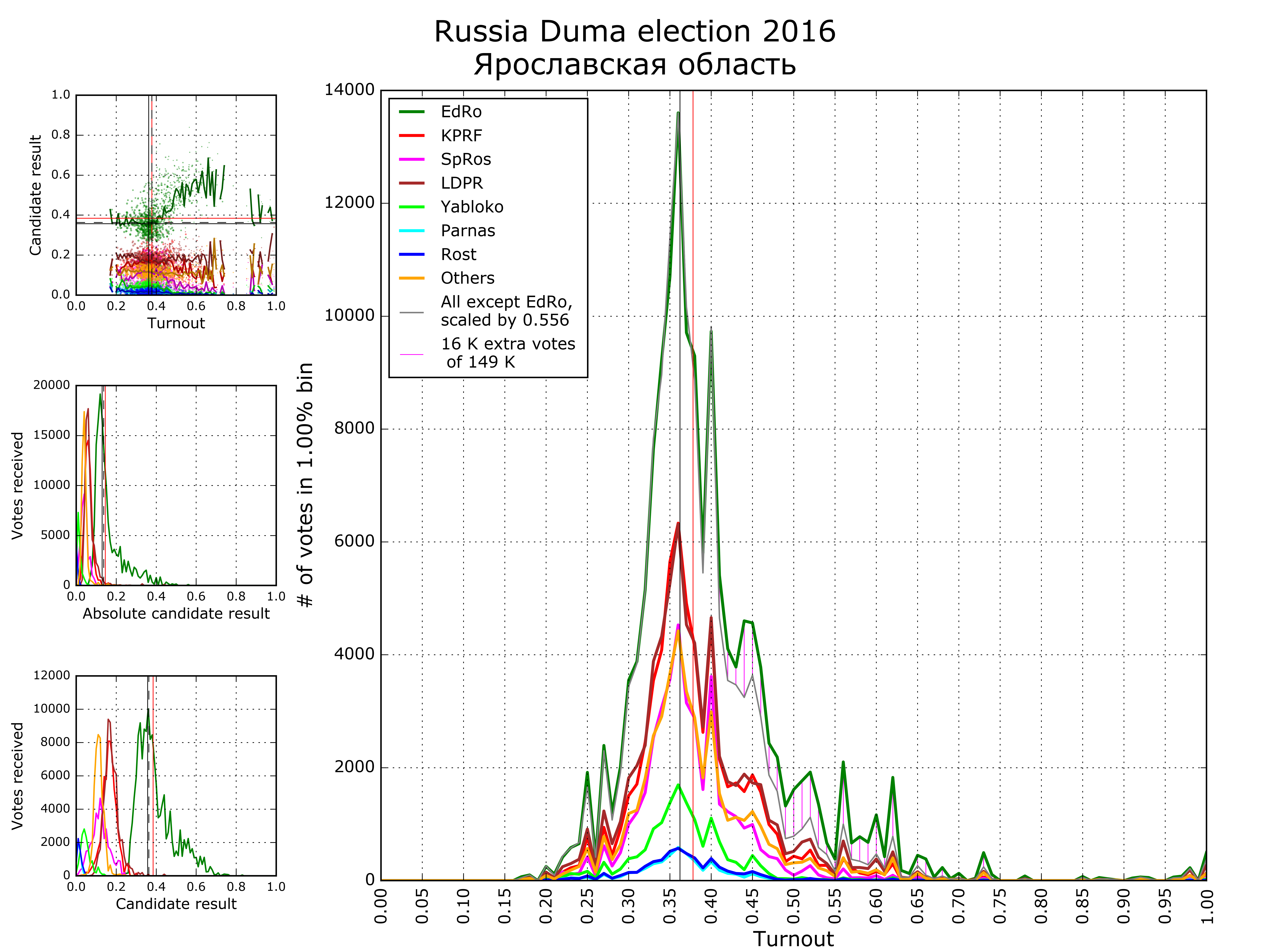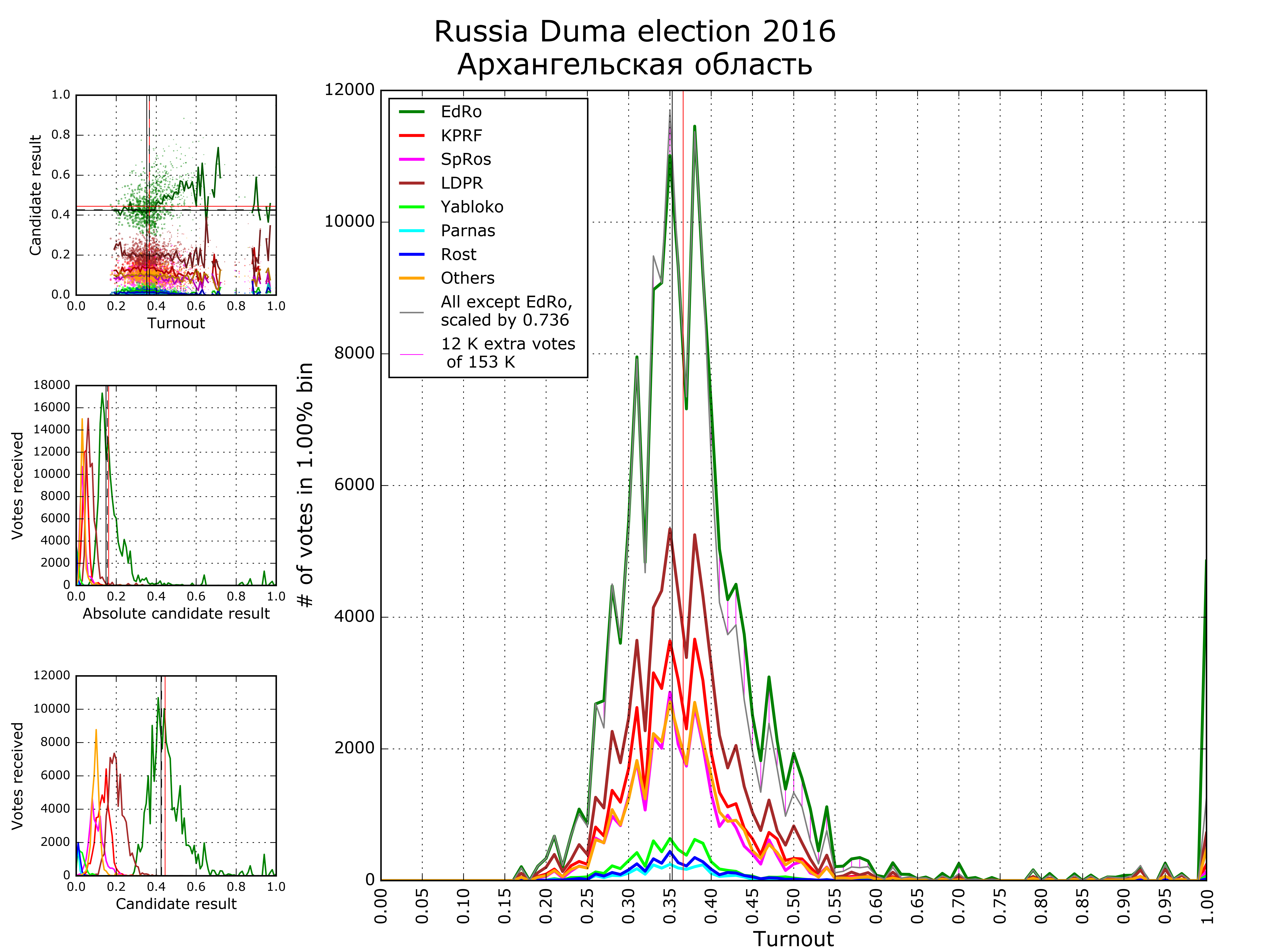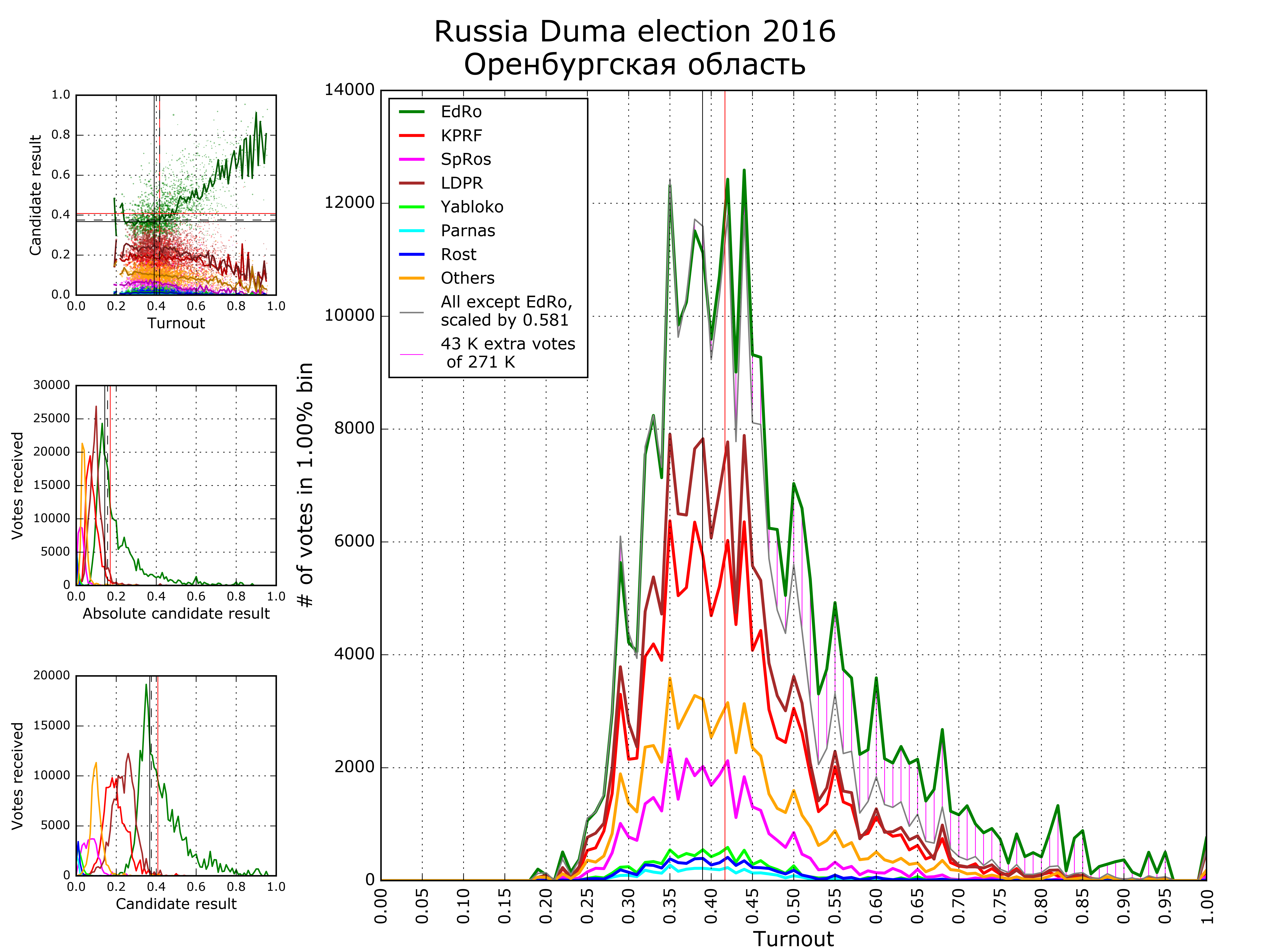 1. Обозначена явка с авторской коррекцией (реальная явка) в районе 39,25% (тёмная вертикаль). Указанная избиркомом явка в 40,78% правее красной вертикалью очень близка.