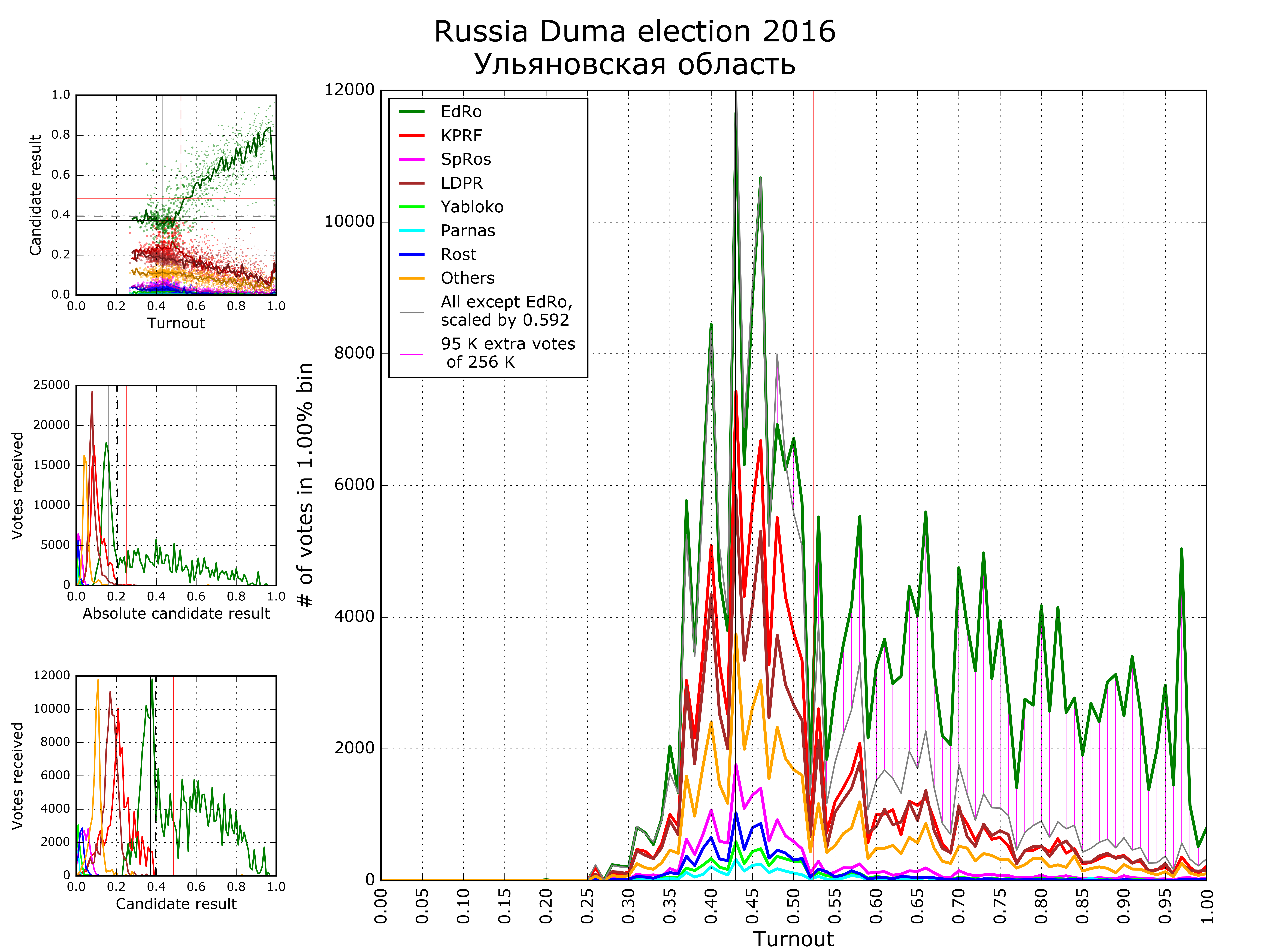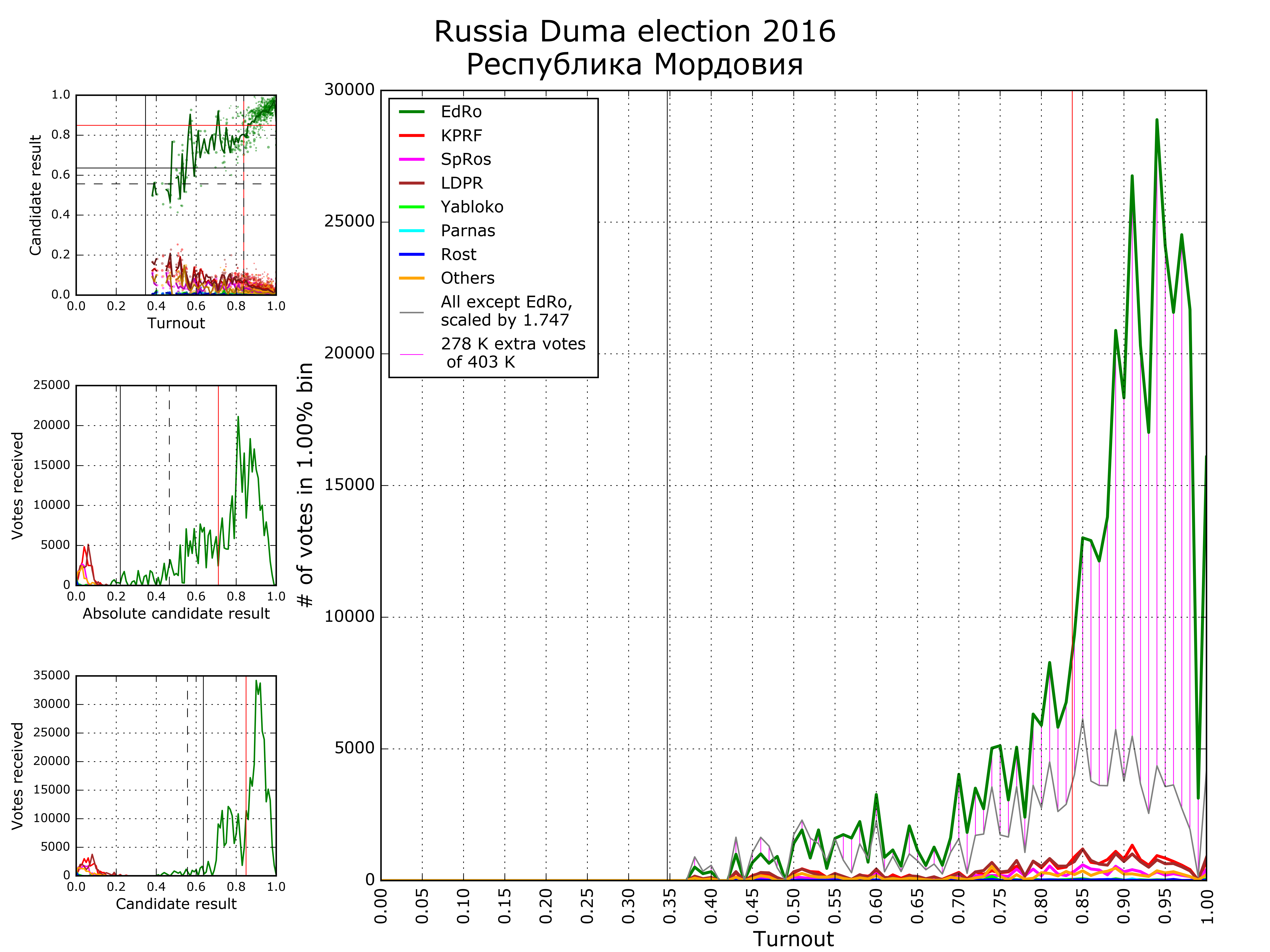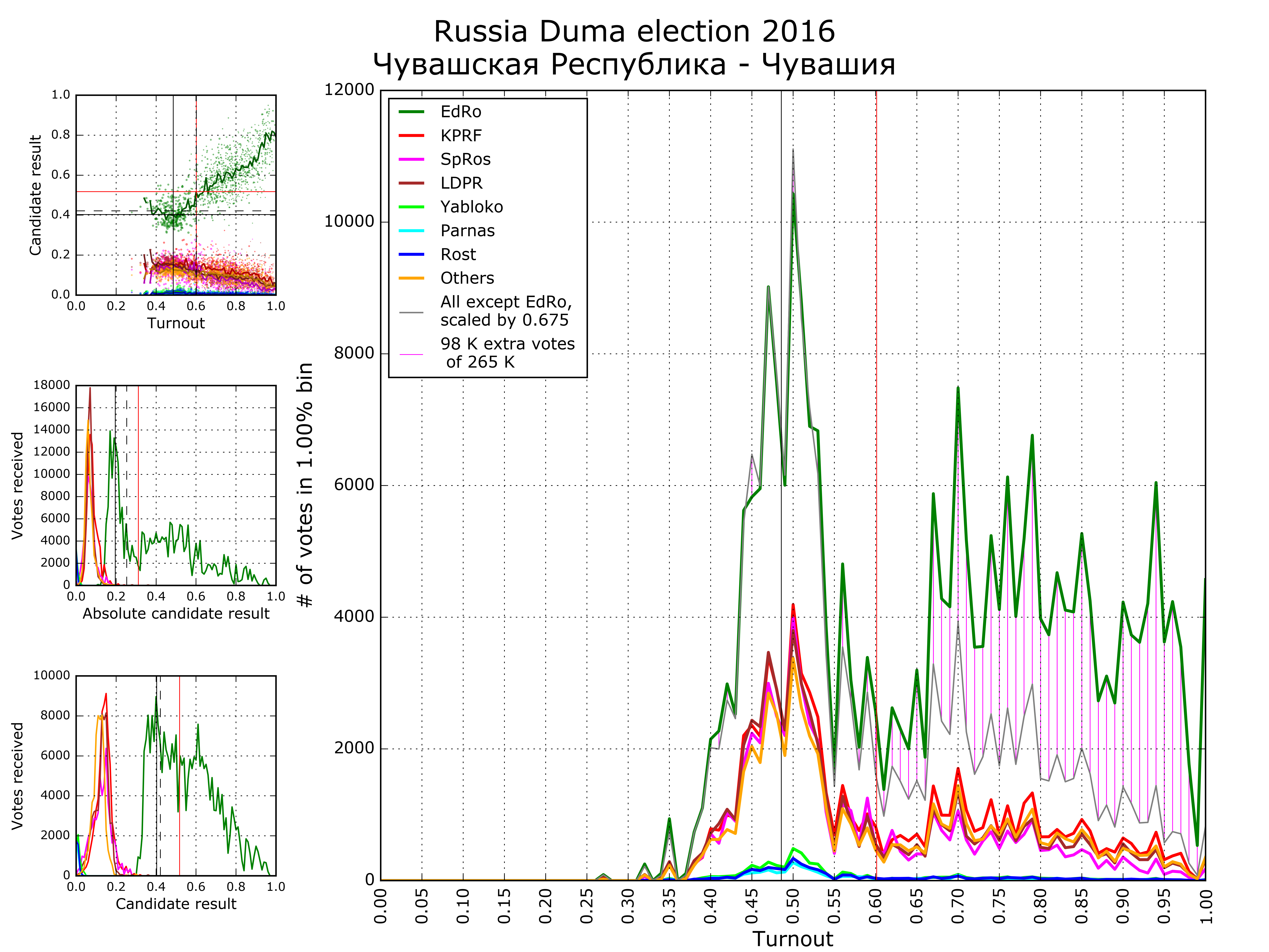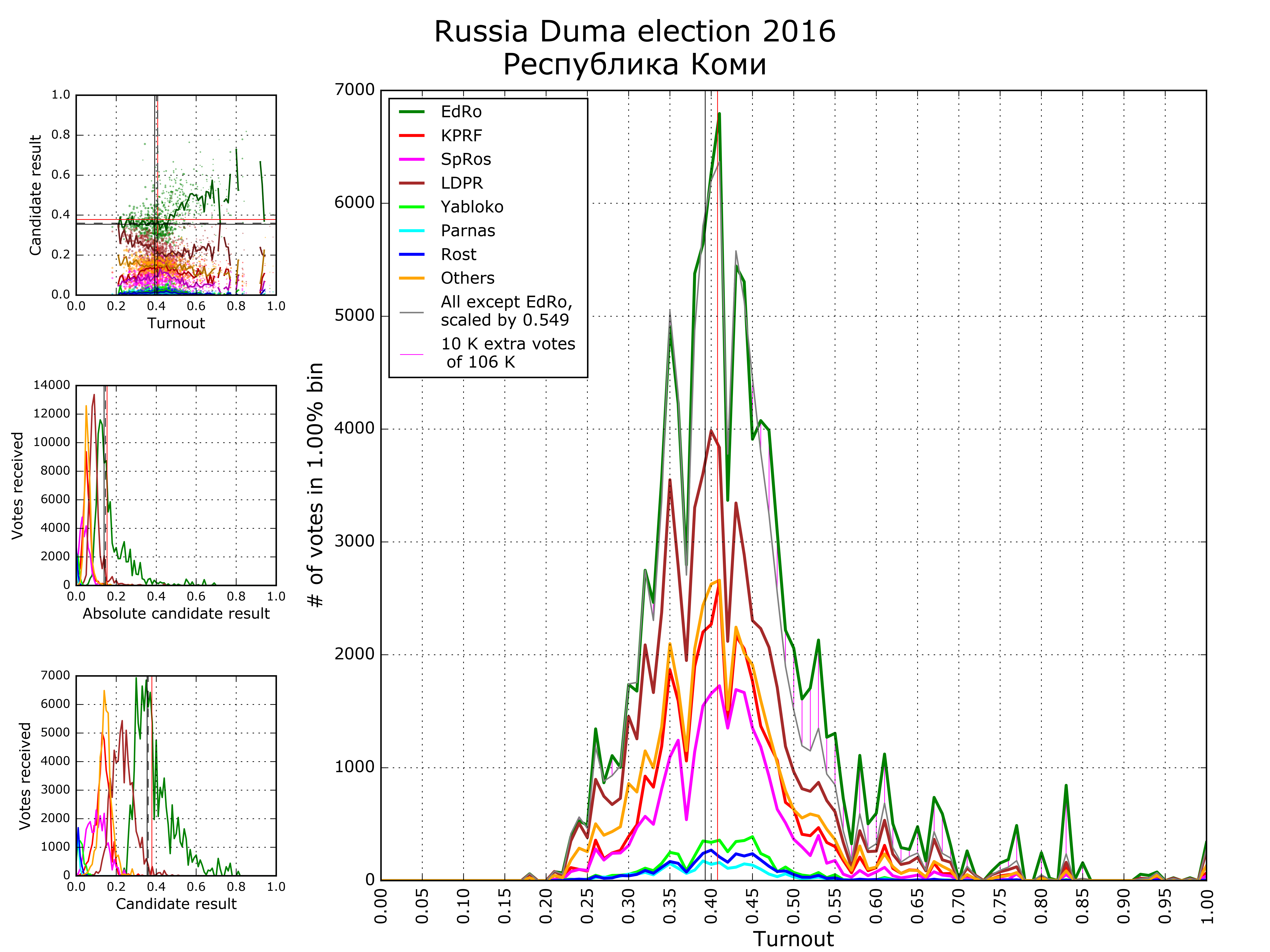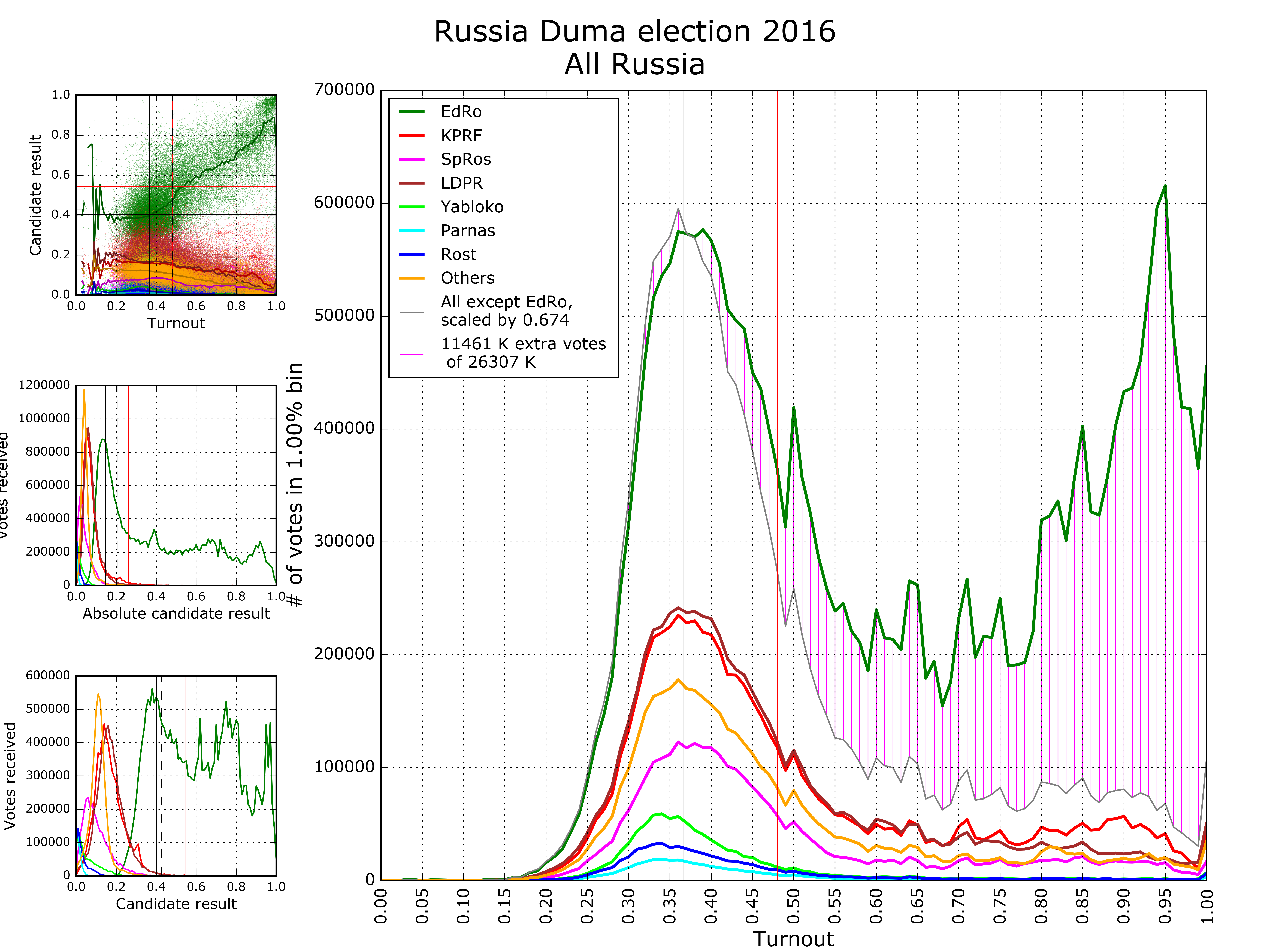 Однако, есть графики, свидетельствующие, по мнению автора, о намного больших вбросах и приписках (добавлении голосов в пользу нужной партии) на выборах. Графики ниже заметно отличаются от графика Республики Коми.