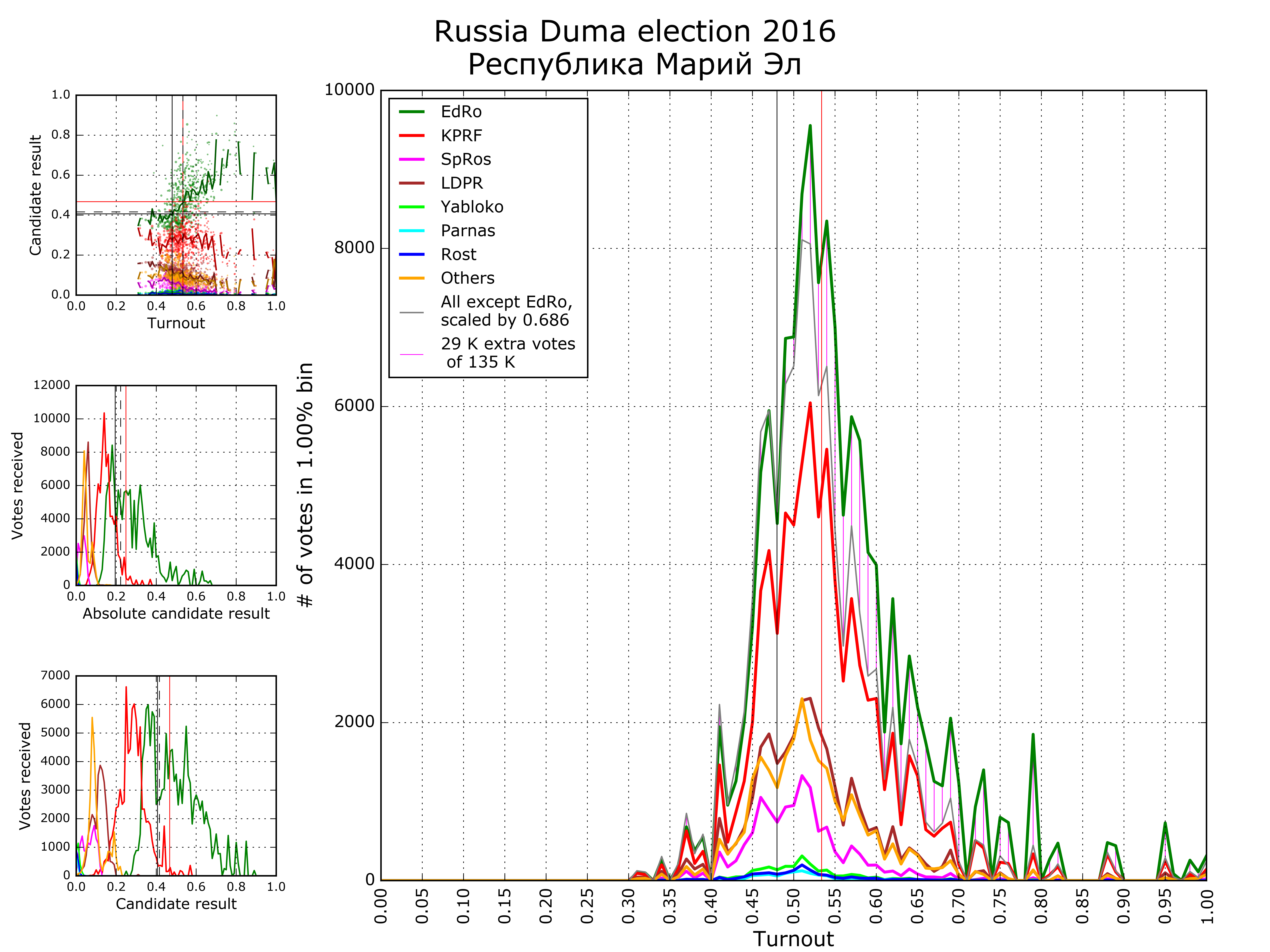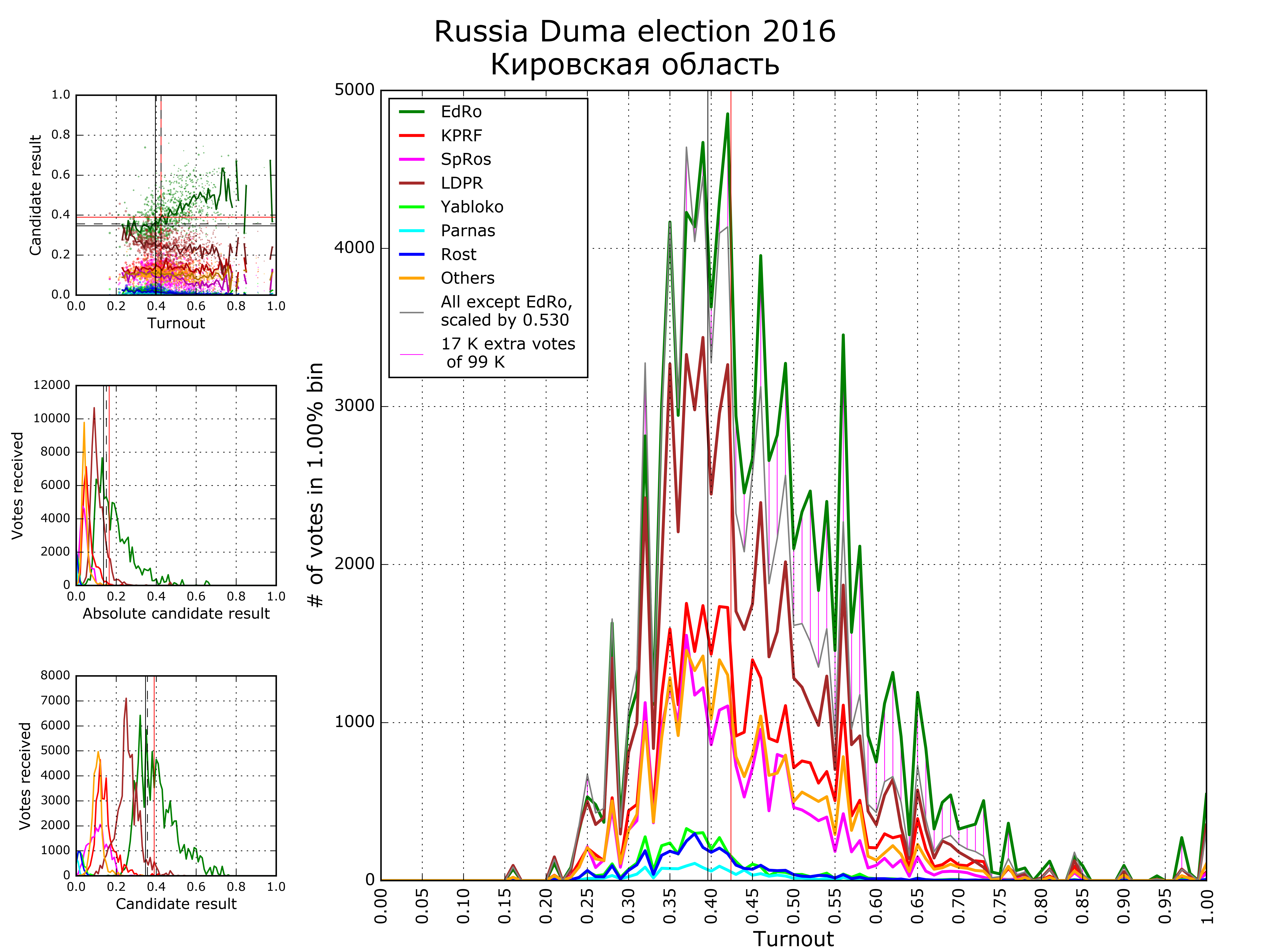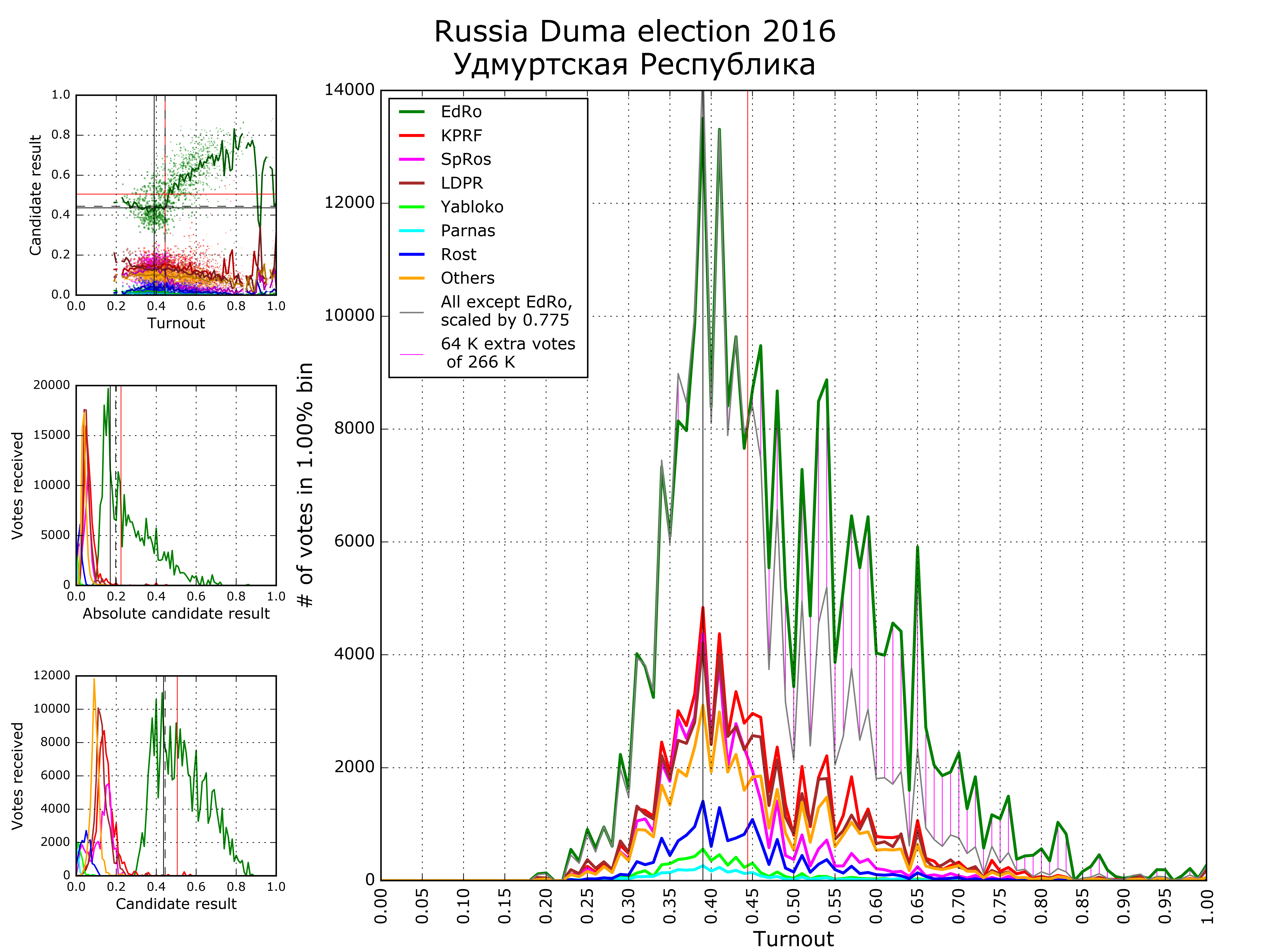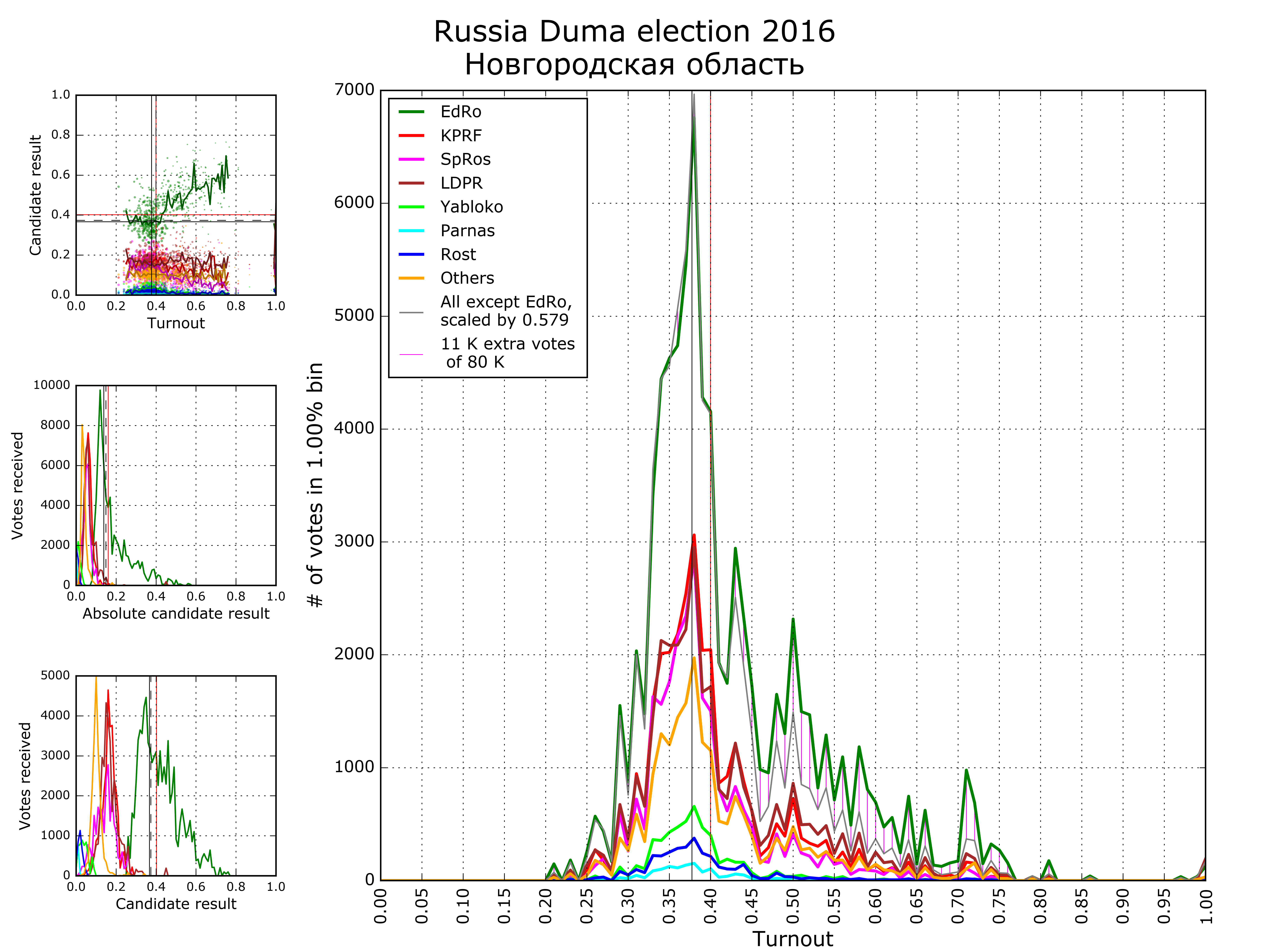 Однако, есть графики, свидетельствующие, по мнению автора, о намного больших вбросах и приписках (добавлении голосов в пользу нужной партии) на выборах. Графики ниже заметно отличаются от графика Республики Коми.