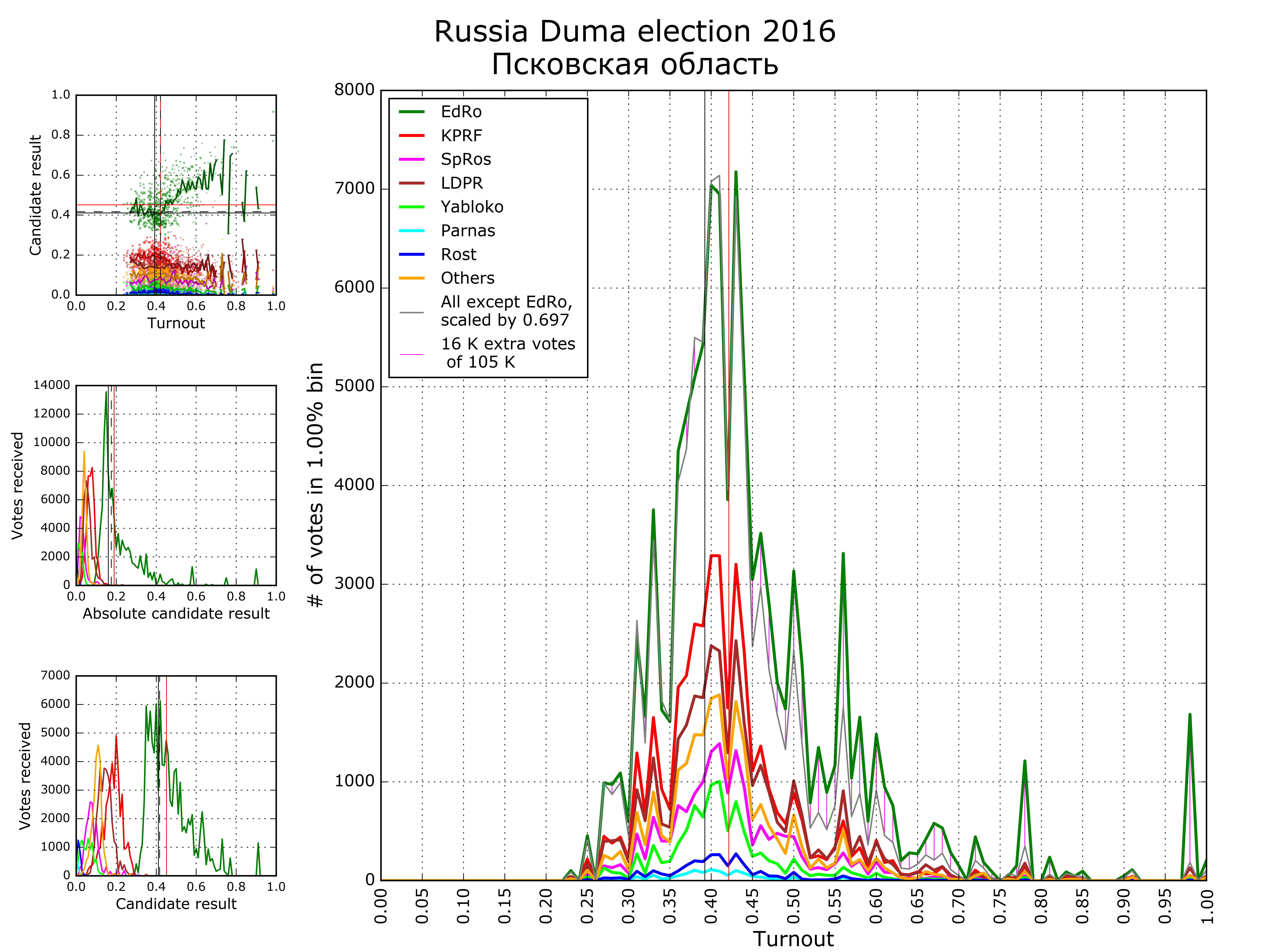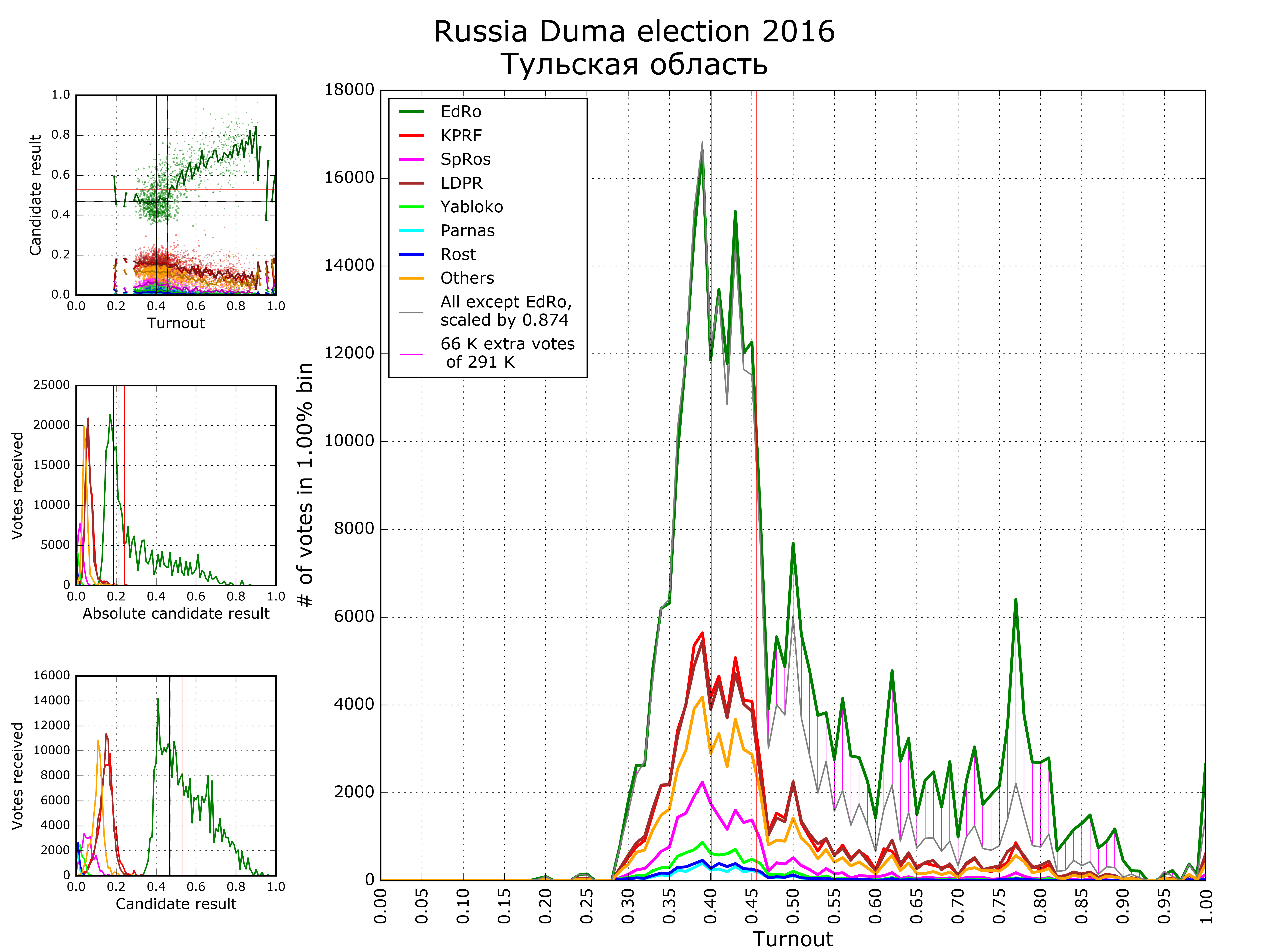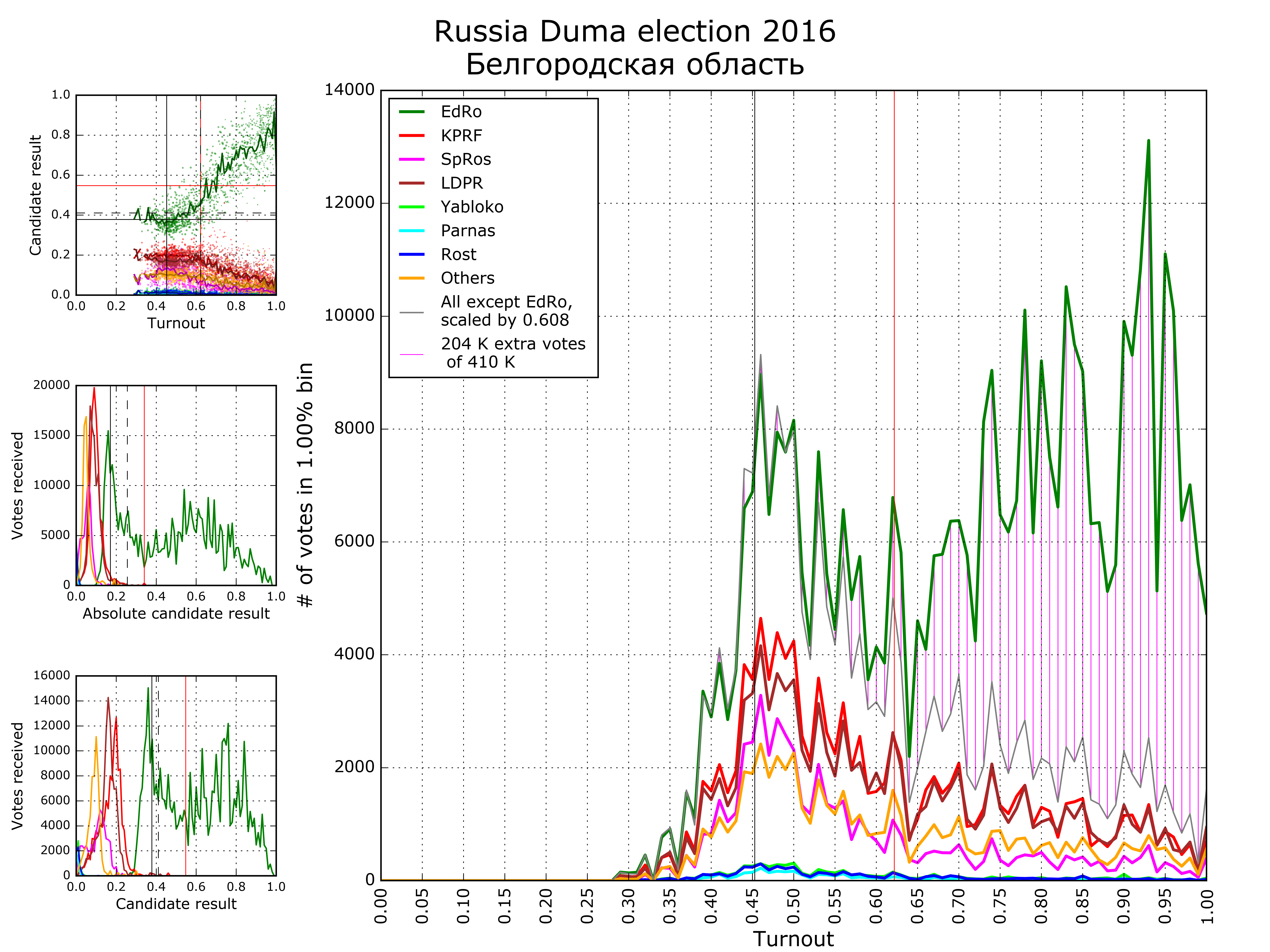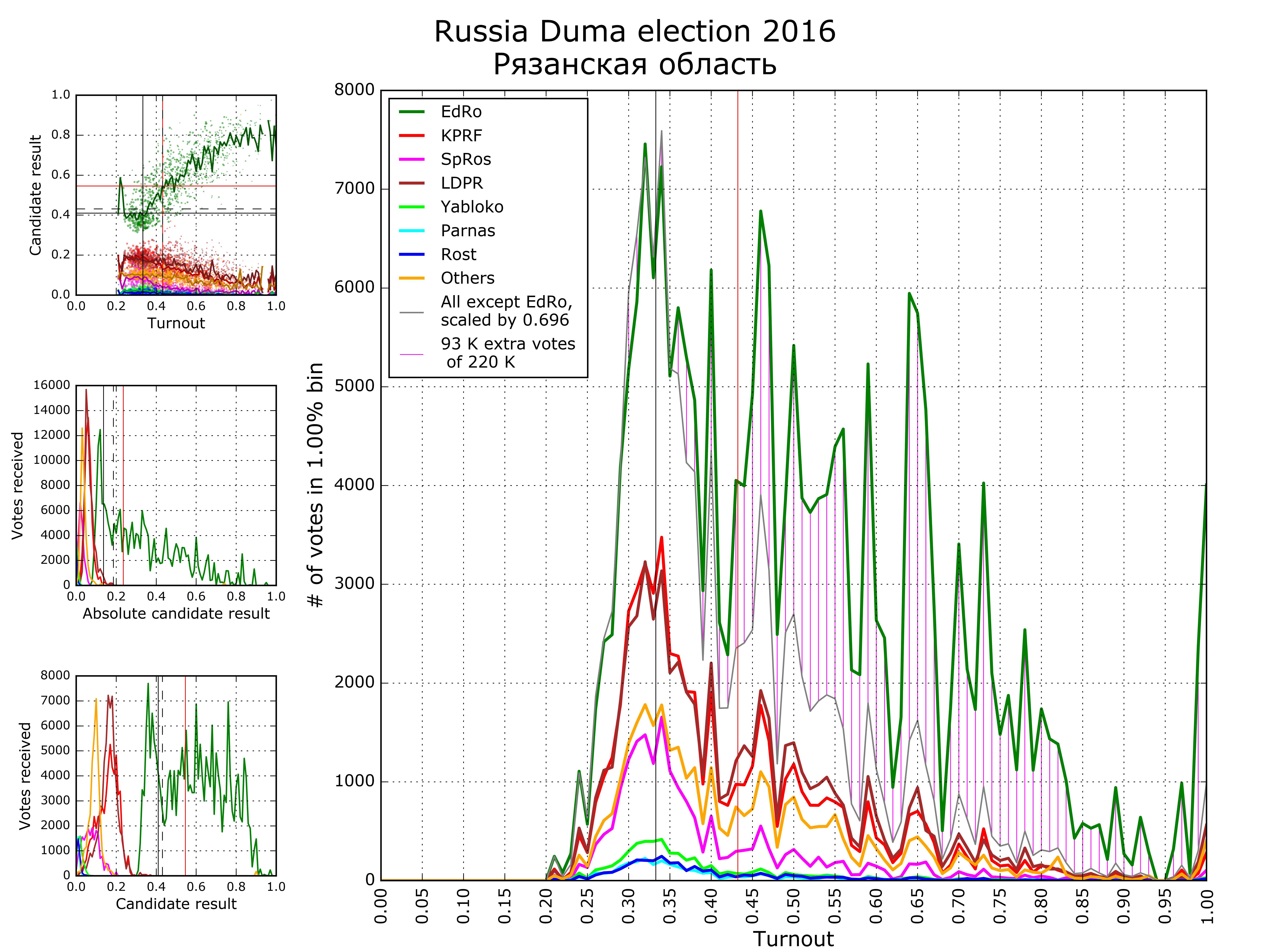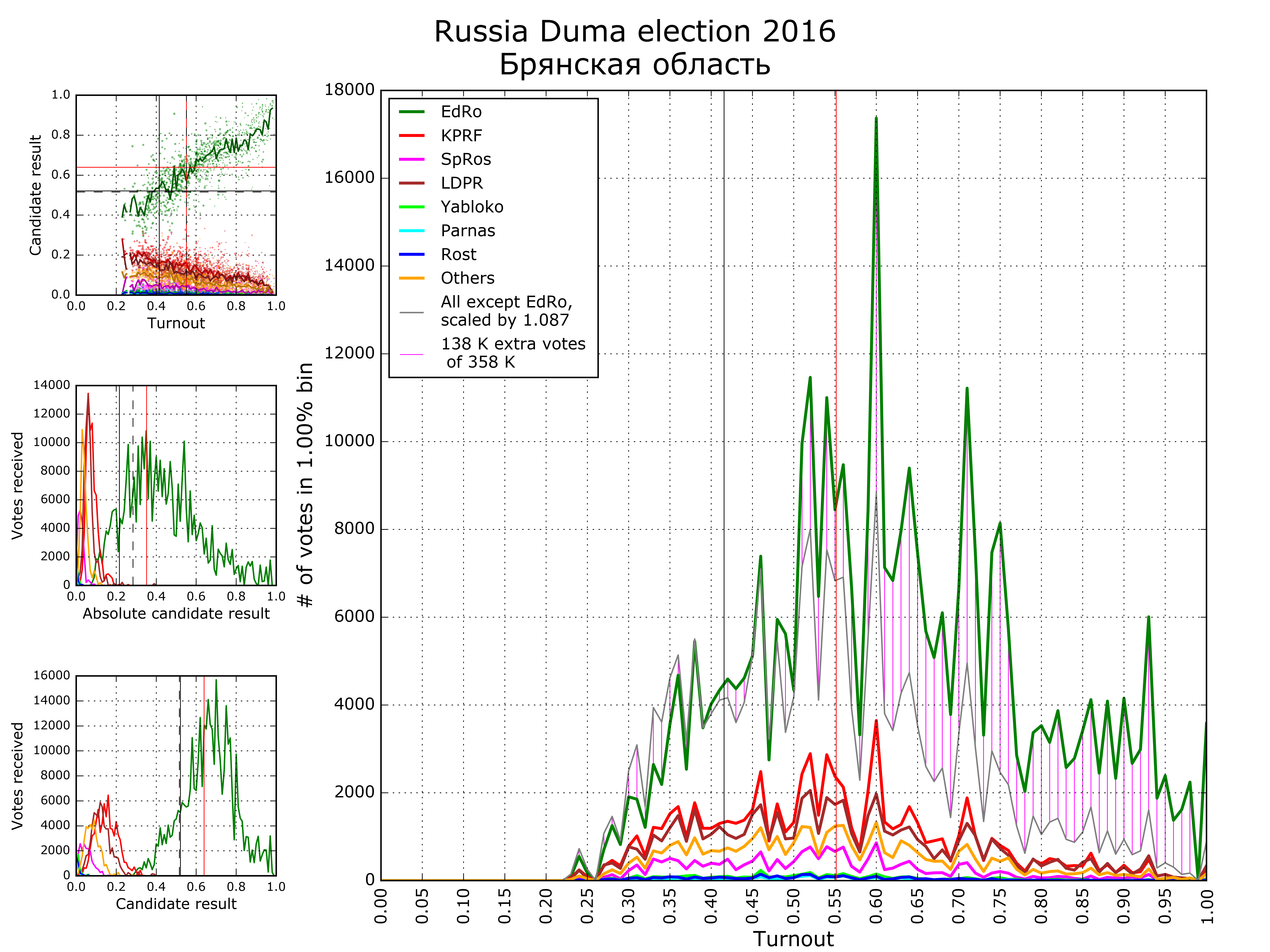 Однако, есть графики, свидетельствующие, по мнению автора, о намного больших вбросах и приписках (добавлении голосов в пользу нужной партии) на выборах. Графики ниже заметно отличаются от графика Республики Коми.