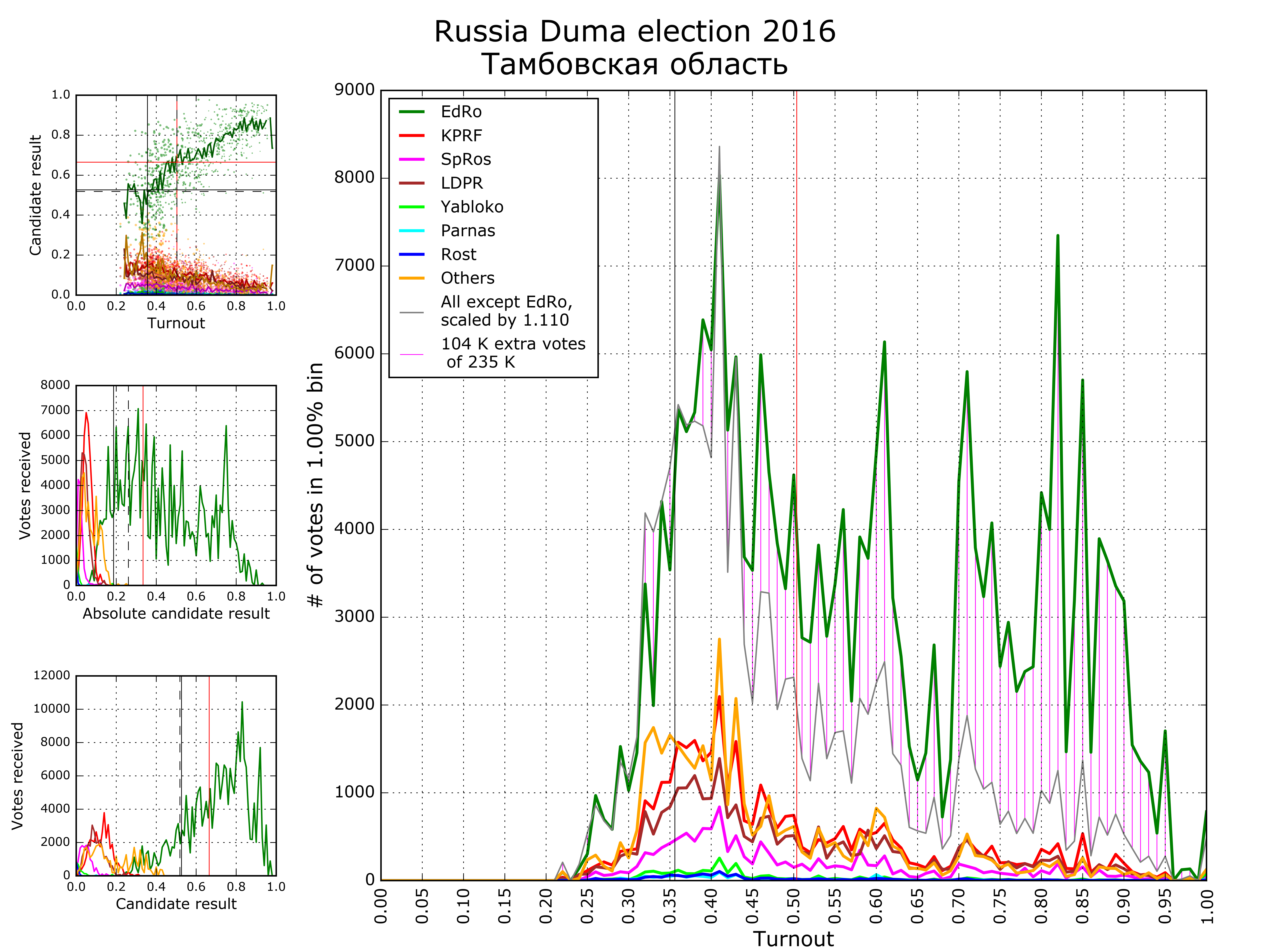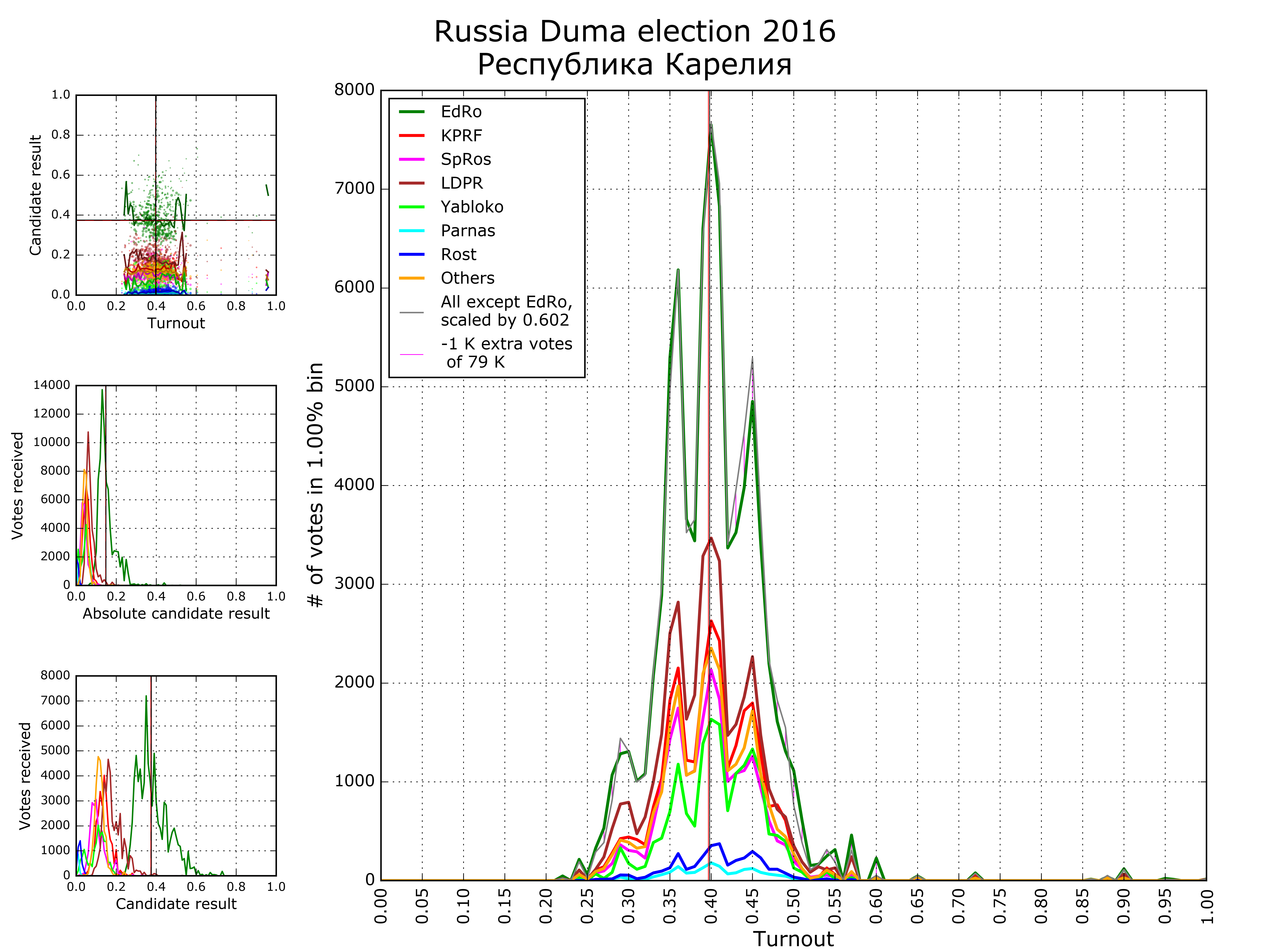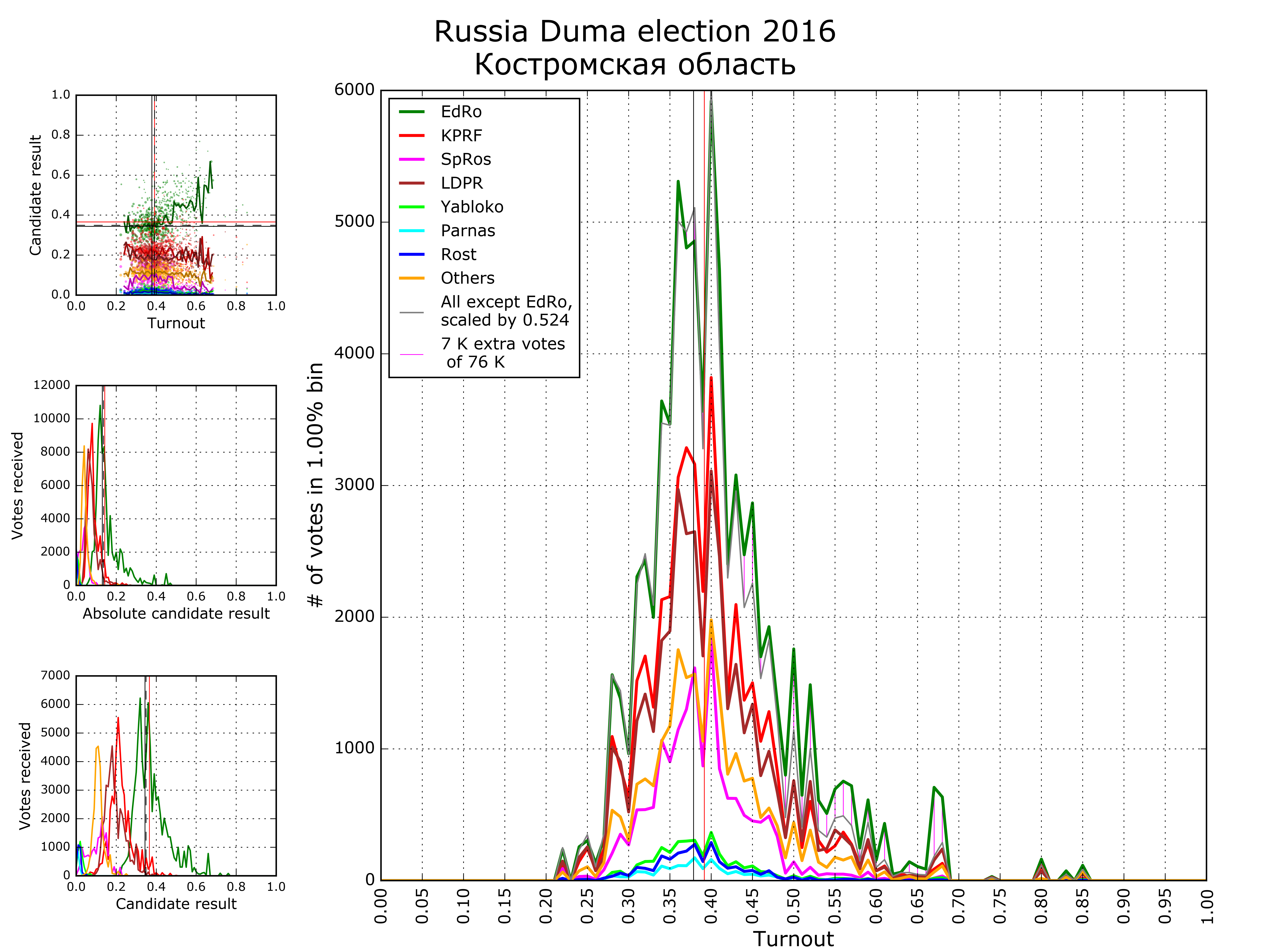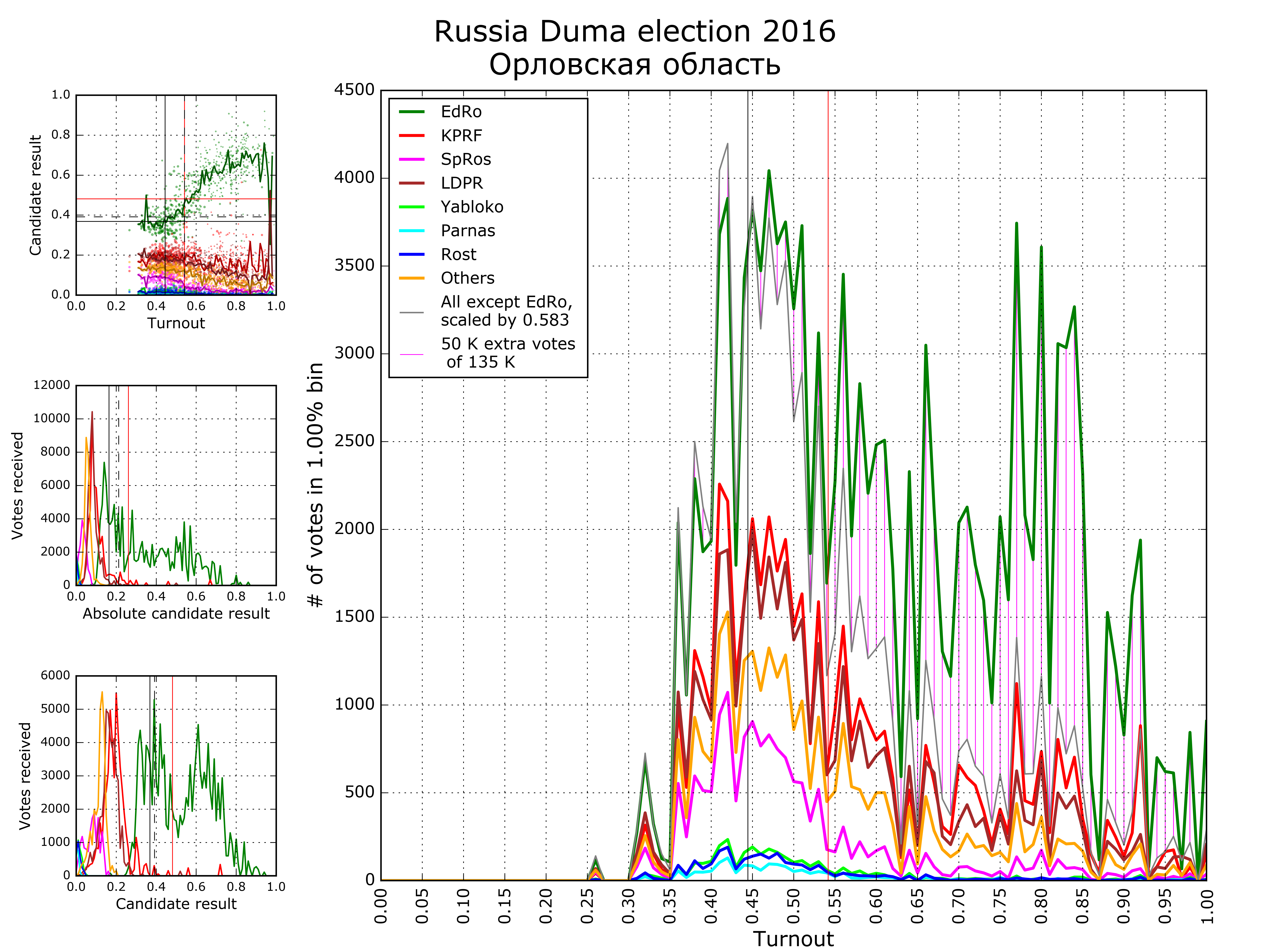 7. В левом верхнем углу виден график с точками. Точки — результат партий по отдельным участкам. Заметно, чем выше явка, тем больше результат у одной партии. В этом случае на участках с явкой в районе 50-60% есть такие отклонения. Результаты других партий остаются постоянными, без таких скачков.
