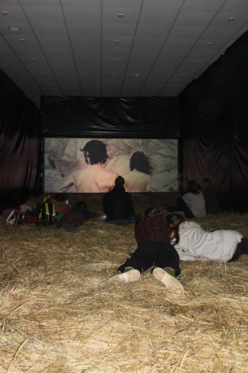 Внутри инсталляции зрители сидят на полу, на сене, сено пахнет и хрустит, оно настоящее, даже, иногда кажется, с насекомыми. На экране на одной из стенок выгородки — видео каменистого ландшафта со сложным рельефом: это то ли доисторическая пустыня, то ли, наоборот, апокалиптические останки цивилизации. В этой нечеловеческой красоте путешествуют два существа — полулюди, полукони — сами авторы в hip briefs с почти аутентичными конскими хвостами, в плотных гетрах и альпинистских ботинках. Половые различия между танцорами очень условны, они различаются скорее цветом хвостов (черный и белый). Но это не дикари, не инопланетяне, в их движениях нет-нет да и появляются элементы академического или социального танца.