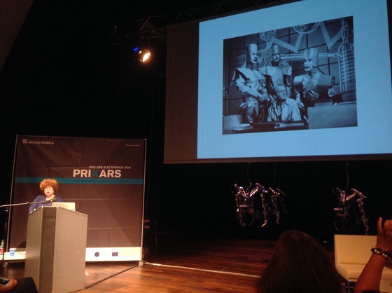 © Анна Титовец Символичный момент: один из первых кураторов, поместивших роботов в выставочное пространство, Ясия Рейхардт читает лекцию на фоне экзоскелетов (под проекцией), сконструированных для контроля движения людьми в проекте Inferno Билла Ворна и Луи-Филиппа Демерса — Вам понравилась нынешняя Ars Electronica? Есть ли какие-то проекты, которые бы вы особенно выделили? И как вы относитесь к метафоре, согласно которой медиахудожники, работающие на стыке разных дисциплин с технологиями и наукой, — «алхимики нашего времени» (название одного из двух главных выставочных проектов этого года на фестивале. — Ред.)?