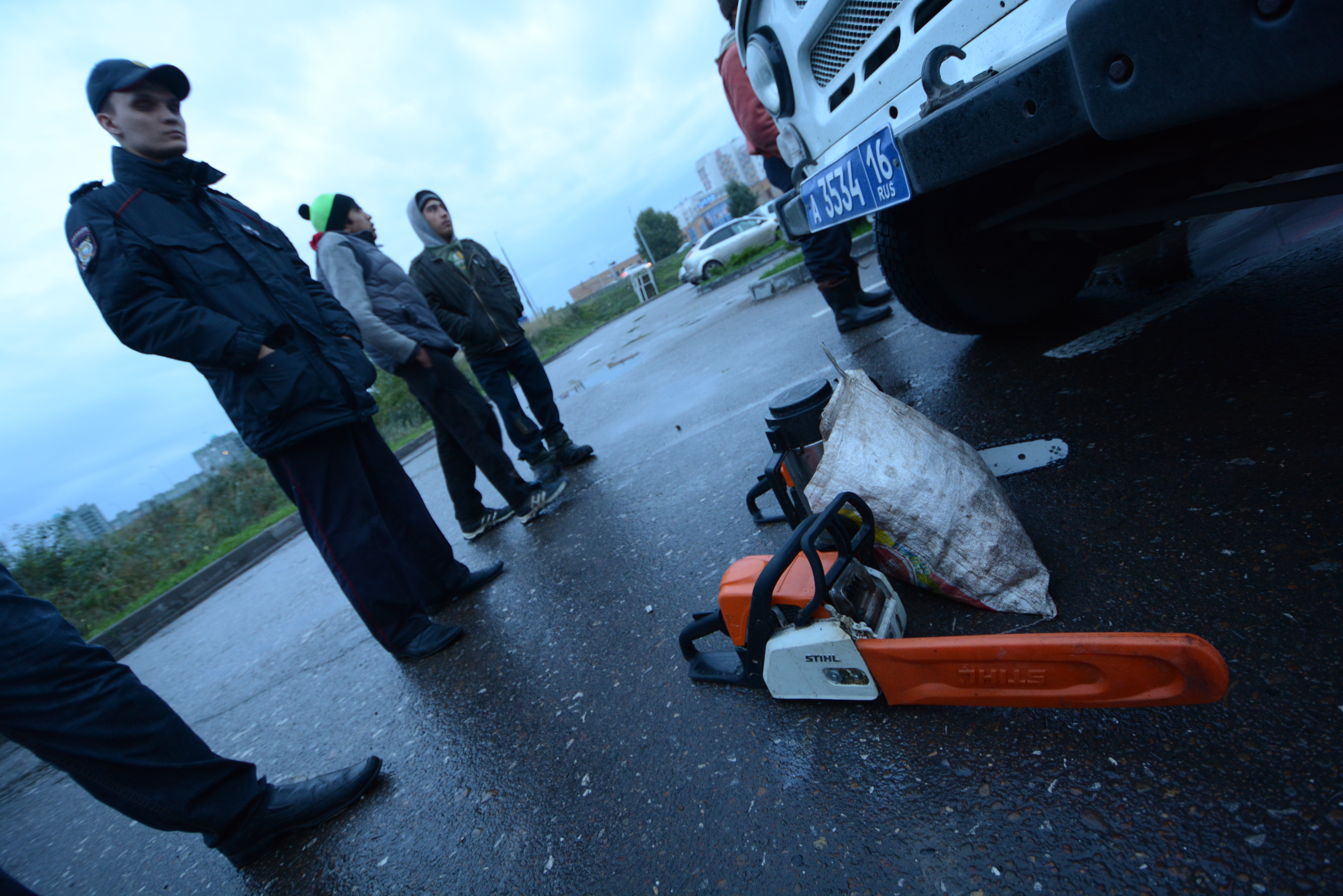 Они выходят из посадки, как окруженные партизаны – молчаливые, грязные, в засаленных толстовках и куртках. Для полного соответствия не хватает лишь поднятых рук. Перед "УАЗиком" разоружаются, складывая на асфальт у капота бензопилы и сумки. Баллон с горючим для пил, который мы заметили у них еще на площадке, видимо, успели надежно спрятать в кустах.