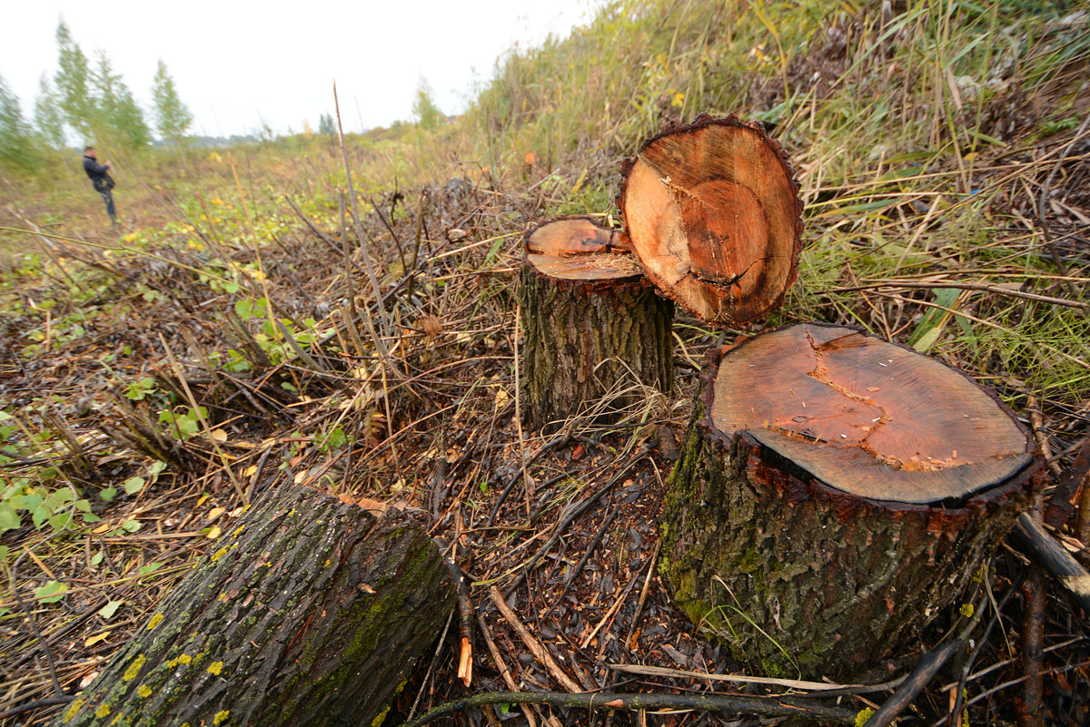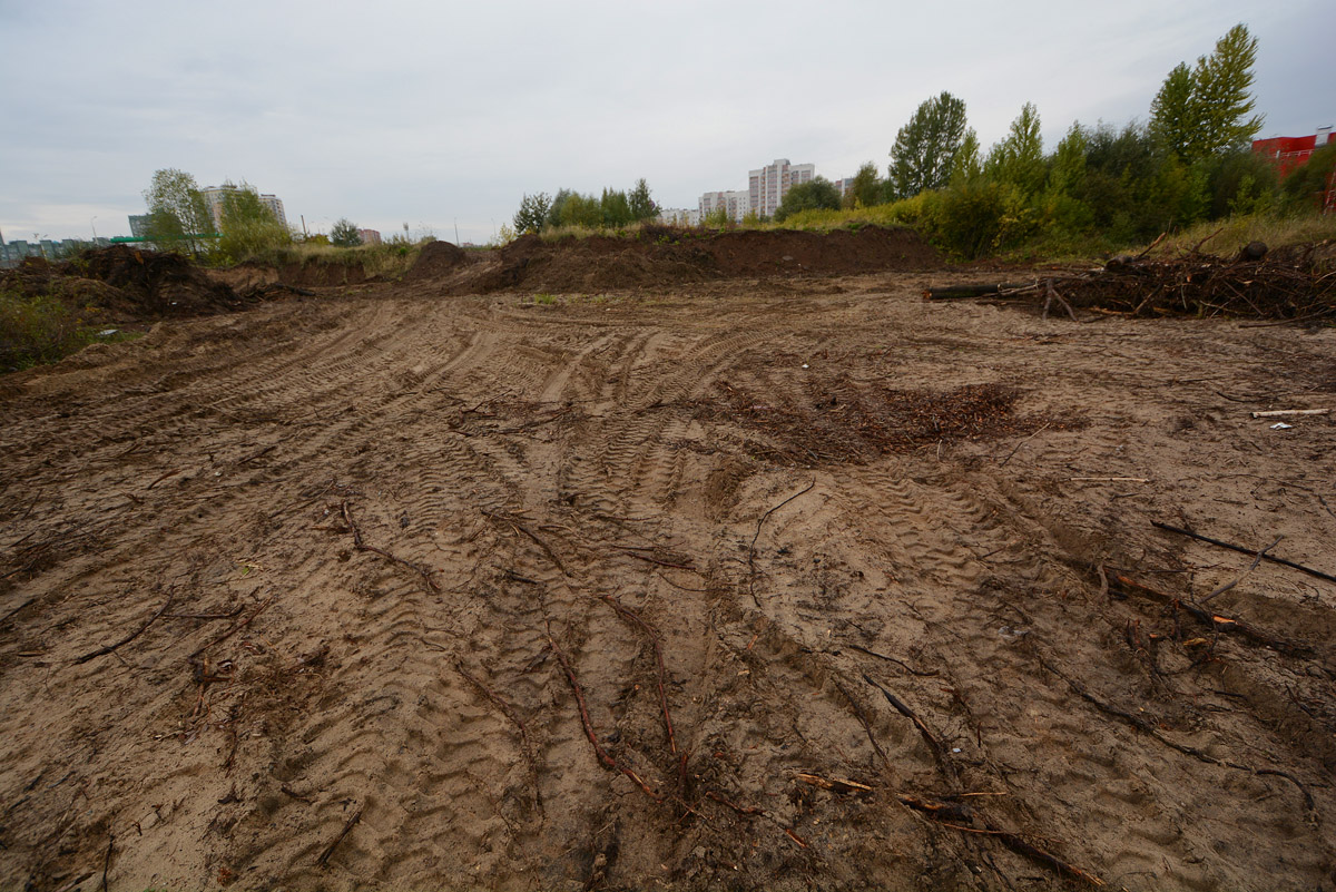 А вот какая картина предстала нам: пустырь, испещренный вмятинами от колёс тяжелой техники, курганы из выкорчеванных пней и поваленных стволов. Судя по всему, кустарники и молодняк попросту выкорчевывались строительной техникой, крупные деревья – валили бензопилами.