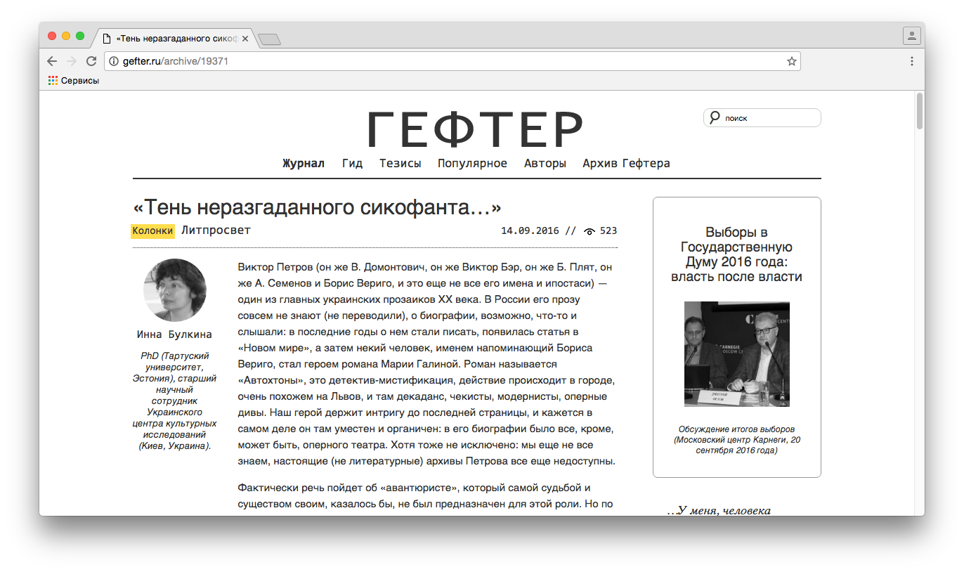 3. На «Гефтере» критик и издатель Инна Булкина рассказывает об одном из главных украинских прозаиков двадцатого столетия — Викторе Петрове, человеке со множеством псевдонимов (или, вернее, гетеронимов) и причудливой судьбой; самые удивительные события происходят с ним в 1940-е: достаточно сказать, что на оккупированной территории Украины он был двойным агентом — сотрудничал с немцами, но на самом деле с НКВД, оказался в Германии, а потом исчез в Мюнхене и невредимым появился в СССР, в то время как товарищи по эмиграции уже писали гневные стихи в адрес его предполагаемых убийц — бандеровцев. Помимо биографии, Булкина пишет и о произведениях Петрова, для которых, как и для его жизни, характерно двуличие, а то и многоликость протагониста, постоянное дробление субъекта; едва ли не советский вариант Билли Миллигана.