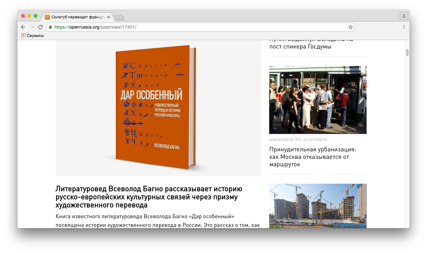 11. В «НЛО» скоро выйдет важная книга Всеволода Багно об истории русского художественного перевода. «Открытая Россия» печатает отрывок о том, как Федор Сологуб работал над стихами французских символистов — собственно, мы и сегодня читаем его переводы Верлена и Малларме. Багно пишет о духовном родстве Сологуба с Францией и французской литературой — такое обстоятельство для переводчика всегда оказывается счастливым — и объясняет, почему Сологуб и другие русские символисты из всех «проклятых поэтов» предпочитали Верлена: «Подобно младшим символистам Франции, русские символисты сознавали, что на поэтическую индивидуальность Рембо, намного опередившего свое время, трудно опираться в собственных литературных поисках, и поэтому отнеслись к его творчеству несколько сдержанно, хотя внешне вполне уважительно. Алхимические реторты, магические кристаллы и алгебраические формулы, в которые, согласно Волошину, Малларме замыкал свои идеи, настолько в целом отличались от тех задач, которые ставили перед собой русские символисты, что непререкаемость авторитета французского поэта заставляла заподозрить определенную внутреннюю отчужденность».