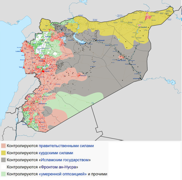 Карта военного конфликта в Сирии, сентябрь 2016. Источник: commons.wikimedia.org / Ermanarich Но план не сработал. Боевые действия прекратились, однако сирийское правительство продолжало блокировать поставки помощи на занимаемые повстанцами территории. 19 сентября сирийский режим отказался продлевать перемирие, мотивируя это тем, что повстанцы всё равно его не соблюдают. Еще одним сильным основанием к прекращению перемирия стал удар американской антитеррористической коалиции по сирийской армии, в результате которого погибли более 60 военных.