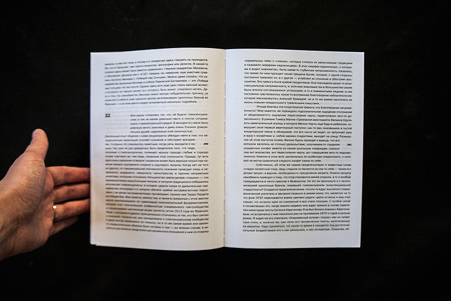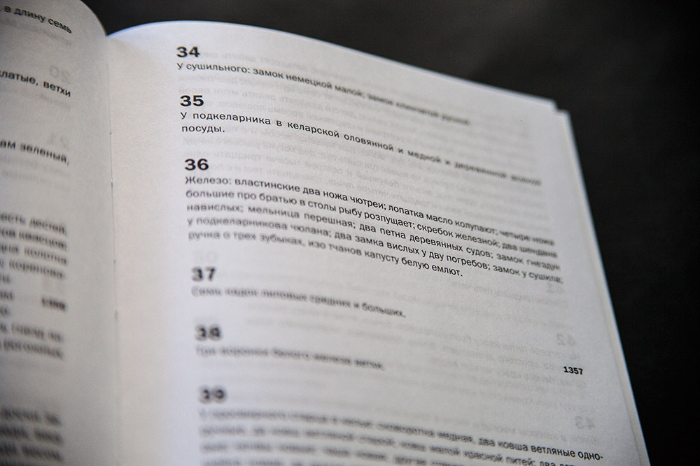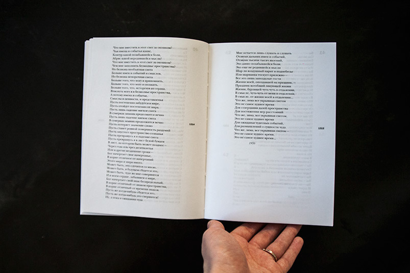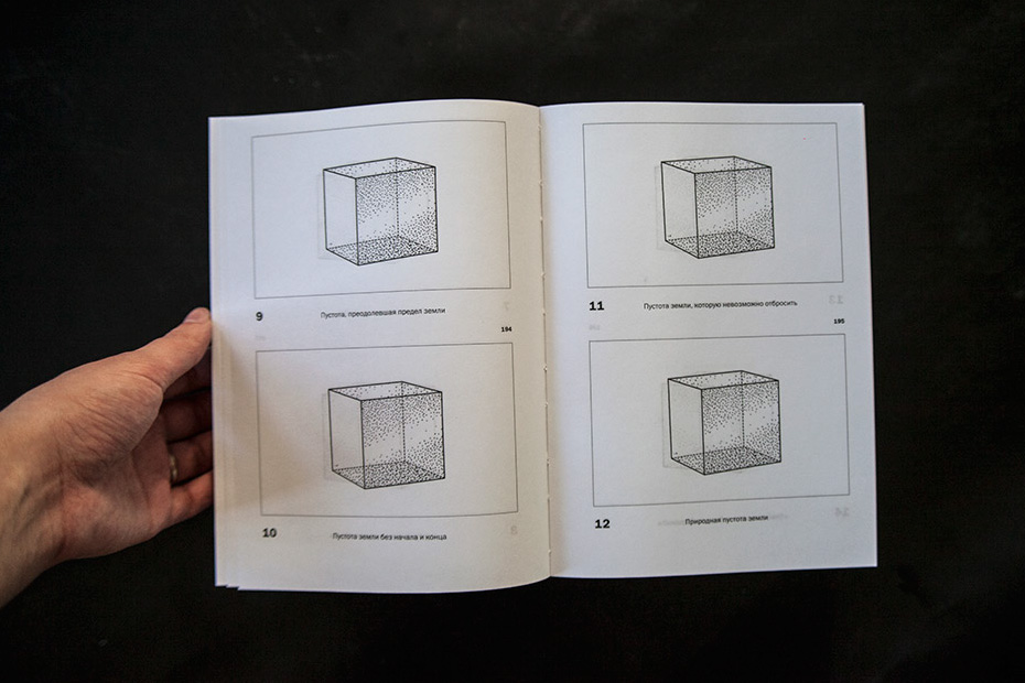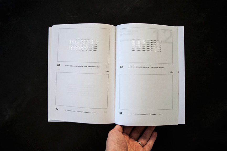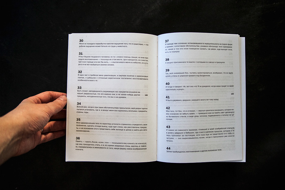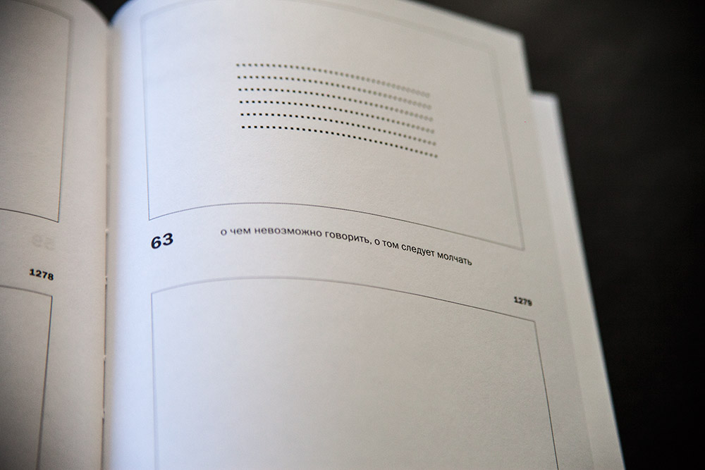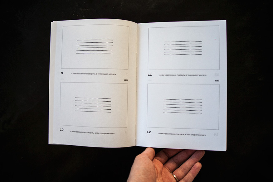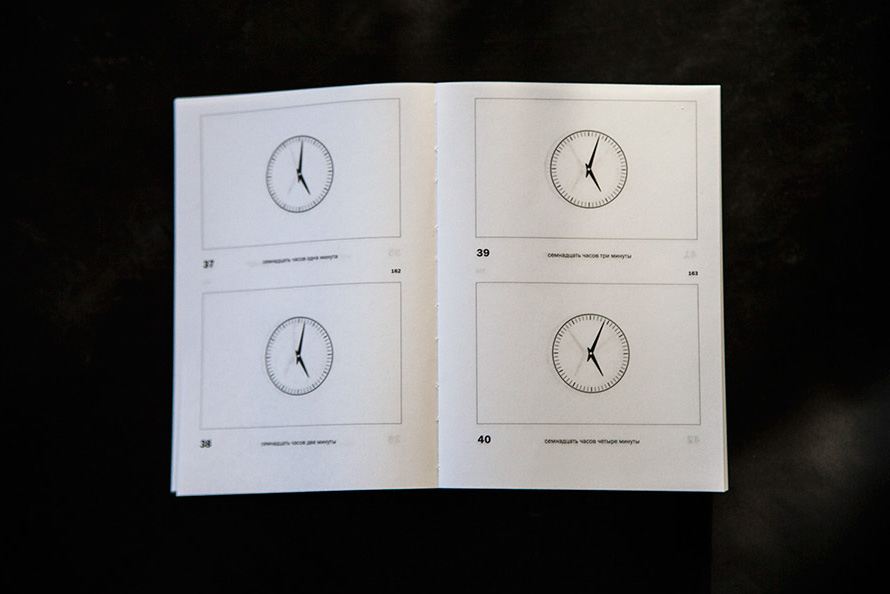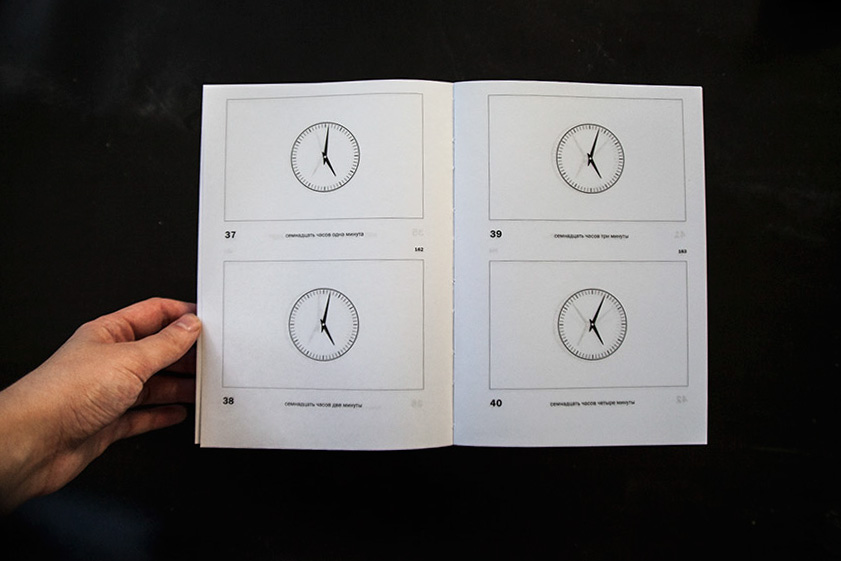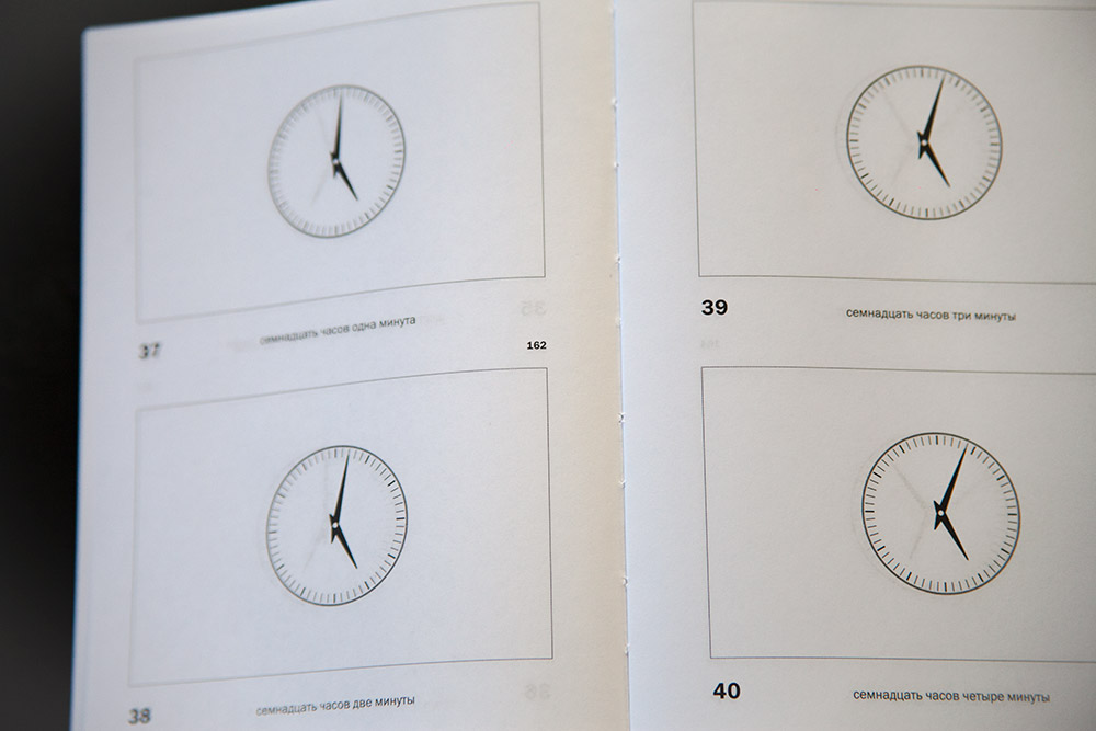 Вот, допустим, здесь на нескольких страницах подряд один и тот же текст в рамке или нарисованные циферблаты с подписями. Так вот, текст в рамке в какой-то момент начинает меняться, а подпись к циферблату перестает совпадать с временем на картинке. В читателе первым делом срабатывает инстинкт «не буду я это читать, подожду, пока что-нибудь другое появится». А если отнестись к этому как к упражнению и начать читать все подряд, ты в итоге задумаешься, почему и на какой странице произошло изменение, на какой цифре, — и в тебе тоже что-то начнет меняться. А в перерывах между этими практиками можно отдохнуть и почитать куски текстов, которые я между ними вставил: моих собственных, моих предков, моих друзей, Джойса, Пруста.