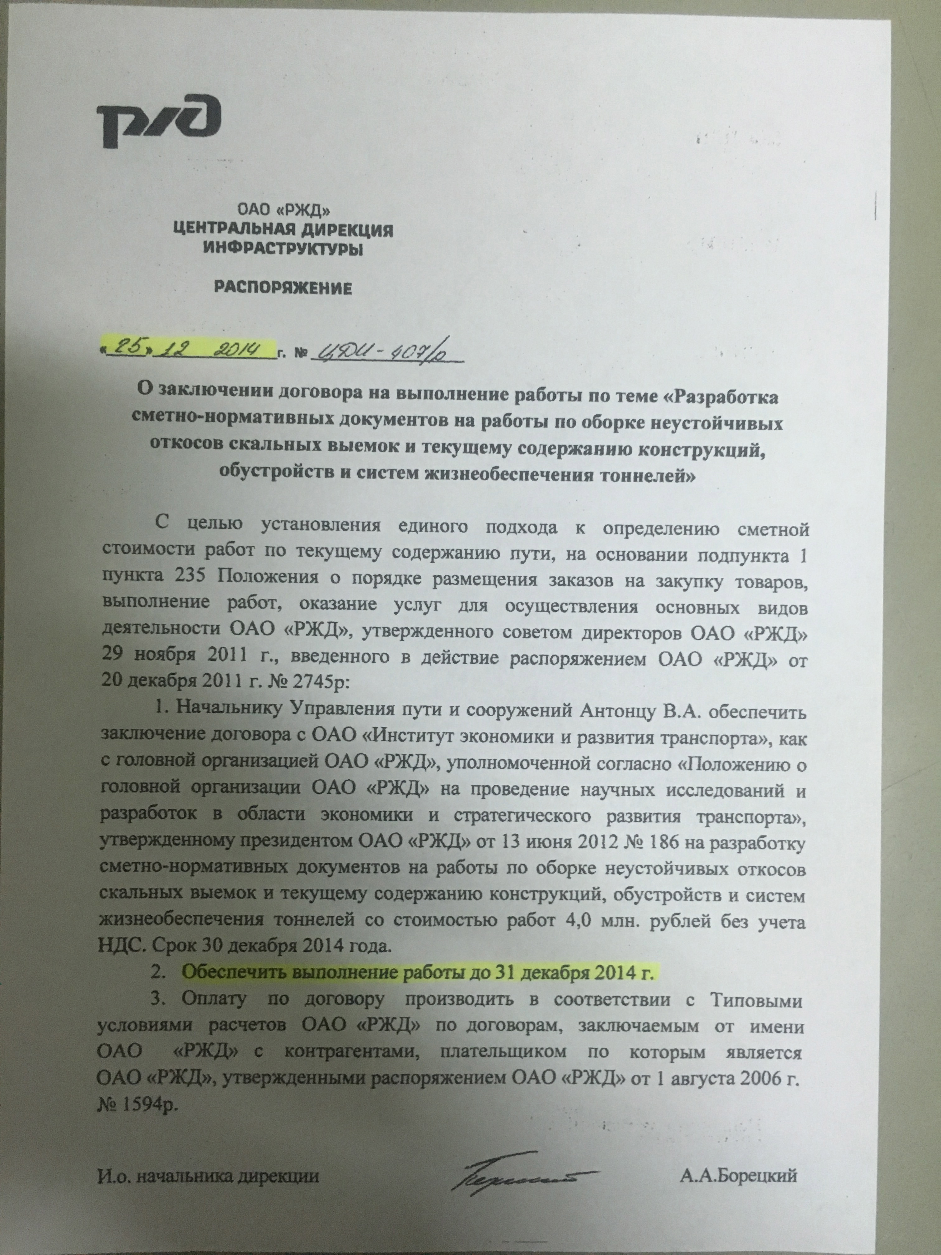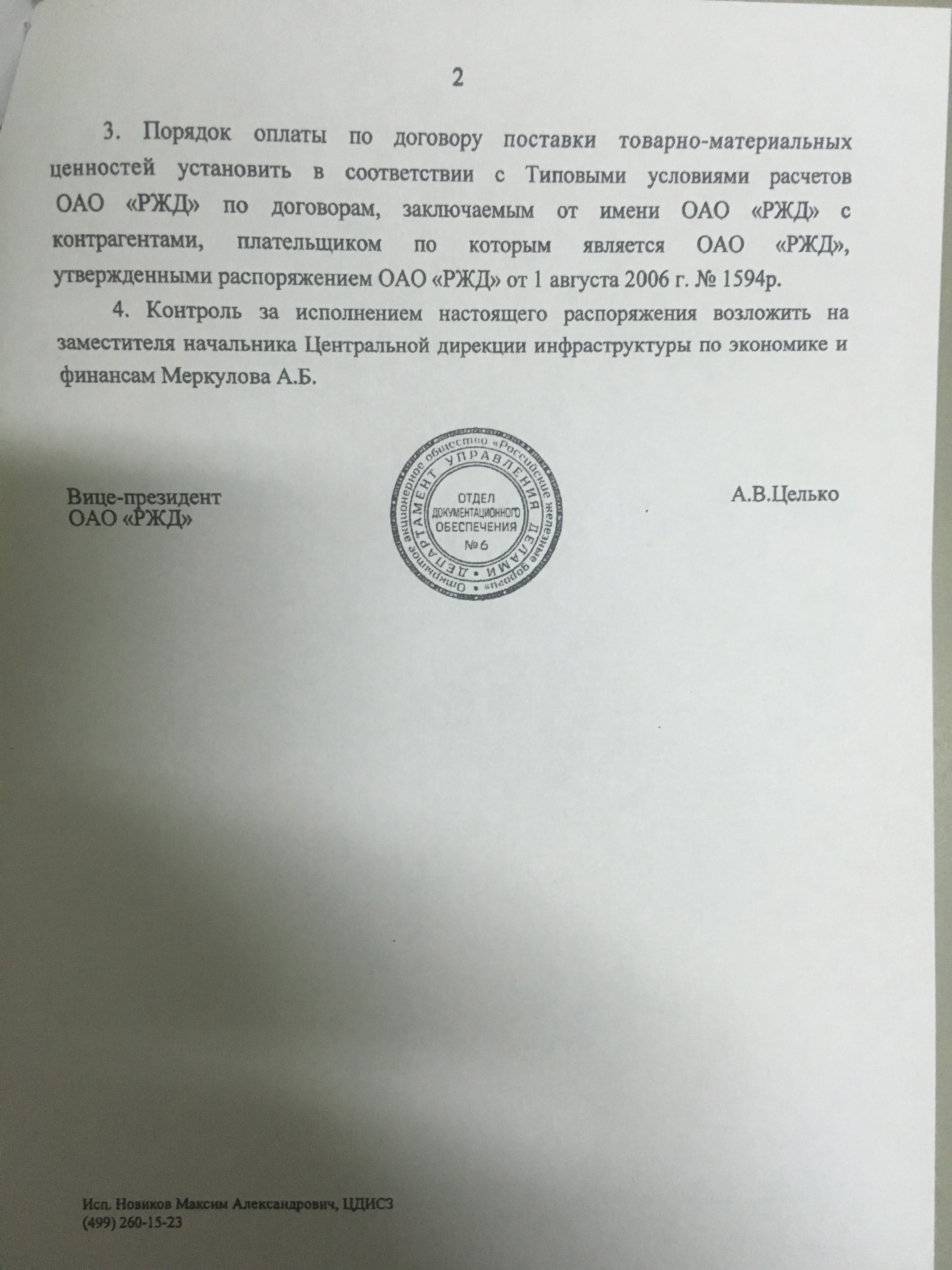 Распоряжение с фамилией, но без подписи вице-президента РЖД Александра Целько: