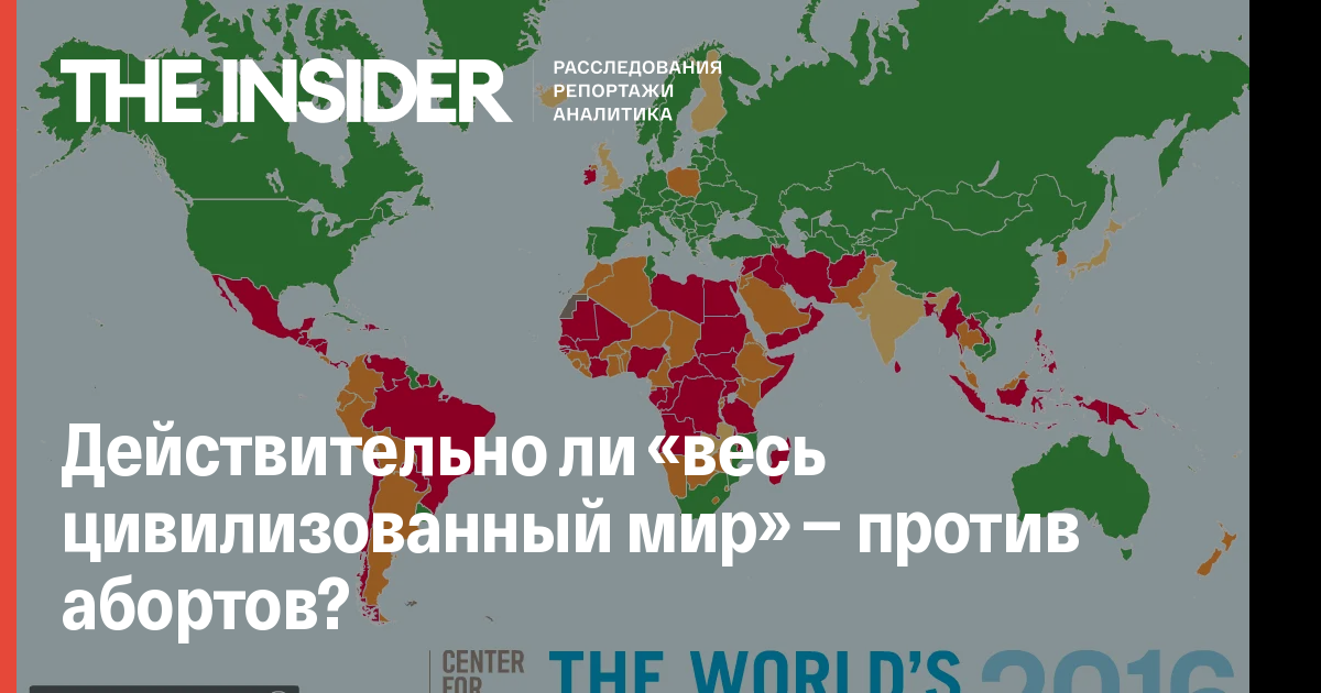 Уполномоченный по правам ребенка при президенте Анна Кузнецова заявила ТАСС о поддержке позиции Патриарха Кирилла, подписавшего петицию о запрете абортов на территории России. «Весь цивилизованный мир не первый год выступает против такого явления, как аборты, и мы поддерживаем эту позицию», — сказала, в частности, детский омбудсмен. The Insider решил проверить, насколько в мире распространен запрет на аборты (независимо от того, какие из стран относить к «цивилизованному миру»).