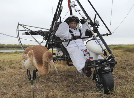 © Алексей Дружинин / РИА Новости Миграция. Владимир Путин, документация проекта. 2012 В одном из своих самых известных перформансов Путин выступил в роли вожака стаи мигрирующих сибирских белых стерхов. Управляя мотодельтапланом вместе с ассистентом, художник помог птицам найти наиболее удобный маршрут при перемещении на зимовку. Проблема миграции всегда была актуальна как для России, так и для Европейского полуострова. Художники разных стран предлагали свои варианты ее решения в зависимости от политической и эстетической традиции. В этом смысле случай Владимира Владимировича не является уникальным. Однако, как справедливо отмечают наблюдатели, только первому президенту Российской Космической Федерации удалось убедительно доказать, что без самоотверженной готовности к становлению Другим проблему миграции разрешить невозможно. Так, художнику несколько раз приходилось совершать опасные маневры на мотодельтаплане, в том числе лететь достаточно близко к птицам, что потенциально могло привести к катастрофе. «Приближение к границам человеческого, как и в целом к границам цивилизованного мира, всегда сопряжено с возрастанием опасности. Но эта опасность является следствием взаимного недоверия. Я еще раз подчеркну: мы всегда открыты к диалогу», — сказал президент на встрече с журналистами после завершения полета. Рассказывая о подготовке к своей акции, Путин упомянул перформанс Олега Кулика «Кулик — это все-таки птица», в рамках которого акционист со страховкой спрыгнул с высотного дома. «Но в то же время, — отметил президент, — формализму и простой жажде адреналина должно быть противопоставлено внимательное отношение к будущему Земли».