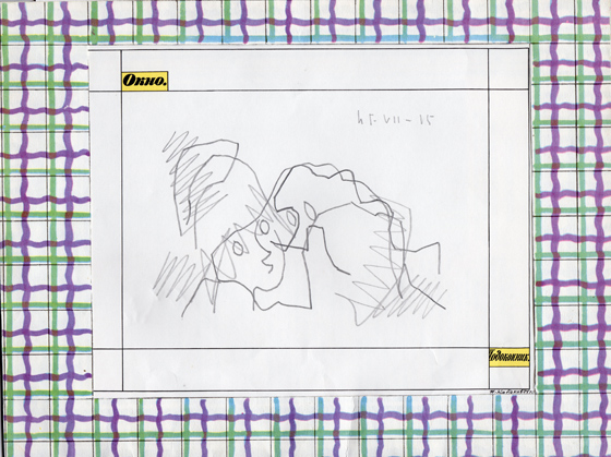 Тут, Как и Тут. Тамкович—Гинзбург, 2015 г. (рисунок на репродукции Ильи Кабакова в раме из детской книги), автоматическое письмо — А что с вами случилось после выставки, куда вы исчезли, вы работали?