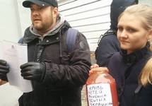В четверг на выставку явились Захаров с банкой "крови детей Донбасса, убитых украинской армией", а также неизвестные в камуфляже и "казаки" (