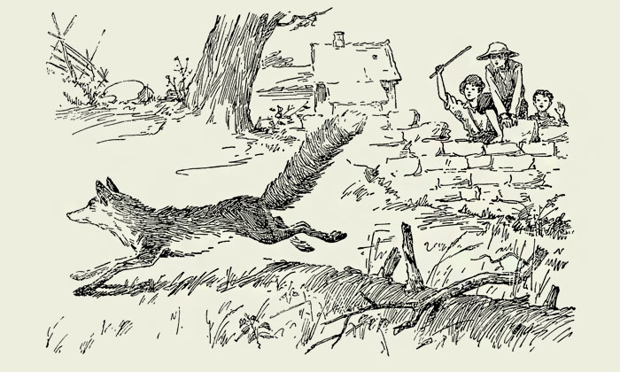 2. А теперь я расскажу тебе, как я впервые в жизни увидел лису. Однажды я отправился со своими маленькими братьями на участок в поле, принадлежавший нашей тетушке, где росли два огромных дуба и несколько фруктовых деревьев; мы должны были набрать там желудей, чтобы накормить ими поросенка. Хотя участок этот и находился недалеко от села, все же местность была пустынна, а для того чтобы попасть туда, надо было спуститься в долину. Только мы добрались до цели, вдруг видим: под деревом преспокойно сидит большущая лиса с великолепным пушистым хвостом, поднятым кверху как знамя. Она ничуть не испугалась нас, а наоборот, оскалила зубы; казалось, однако, что она не угрожает нам, а смеется. Мы страшно рассердились на лису за то, что она нас не боится, а она и в самом деле нас ничуть не боялась. Мы начали бросать в нее камни, но она только отодвигалась чуть в сторону и продолжала смотреть на нас насмешливо и совершенно спокойно. Тогда мы стали прикладывать палки к плечу, будто это ружья, и в один голос кричали: «Бум!» Но лиса только скалила зубы и не выказывала особого беспокойства. Вдруг где-то поблизости раздался настоящий выстрел. Только тогда лиса сделала прыжок в сторону и пустилась бежать. Я как сейчас вижу ее — ярко-рыжую, молнией промелькнувшую по каменной ограде, — вижу, как она бежит дальше все еще с поднятым кверху хвостом и исчезает затем в лесной чаще…