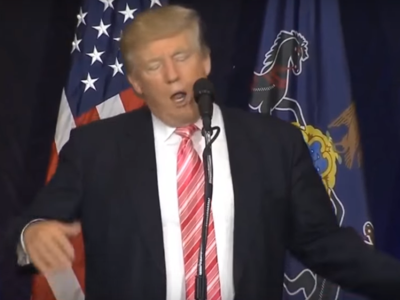 «Это женщина, которая по идее должна бороться с разными вещами, и она не может пройти 15 футов до своего автомобиля», — начал Трамп. Потом он отошел от микрофона и сделал несколько шагов, сгорбившись как старуха. Так миллиардер припомнил Клинтон случай, когда ее вели до автомобиля.