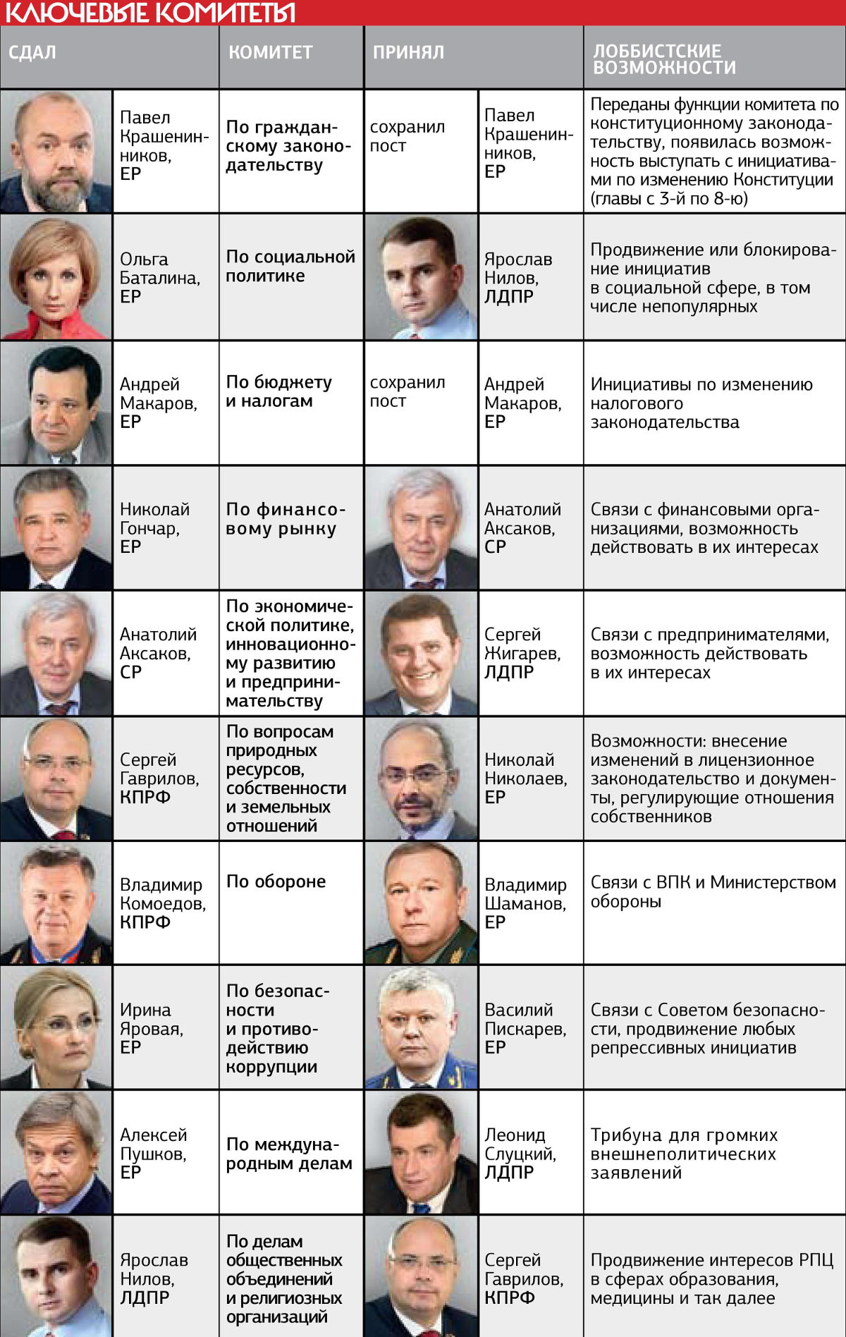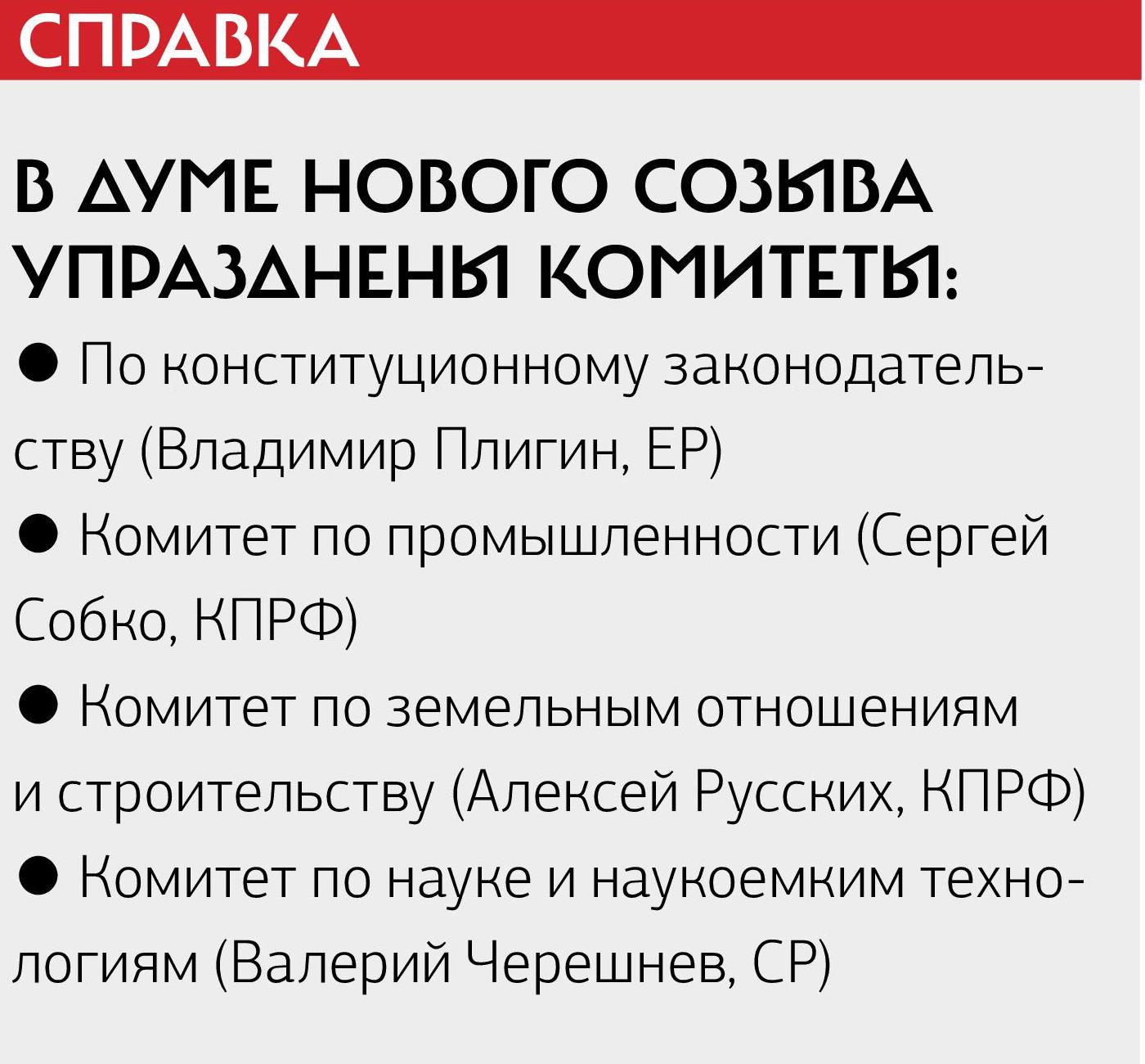 Не меньшую ротацию претерпело и руководство думских комитетов. Половину из них (13 из 26) единороссы передали другим думским фракциям, несмотря на то что сами получили 343 из 450 возможных кресел в парламенте. При этом количество комитетов, по сравнению с прежним созывом, было сокращено на 4. Под секвестр, в частности, попал комитет по конституционному законодательству единоросса Владимира Плигина, которому места в новом созыве парламента вообще не нашлось. Новую объединенную структуру (конституционное законодательство объединили с уголовным и гражданским) возглавил единоросс Павел Крашенинников, выходец из СПС. Кстати, обсуждалось, что комитет могла бы возглавить Ирина Яровая, однако ей в итоге предоставили более высокую, но менее влиятельную должность.
