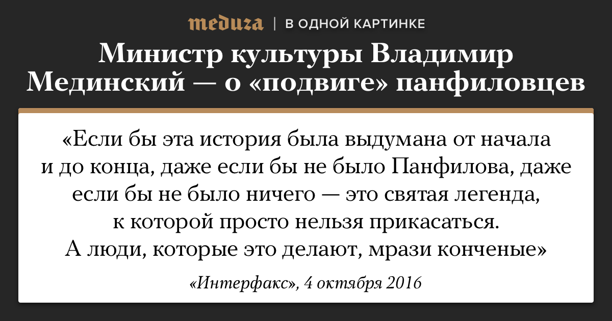 Фото в анонсе: Валерий Шарифулин / ТАСС / Scanpix / LETA Министр культуры и председатель Российского военно-исторического общества Владимир Мединский активно поддерживает фильм «28 панфиловцев», который выходит в ноябре 2016 года. Фильм рассказывает о подвиге бойцов, участвовавших в обороне Москвы в 1941 году. Государственный архив РФ убедительно показал, что «подвиг панфиловцев» — не более чем пропагандистский миф.