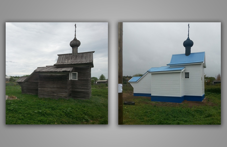 На фотографиях часовня Николая Чудотворца 1728 года постройки преобразилась за лето 2016 года. Еще в мае она выглядела как образец русского северного деревянного зодчества, а к 22 сентября была уже покрыта современным материалом. По данным издания ruposters.ru, «реставрацию» старинной часовни провели на средства местной жительницы, она выделила на это 100 тысяч рублей. Чтобы покрыть стены сайдингом, рабочие повредили стены здания — в них забили крепления для современного материала. Также рабочие выбросили и сожгли слои бересты из-под крыши часовни. Строение является охраняемым государством объектом культурного наследия регионального значения, табличку об этом «реставраторы» аккуратно прикрепили поверх слоя сайдинга.