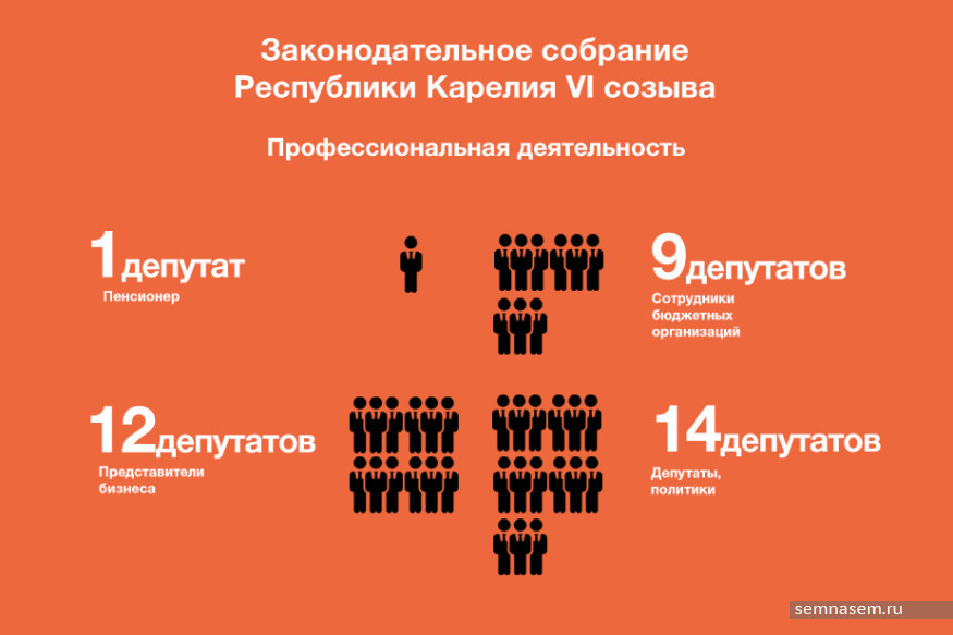 В составе заксобрания сформировано пять фракций. В «Единой России», самой многочисленной, работает единственный депутат без высшего образования — рыбный магнат Игорь Зубарев. Однопартийцы выдвинули его на пост сенатора от законодательной власти Карелии. В этой же фракции пока работает и самый богатый депутат регионального парламента. «Пока» — потому что это все тот же Игорь Зубарев, который вскоре сдаст свой депутатский мандат и перейдет работать в Совет Федерации России. Один из единороссов, Николай Зайков, стал самым «опытным» депутатом в составе заксобрания: он избрался уже в пятый раз, пропустив только первый созыв.