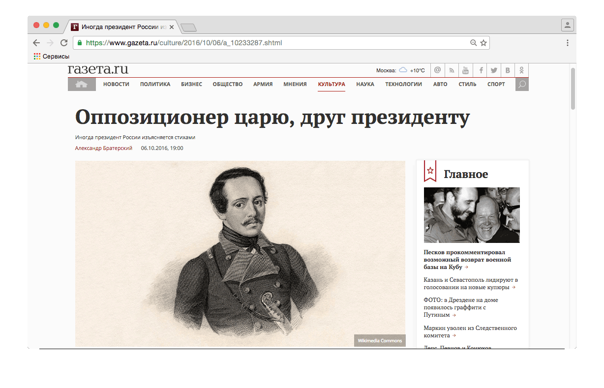 3. Колумнист и политобозреватель Александр Братерский задается вопросом о том, почему Путин так часто цитирует Лермонтова. Судя по всему, в личном путинском рейтинге любимых поэтов Лермонтов сместил Омара Хайяма. «Лермонтов — для того, чтоб подумать о чем-то, отвлечься и вообще попасть в другой мир — полезный, красивый и интересный», — считает президент (с тем же успехом это можно было бы сказать, например, о Толкине). Более того, именно Лермонтов пришелся к слову, когда Путин решил разъяснить разницу между «оппозиционерами» и «национал-предателями». Тут так и тянет в который раз пуститься в рассуждения о русской классике как единственном культурном коде, который объединяет Путина, скажем, с Дмитрием Быковым, тоже опиравшимся в «Гражданине поэте» на произведения из школьной программы. Из этой же статьи Братерского узнаем кое-что о предпочтениях в поэзии Петра Порошенко и Дилмы Руссефф. А вот у Обамы, как пишет американская пресса, любимый поэт — нобелевский лауреат Дерек Уолкотт.