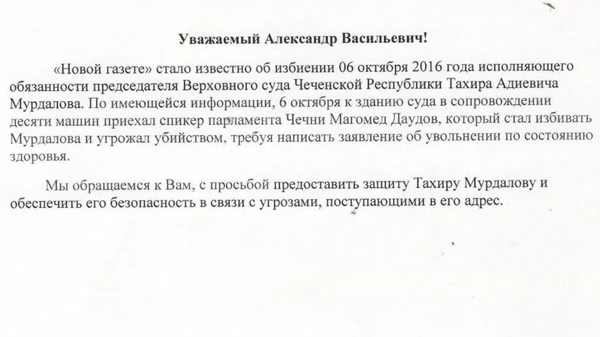 Портал «Кавказ.Реалии» со ссылкой на неназванные источники сообщил об избиении исполняющего обязанности председателя Верховного суда Чечни Тахира Мурдалова.