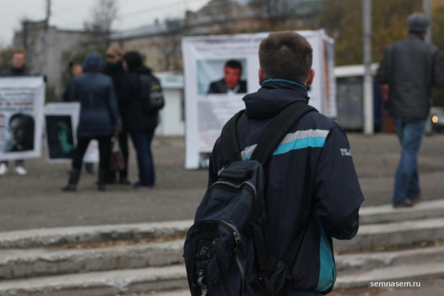 Оживленный перекресток улиц Карла Маркса и Воровского в центре Кирова, 15:50, начинает смеркаться. Несколько мужчин разворачивают баннеры с фотографиями Анны Политковской и Бориса Немцова и крепят их на металлический каркас. Недалеко от них стоят двое полицейских, они смотрят на происходящее и выглядят весьма благодушно. Больше за активистами почти никто не наблюдает — рядом только несколько видеооператоров и мужчина в коричневом плаще и шапке с прикрепленным к ней значком.