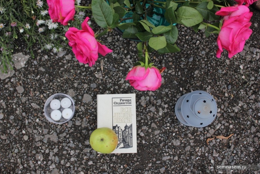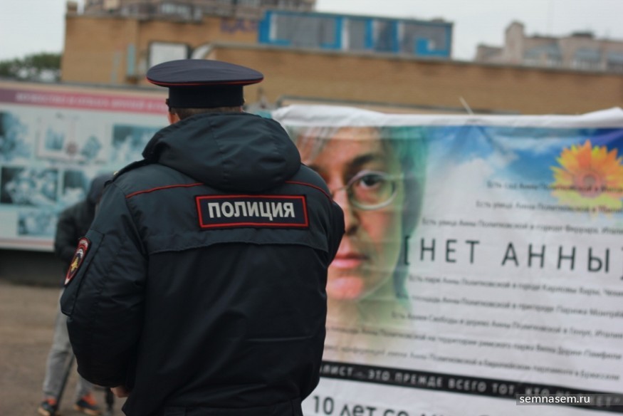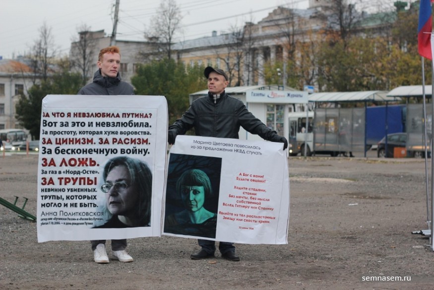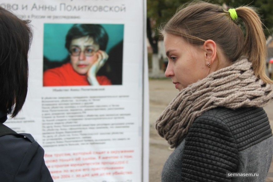 Акция назначена на 16:00, но организаторы явно не успевают. За несколько минут до начала к месту подбегает председатель регионального отделения ПАРАНСа Вадим Ананьин. У него в руках пышный букет цветов, он кладет его на землю у куба с баннерами и начинает быстро организовывать пространство. Цветы ставят в обрезанные пластиковые бутылки, полукругом расставляют свечи, мужчина в шапке со значком кладет в центр книгу Ричарда Олдингтона «Все люди — враги», а поверх нее — крупное зеленое яблоко. Появляется еще несколько плакатов: на них снова Политковская, портрет Марины Цветаевой с упоминанием, что она повесилась после предложения НКВД делать доносы, и ее стихи «А Бог с вами!».