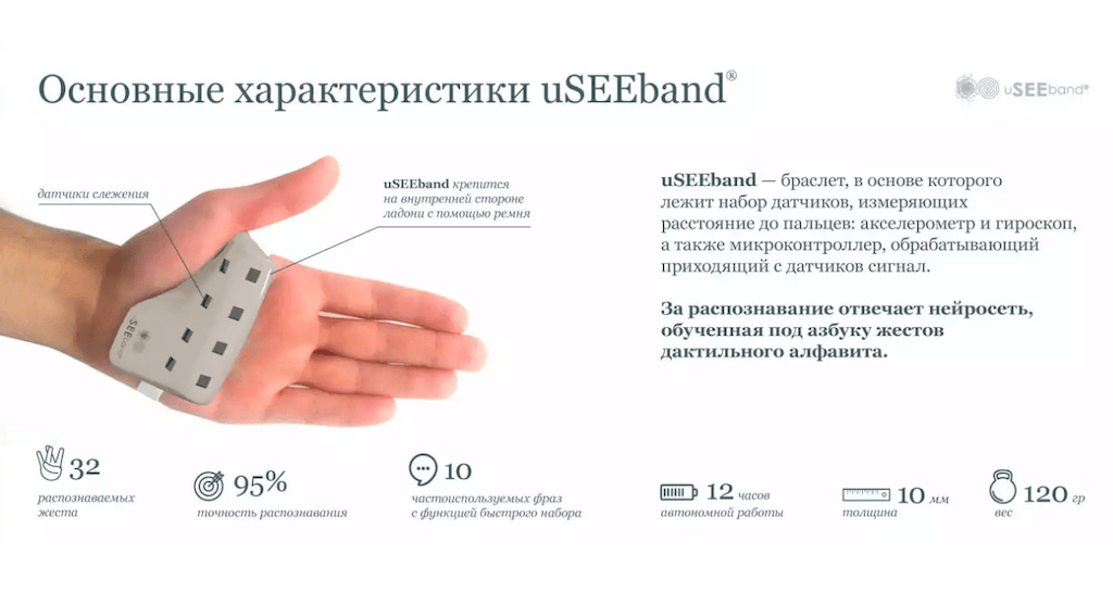 Надетый на руку браслет uSEEband переводит систему жестов дактильного алфавита в текст и отображает его на смартфоне или планшете в режиме реального времени.