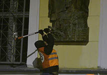 Однако после нескольких ударов на доске остались только небольшие засечки, серьезного урона ей нанесено не было. Участники акции бросили на месте топор и стремянку и скрылись.
