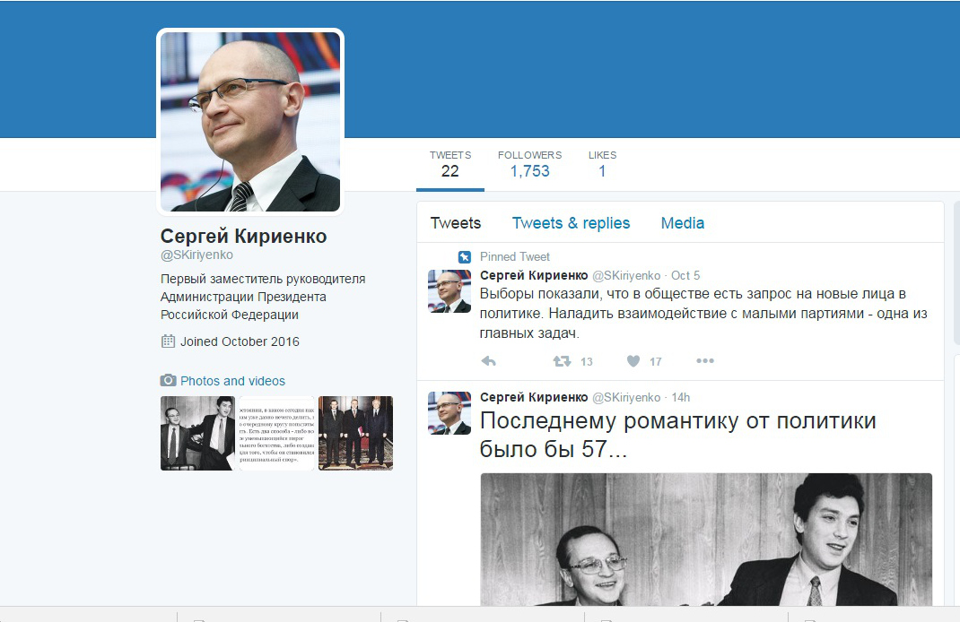 Сергей Кириенко. Фото: kremlin.ru Вскоре после того, как официально была подтверждена информация о назначении Сергея Кириенко заместителем руководителя Администрации президента России, в сервисе микроблогов Twitter появился аккаунт с его именем.