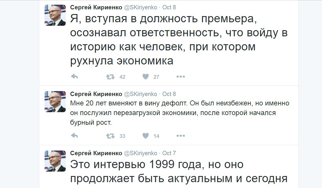 Твиттер Сергея Кириенко А второе, что нужно отметить в этой же связи, – это что пишет в этом твиттере. Кстати, у меня есть подозрение: а может, твиттер пишет сам, а Сергей Владиленович ничего об этом не знает, и мы ему сейчас расскажем, а он внесет некоторые коррективы. В частности, тот твитт, который произвел на меня большой впечатление, посвящен разбору его роли в дефолте 1998 года.