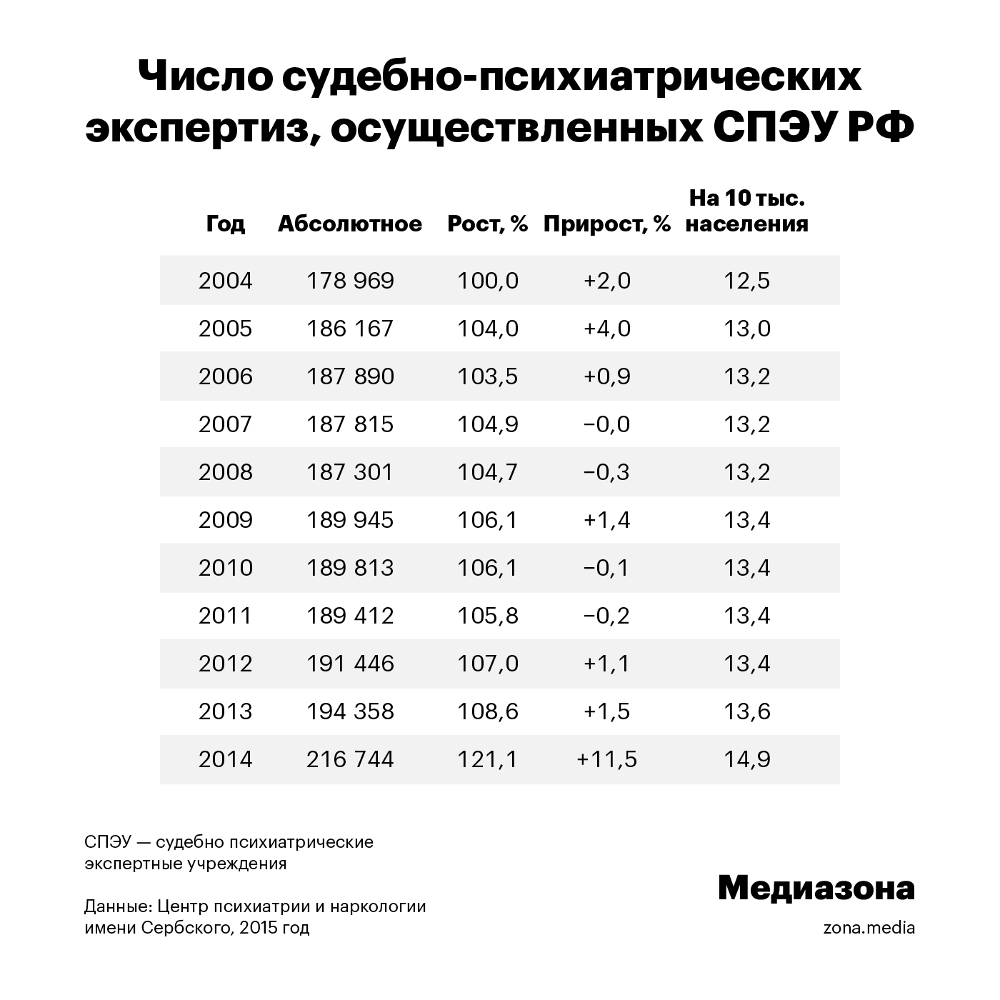 Кроме того, данные сильно различаются по регионам. К примеру, по данным Центра им. Сербского, в 2014 году в среднем по России из лиц, подвергнутых судебно-психиатрической экспертизе в итоге было признано невменяемым 6,6%. При этом, во Владимирской области — 16%, в Свердловской области — 16,6%, а в Дагестане — 22,6%. Столь значительный разброс может свидетельствовать о разных подходах и разных уровнях взаимодействия следствия и суда с одной стороны и психиатров — с другой.
