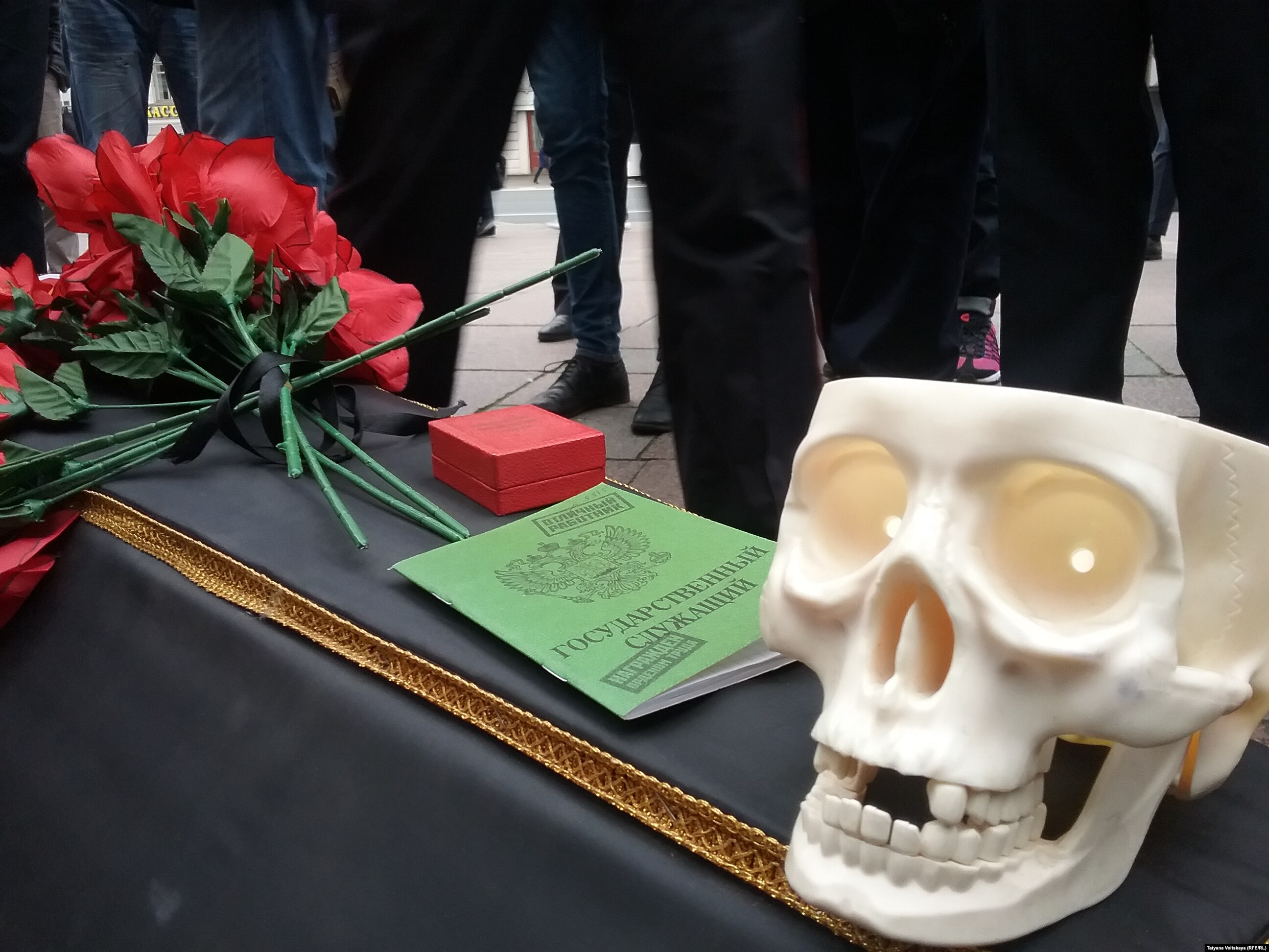 Проведению акции помешали сотрудники полиции, однако после того, как они задержали второго организатора – Алексея Назарова, акция продолжилась. На гроб возложили букет красных матерчатых маков, пластмассовый череп, "трудовую книжку" и "медаль усопшего". Была произнесена надгробная речь, основной смыл которой состоял в том, что в таком гробу может оказаться сослуживец или знакомый любого человека, не подозревающего, как тяжело приходилось его знакомому, не имевшему возможности жить открыто, ничего о себе не скрывая.