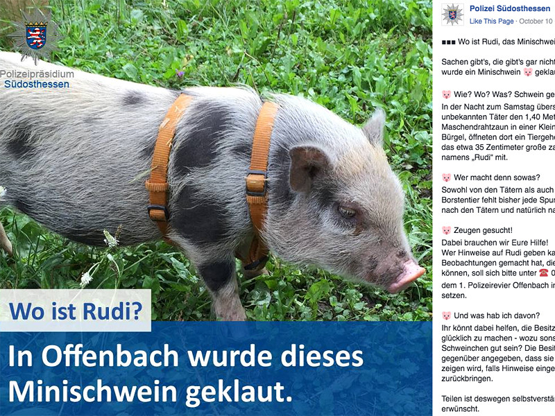 Полиция Оффенбаха опубликовала в Facebook отчаянный вопль о помощи. В минувшие выходные в городке Бюргель до сих пор не установленный преступник перелез через почти полутораметровый забор, открыл загон и похитил 35-сантиметрового домашнего поросенка по имени Руди.