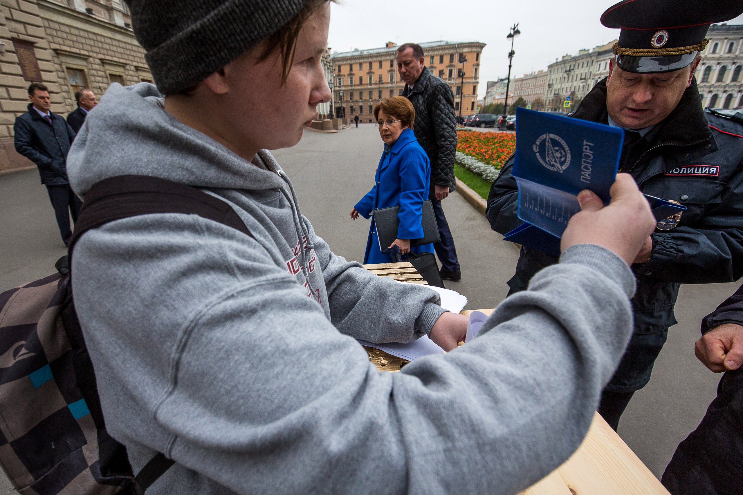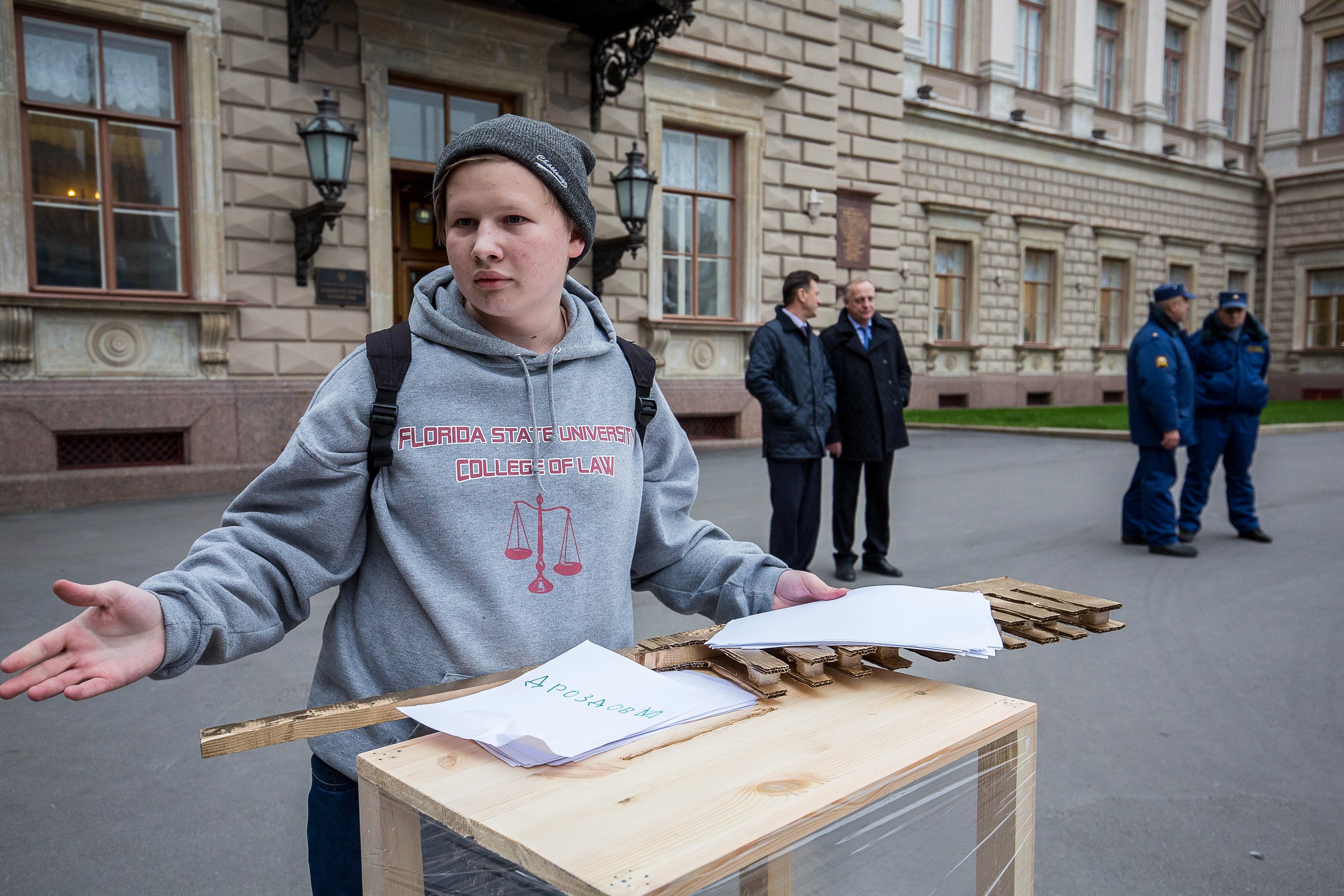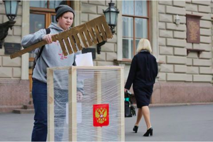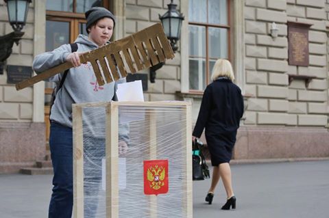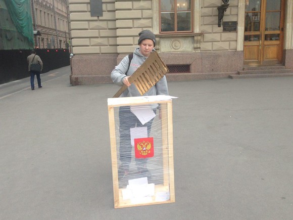 Активист движения «Весна» вышел к Мариинскому дворцу с урной для бюллетеней и большой расческой. Акция посвящена вице-спикеру Закса Анатолию Дроздову, получившего прозвище «Расческа» за попытку пропихнуть бюллетени для голосования в урну с помощью расчески на выборах в 2011 году.