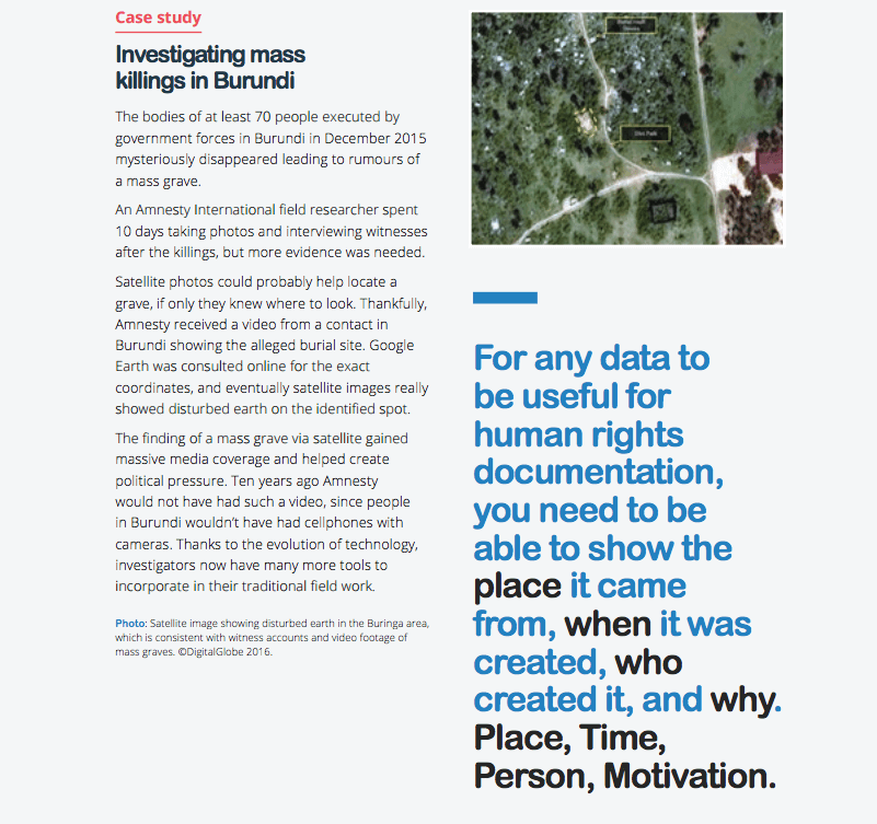 Над ним работали 70 специалистов из 40 международных правозащитных организаций. Цель руководства – помочь журналистам и правозащитникам использовать в своих расследованиях фото, видео, открытые бюджетные данные, онлайн-архивы, спутниковые снимки.