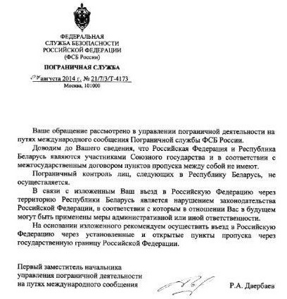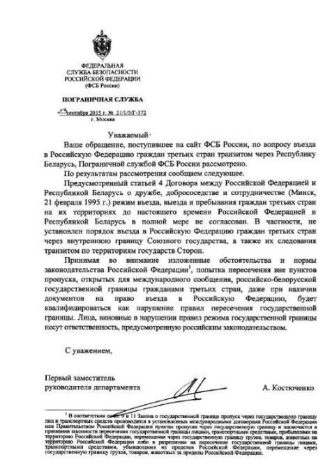 В другом ответе Погранслужбы ФСБ, опубликованном на том же форуме и датированном осенью 2015 года, ведомство признает, что вопросы пересечения российско-белорусской границы гражданами третьих стран "в полной мере не согласованы":