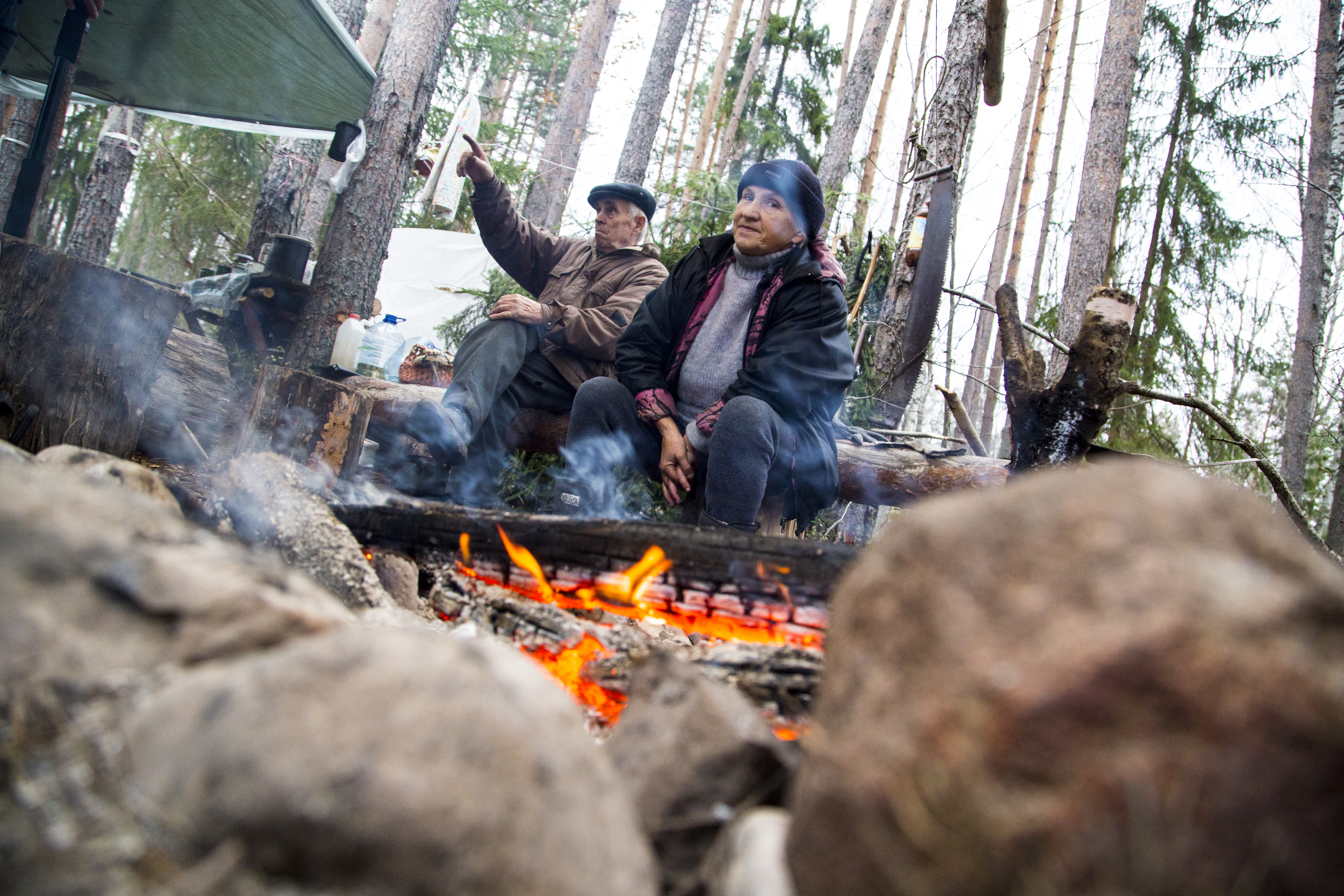 Называют их "сунскими партизанами". Старики из карельской деревни Суна, чья жизнь всегда была связана с собирательством и охотой, разбили в лесной чаще лагерь и круглосуточно отражают атаки работников компании "Сатурн Нордстрой", которая намерена разрабатывать в бору песчано-гравийный карьер.