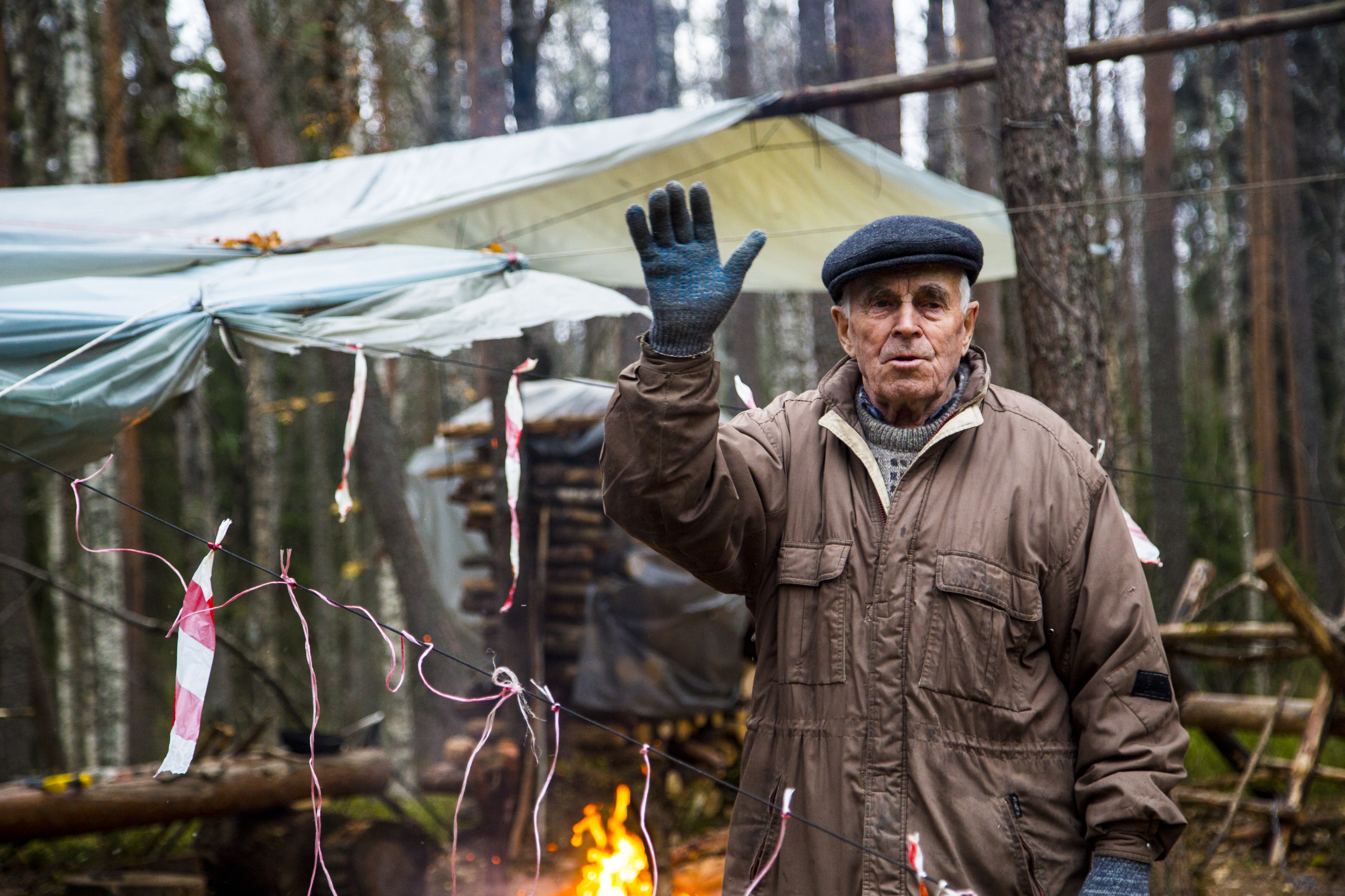 Василий Дийков ночует в палатке и готовит пищу на костре. Один из главных защитников Сунского леса этой зимой собирается отпраздновать свое 80-летие. Вполне возможно, что отмечать юбилей придется на лесной делянке. Сейчас Дийков бросил все домашние дела, чтобы избавить свой лес от вооруженных пилами людей.
